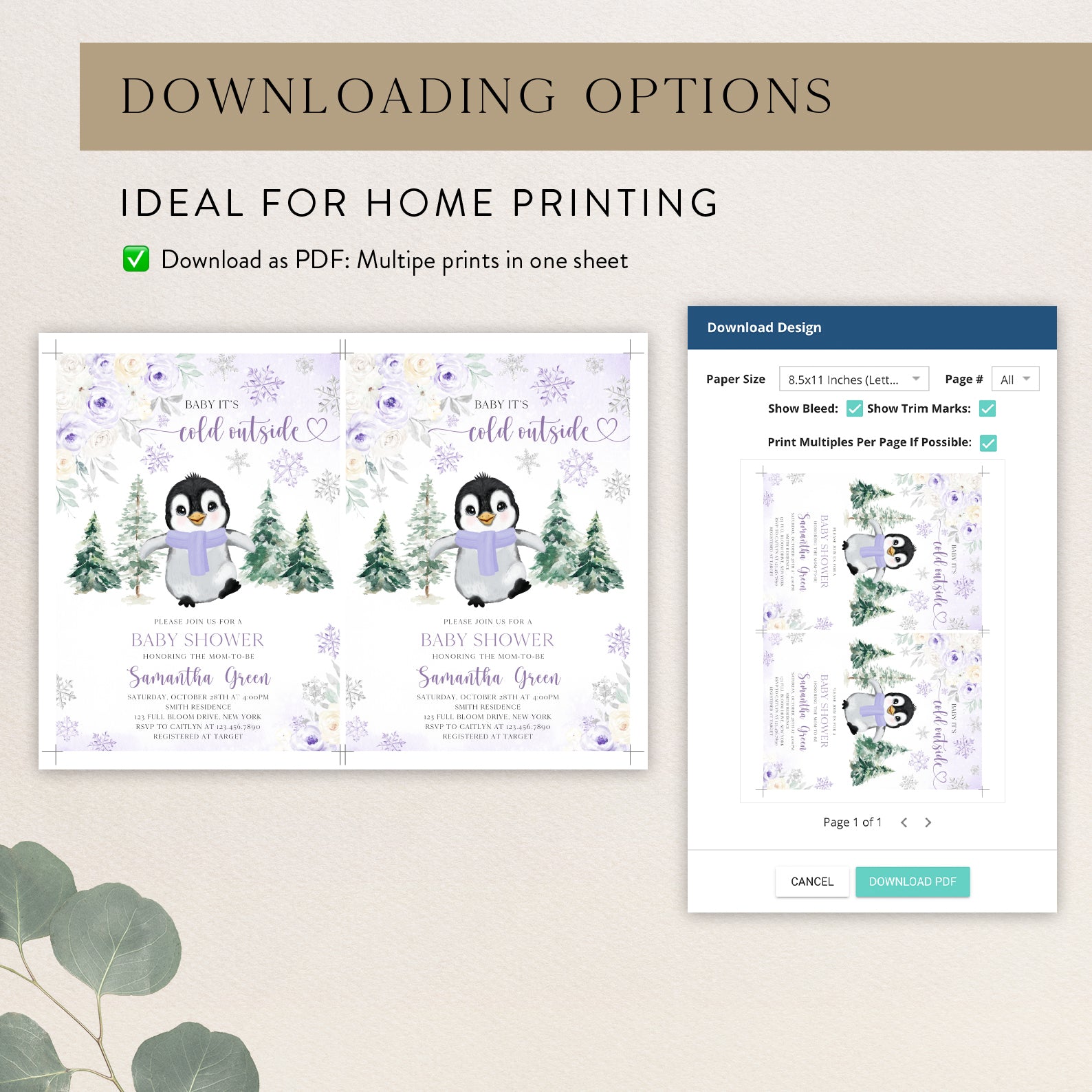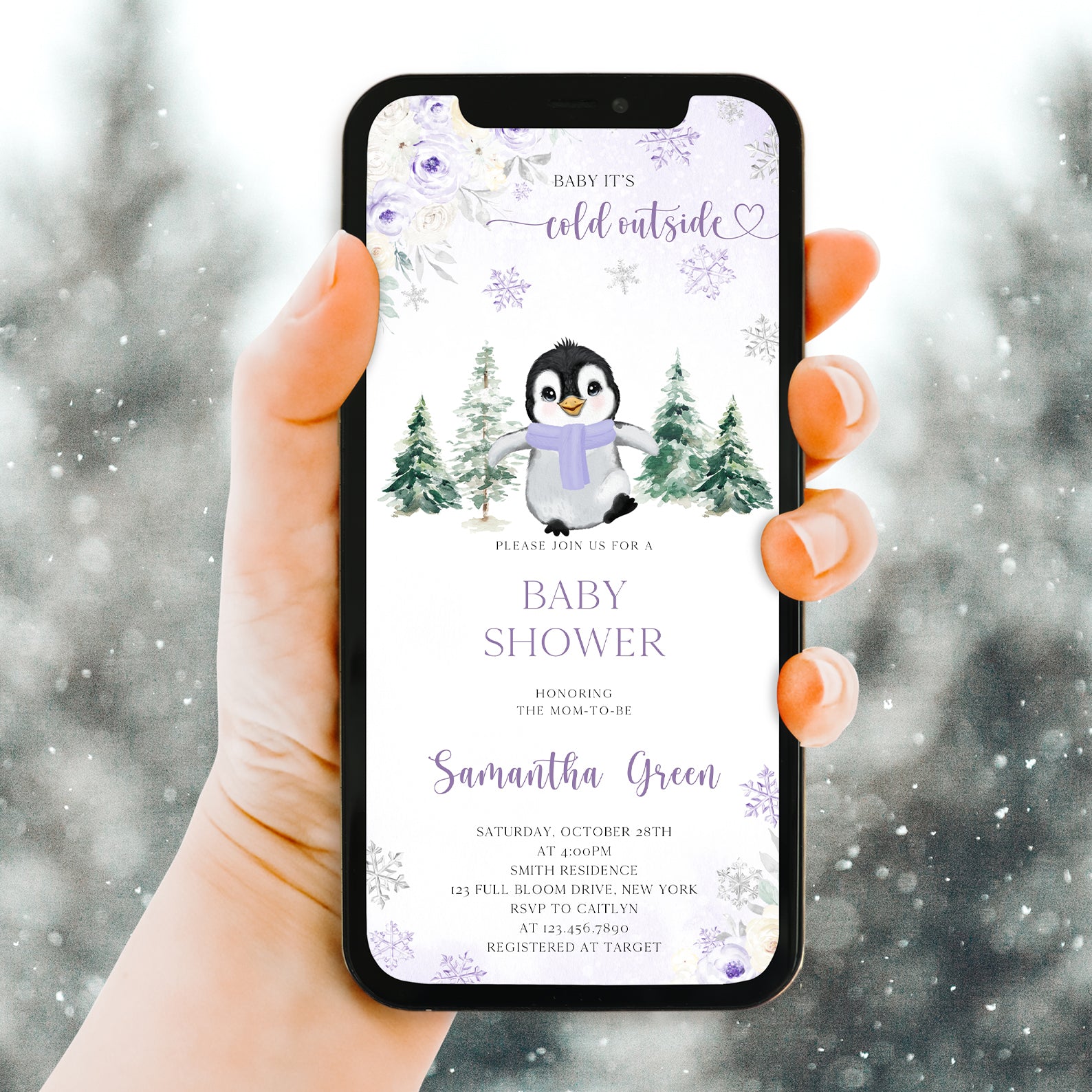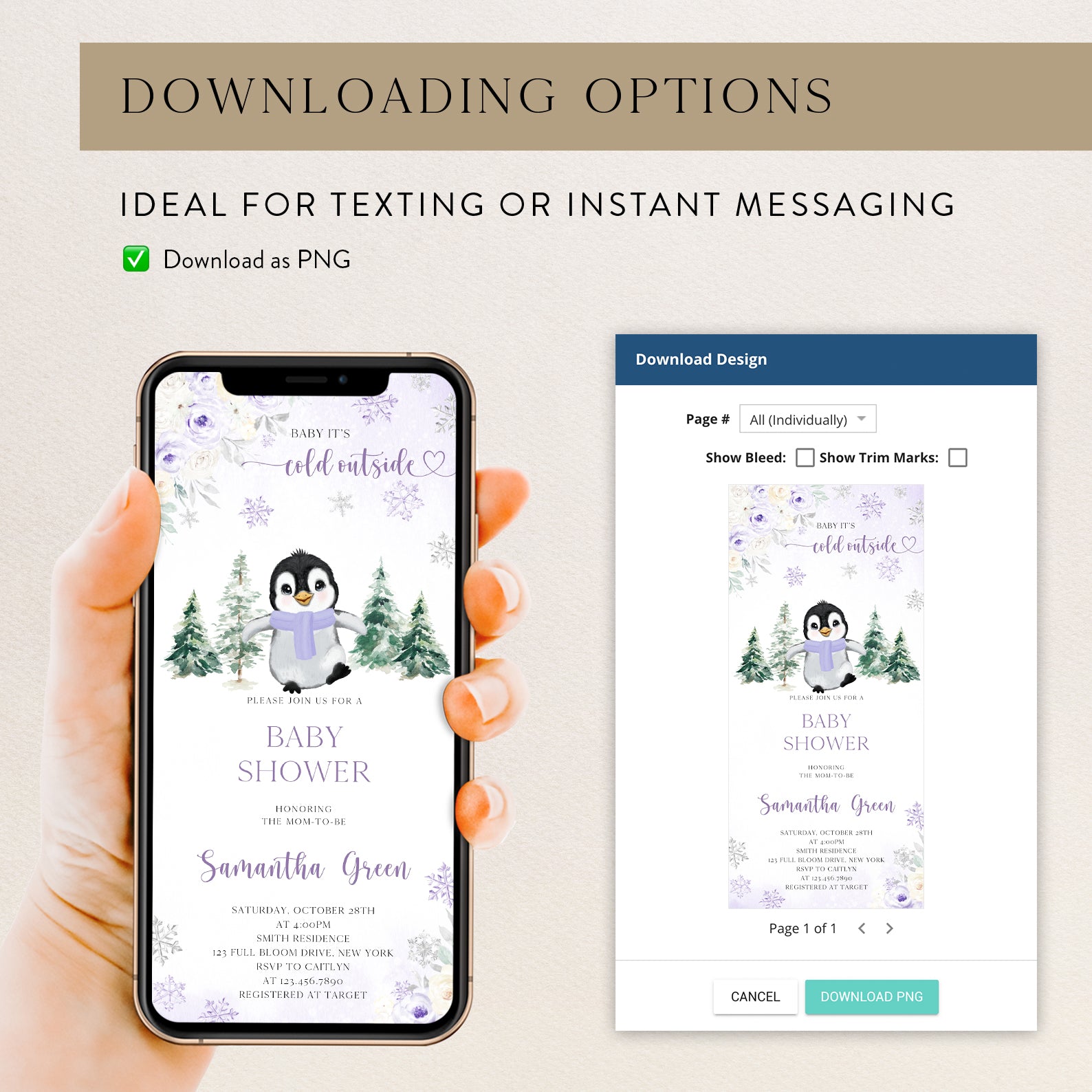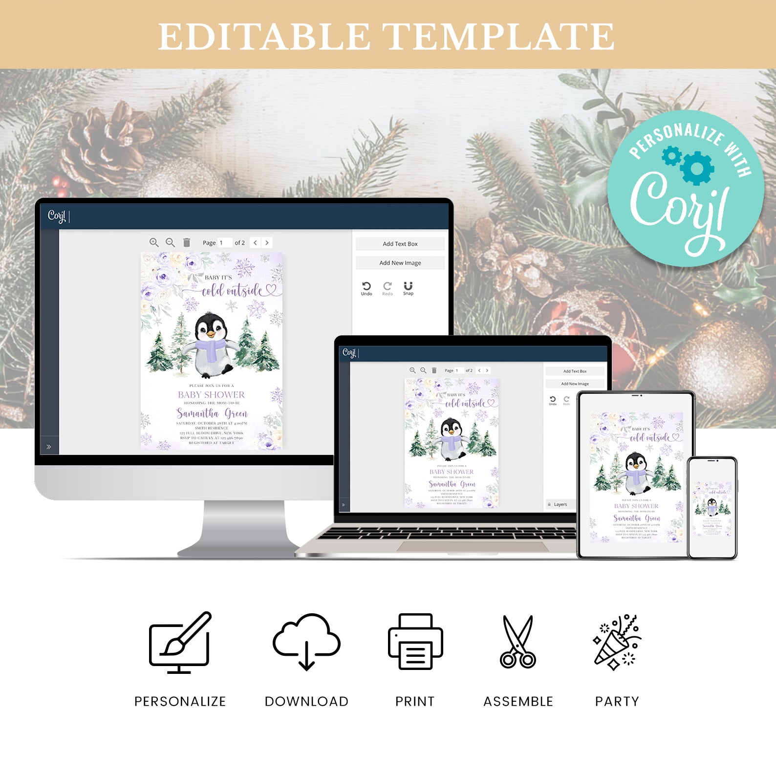 1. Purchase this Penguin Baby It's Cold Outside: Winter Baby Shower Purple Invite Bundle template
