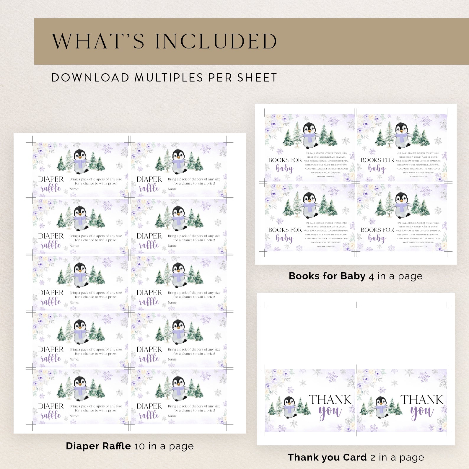 Welcome your little one with our "Baby It's Cold Outside" winter baby shower bundle! This set includes a digital invitation, mobile invite, diaper raffle, books for baby card, and thank you card. Featuring a cute baby penguin in a scarf, with a floral border and snowflakes in silver, blue, pink, or purple, it’s perfect for inviting loved ones to your festive winter celebration.