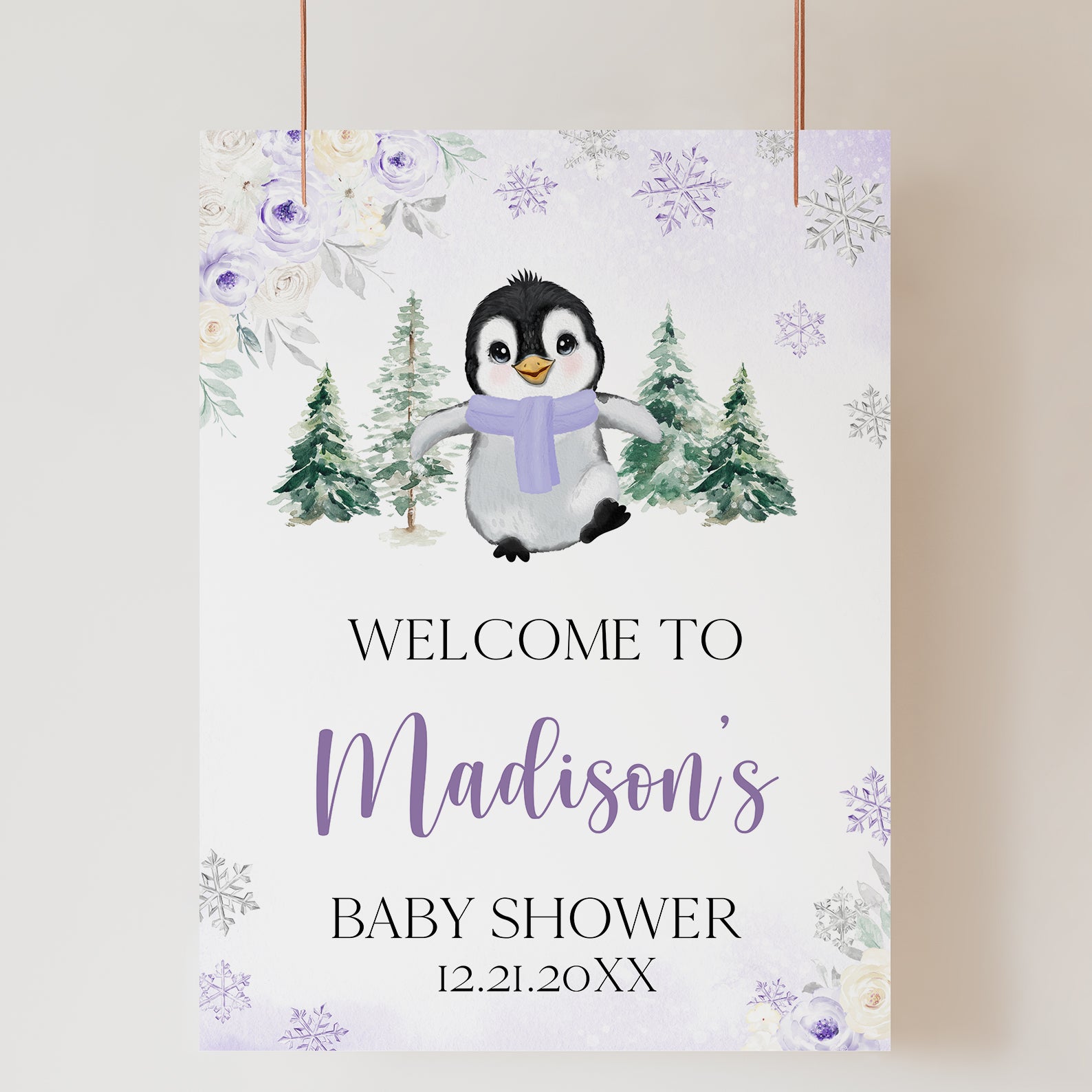 Greet your guests with our "Baby It's Cold Outside" winter baby shower welcome sign! Featuring a charming baby penguin in a scarf, surrounded by snowflakes and set against a backdrop of snow-covered pine trees, this sign adds a delightful touch to your event. Available in silver, blue, pink or purple , it’s a warm and festive way to welcome your loved ones.