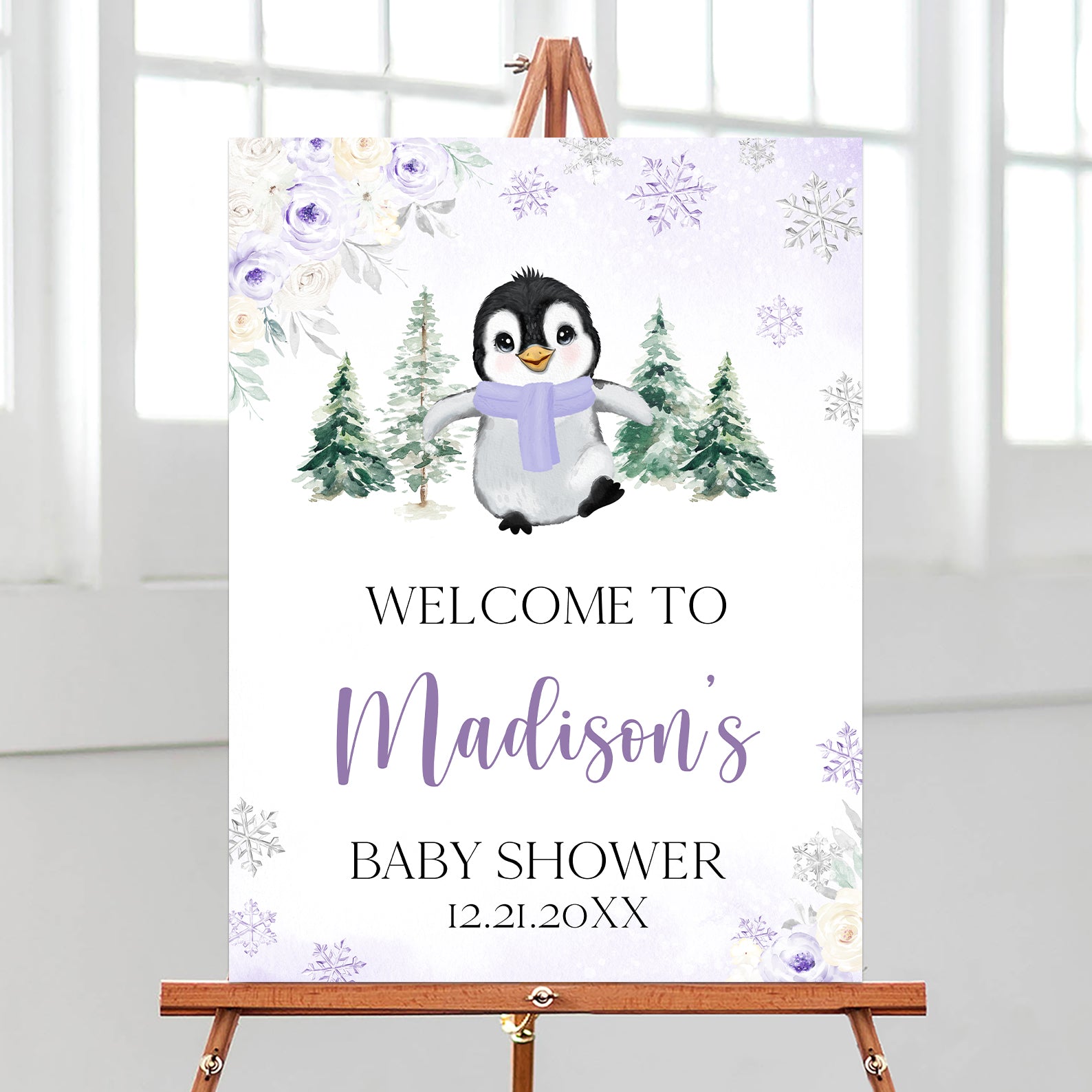 1. Purchase this Penguin Baby It's Cold Outside: Winter Baby Shower Purple Welcome Sign template