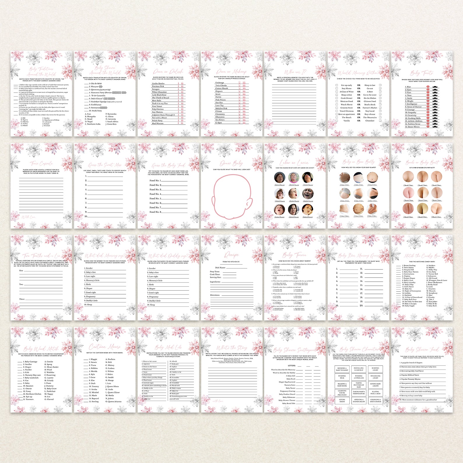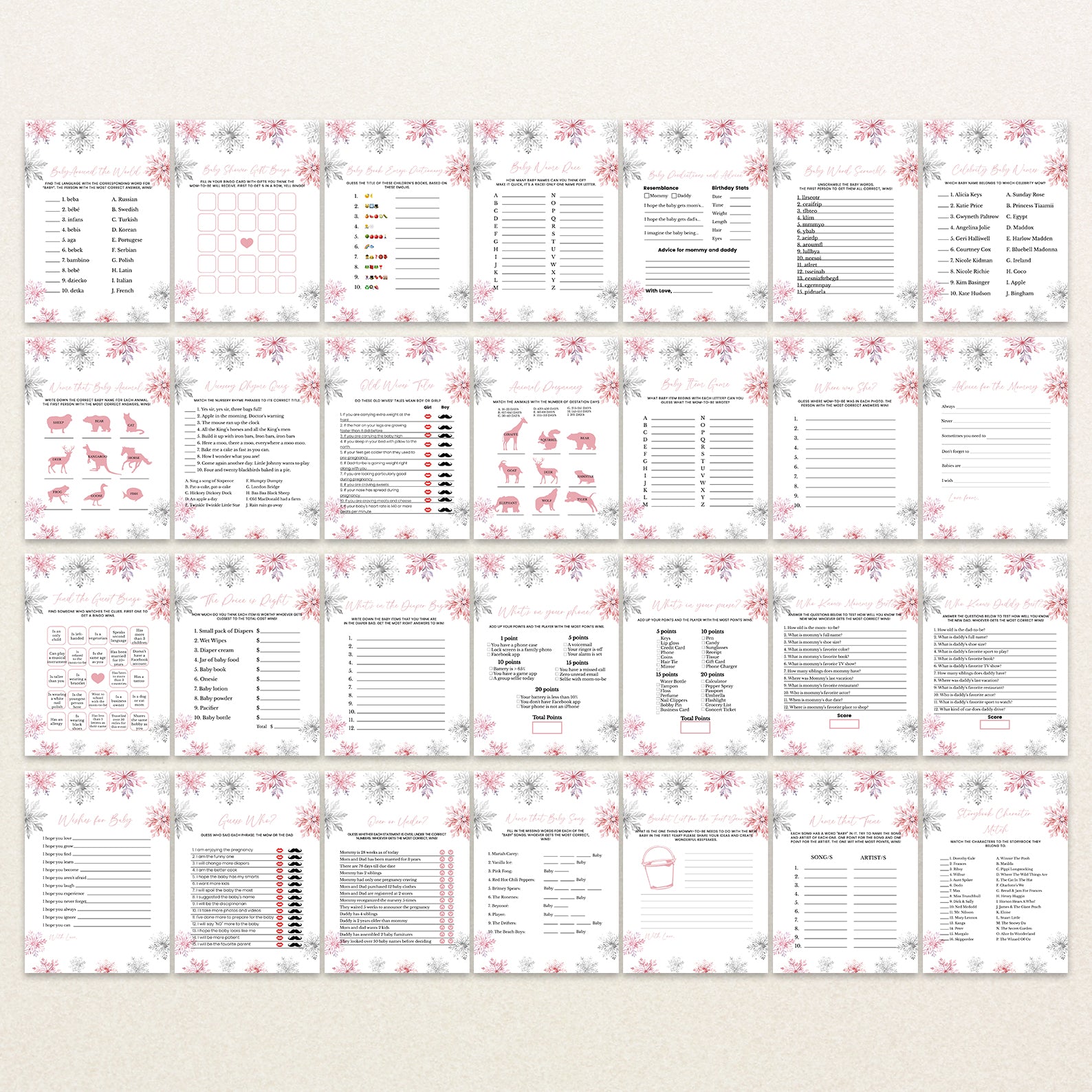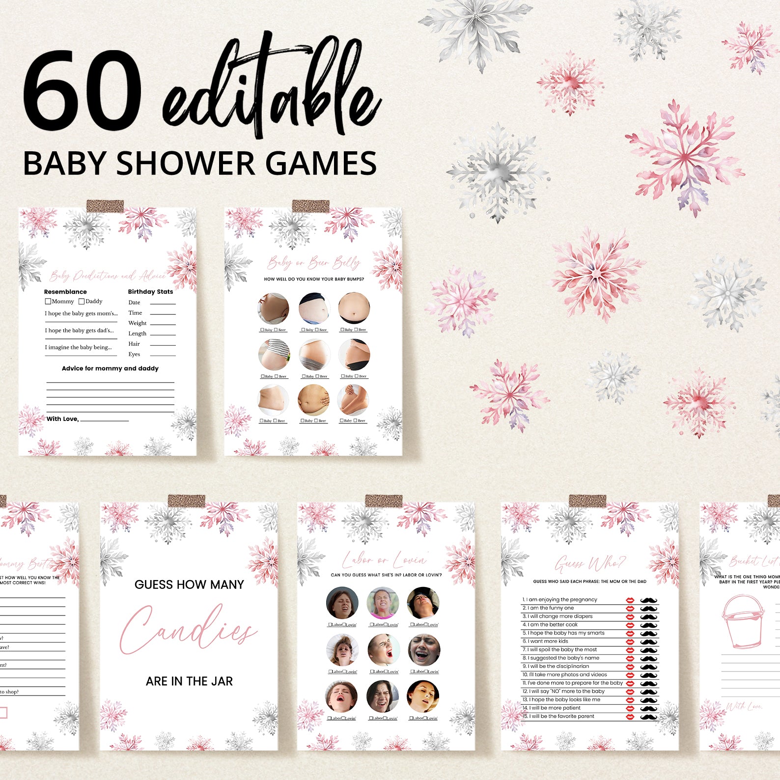 Bring fun and warmth to your winter baby shower with this 60-game editable bundle, featuring a delicate pink and silver snowflake design. From laughter-filled icebreakers to interactive challenges, each game is easy to customize and matches a charming Baby, It’s Cold Outside theme. A festive way to keep guests entertained while celebrating your little one’s upcoming arrival.