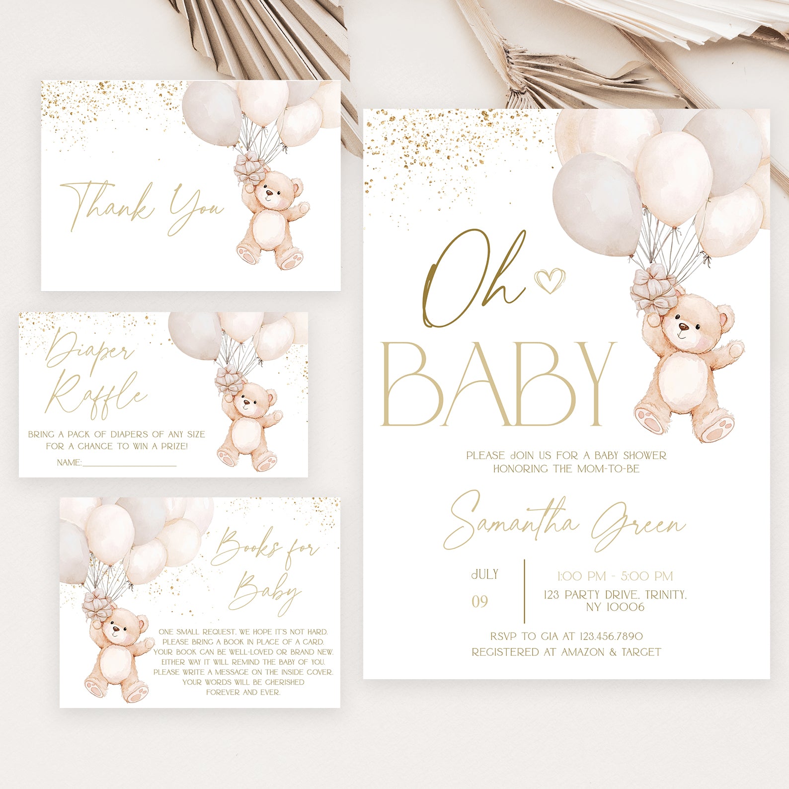 Baby Shower Digital Invite Bundle with Bear, Balloons & Gold Accents