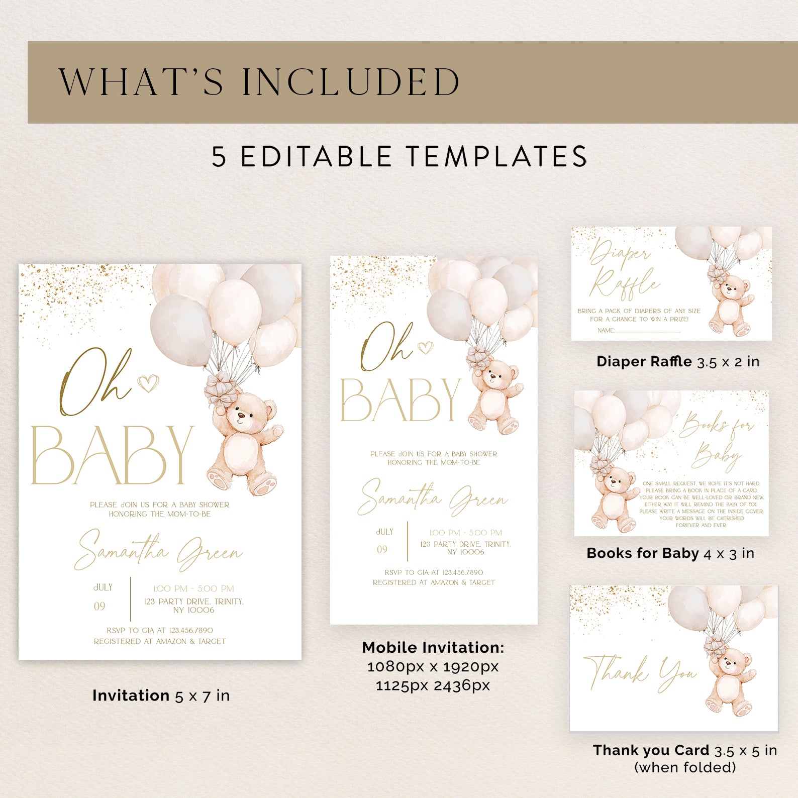 - Purchase this Baby Shower Digital Invite Bundle with Bear, Balloons & Gold Accents template
