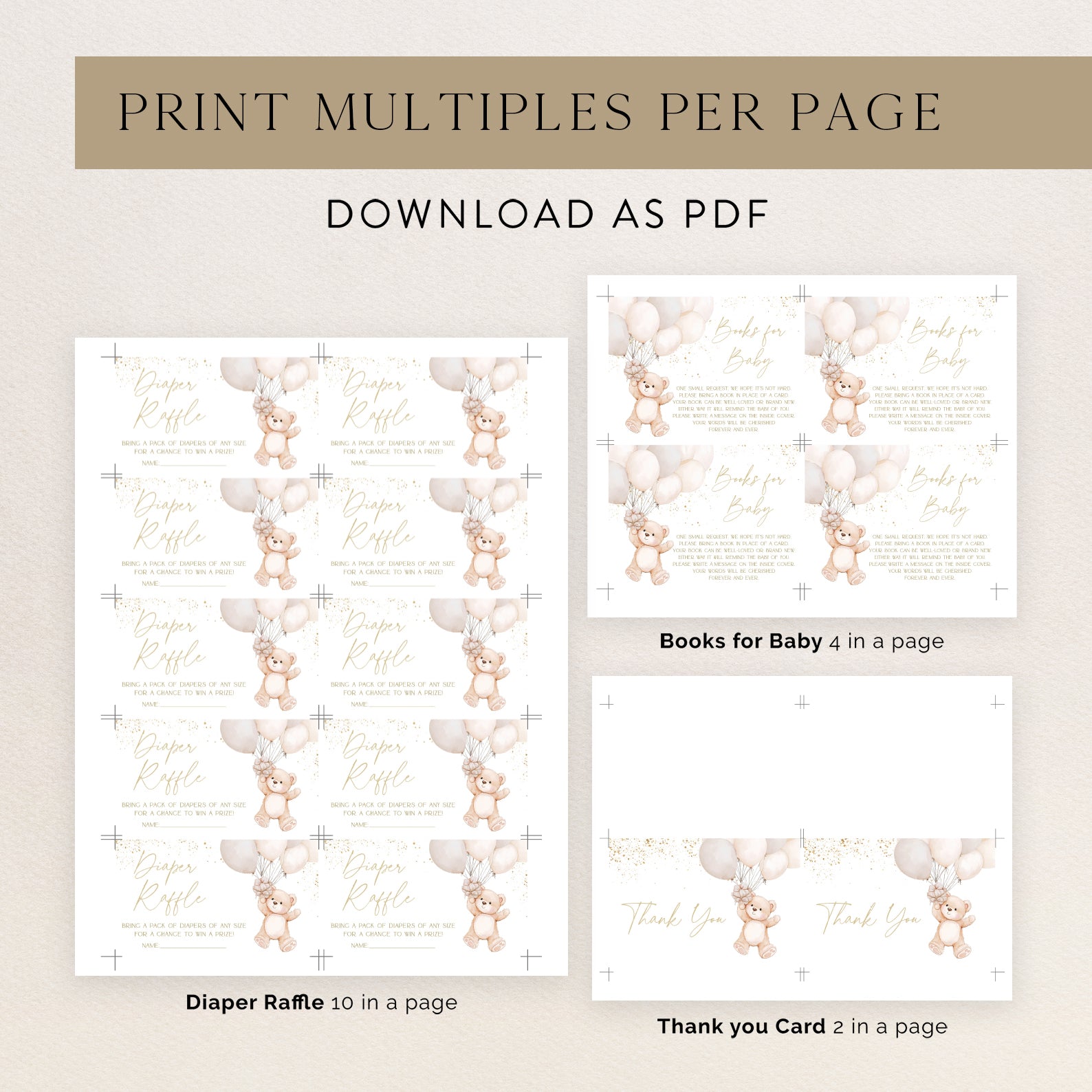 Celebrate your little one’s arrival with this adorable baby shower invitation bundle! Featuring a sweet bear holding a ribbon of watercolor balloons and elegant gold accents, this set is available in blue, pink, or brown to match your theme. Includes an invitation, mobile invite, diaper raffle, books for baby, and thank you card for a beautifully coordinated celebration.