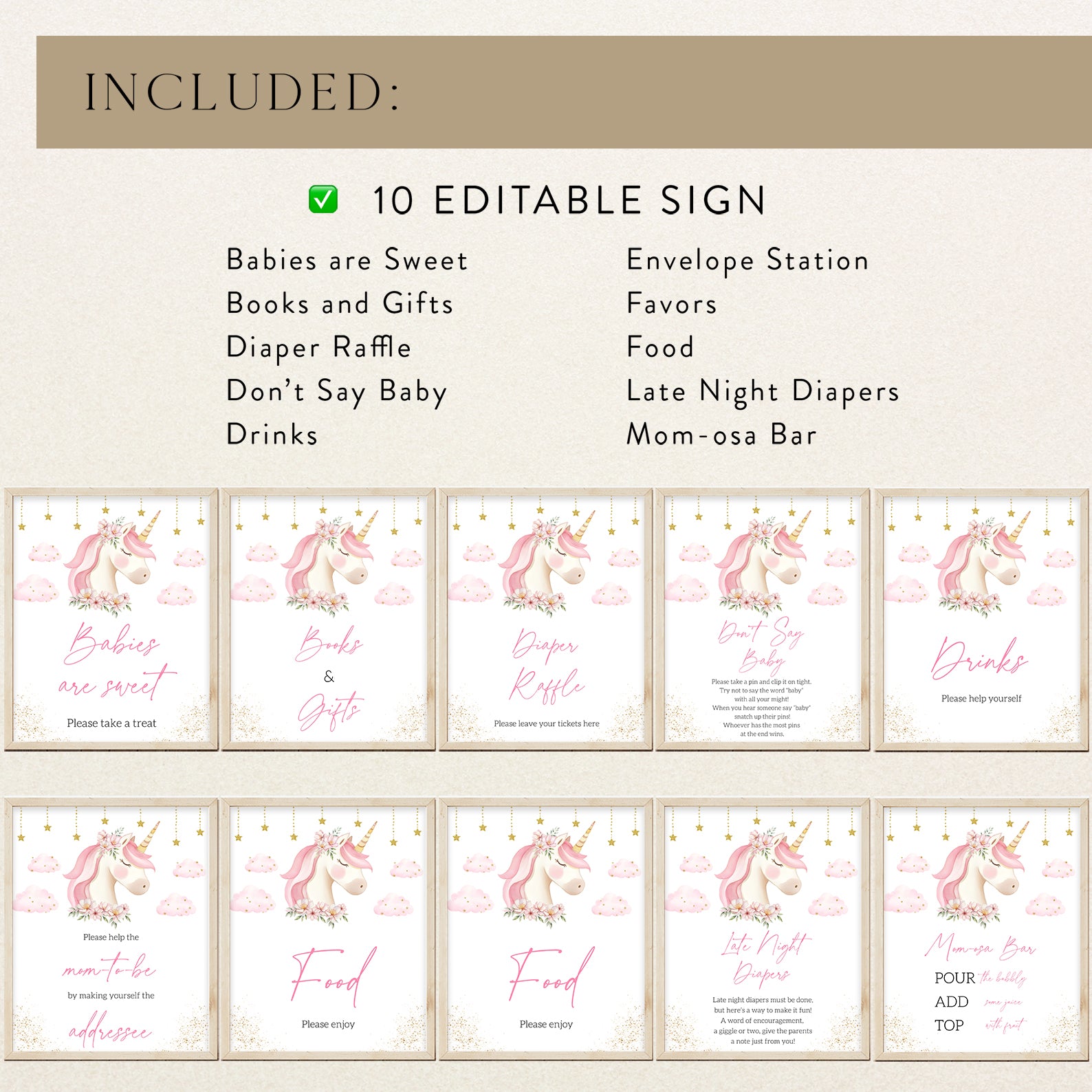 Add a whimsical touch to your summer baby shower with this enchanting set of ten editable table signs. Featuring shimmering gold falling stars, soft pink clouds, and a serene sleeping unicorn with a flowing pink mane adorned with floral accents, these signs bring a dreamy charm to your event. The collection includes Babies Are Sweet, Books and Gifts, Diaper Raffle Sign, Don't Say Baby, Drinks Sign, Envelope Station, Favors, Food Sign, Late Night Diapers, and Mom-osa Bar—perfect for guiding guests and enhancing your celebration décor.
