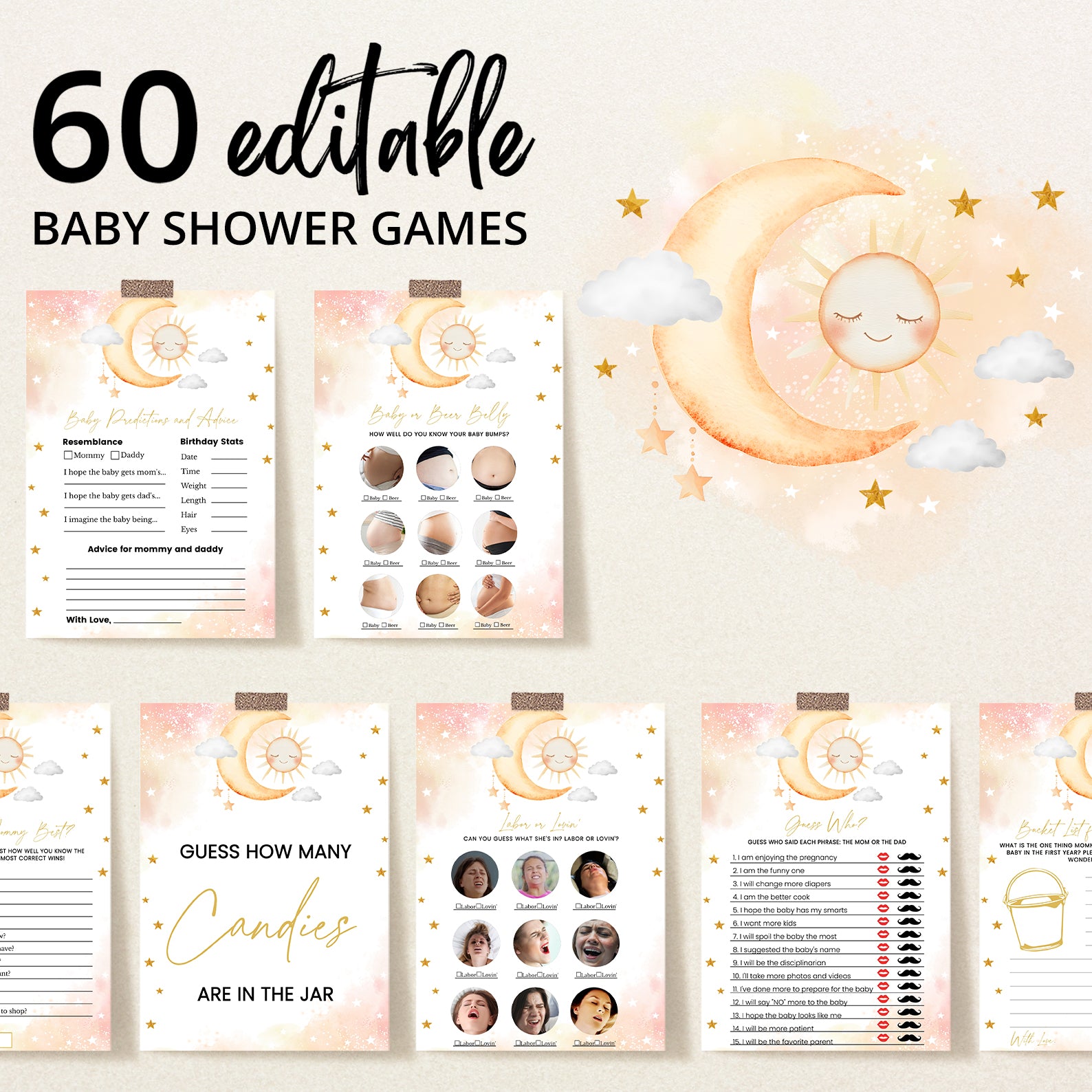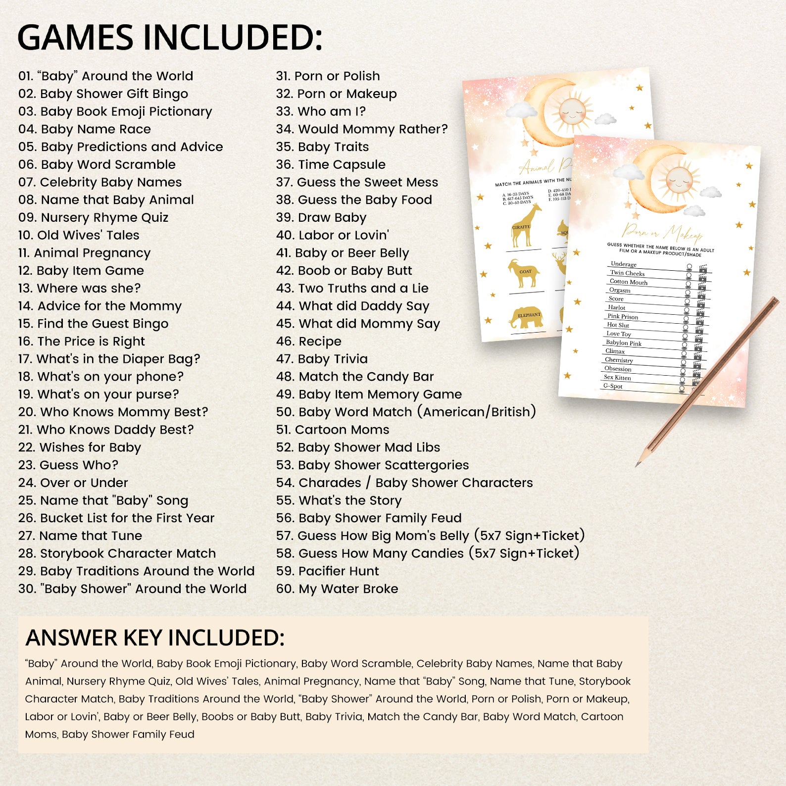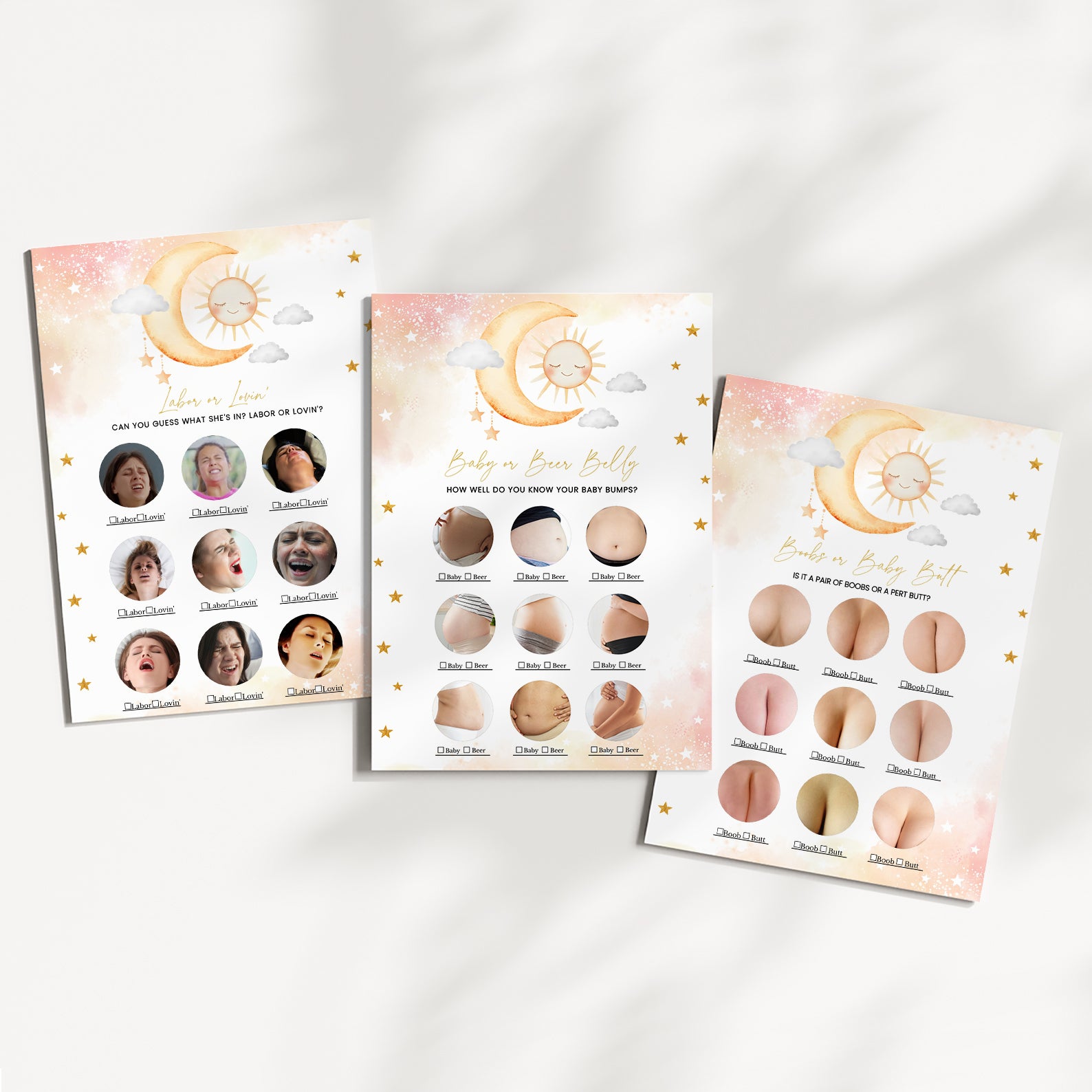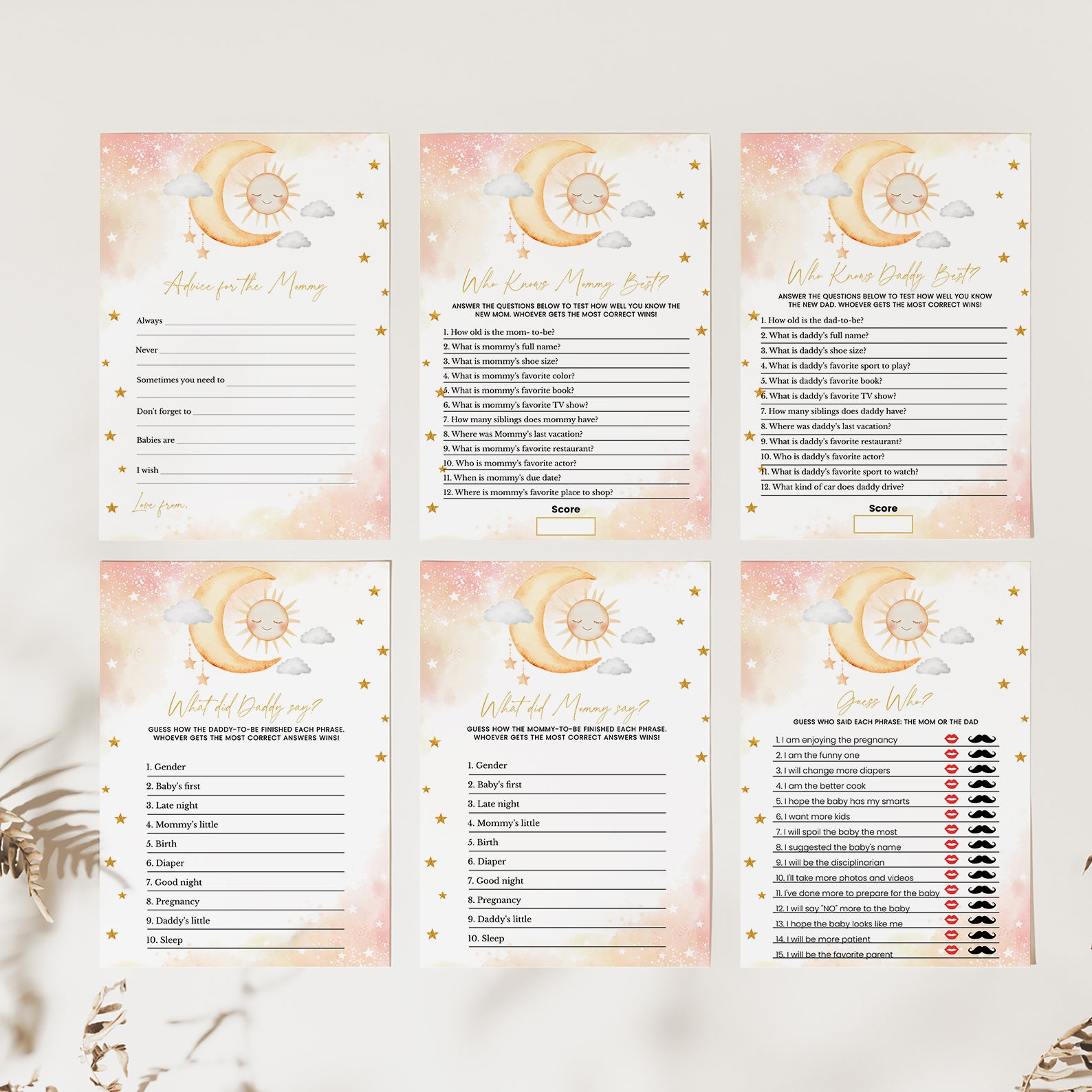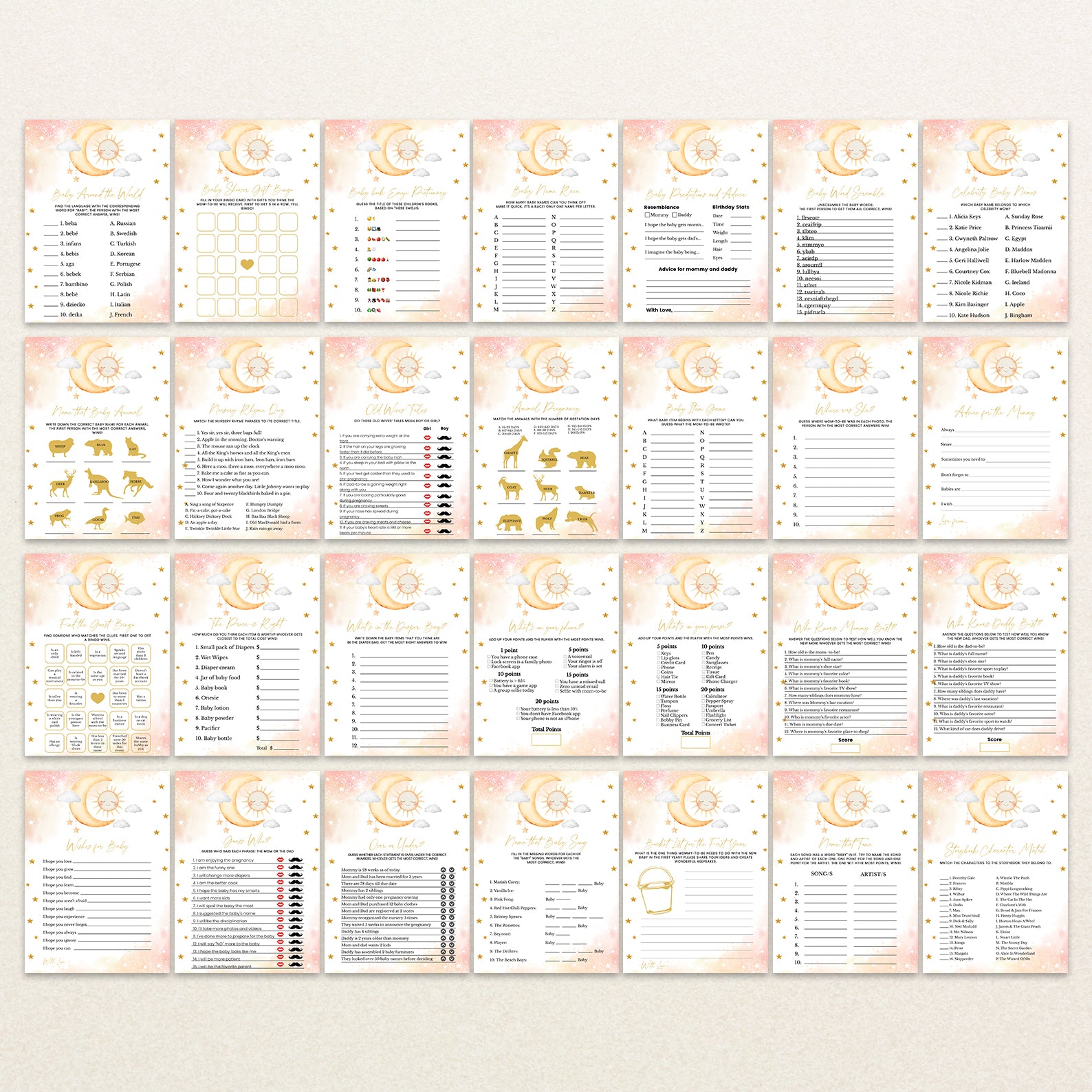 - Purchase this Summer Baby Shower Game Bundle with Pastel Moon & Gold Stars template