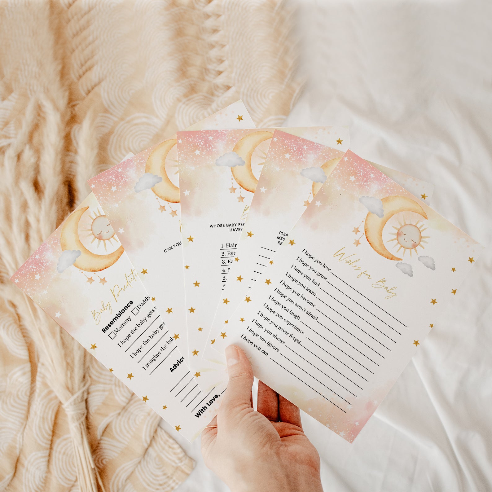 Celebrate the joy of new beginnings with our "Magical Night" summer baby shower game bundle! Featuring a charming crescent moon cradling a falling star, surrounded by fluffy clouds and a cute sleeping sun, this enchanting set sets the tone for a whimsical celebration. With shimmering gold stars and a light pink and orange pastel background, it captures the warmth and happiness of your upcoming arrival. Perfect for creating fun and lasting memories, this game bundle will keep your guests entertained as you prepare to welcome your little one in style!