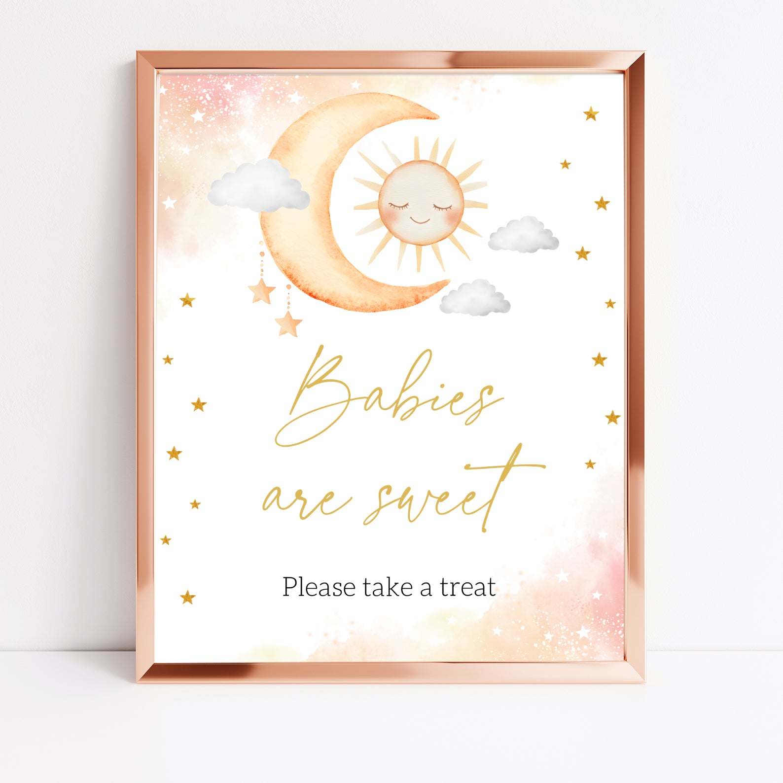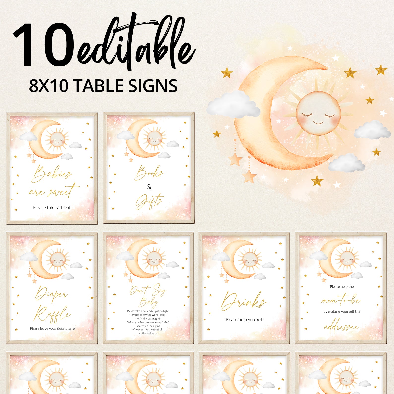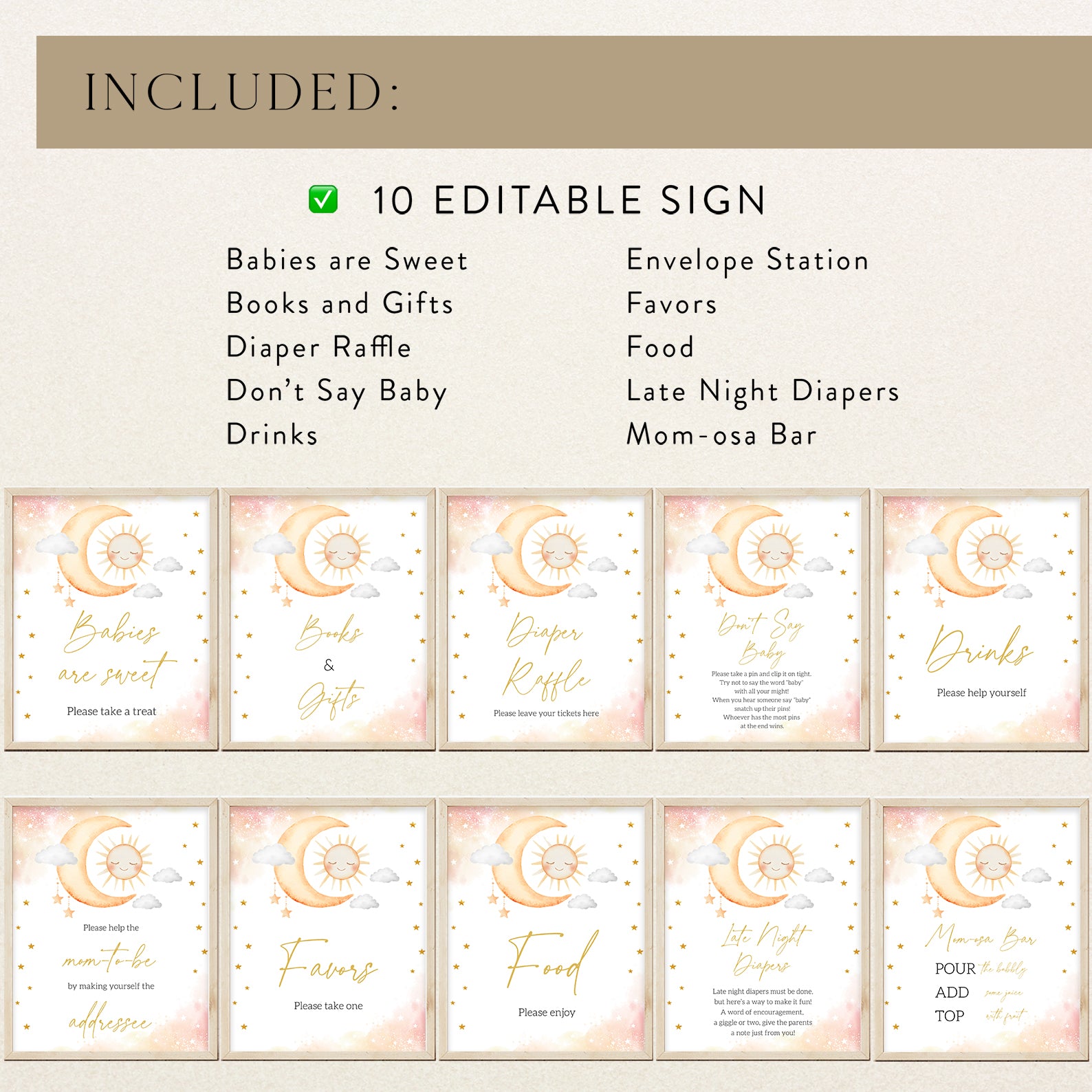 Add a touch of magic to your baby shower with this enchanting set of ten editable table signs. Featuring a soft pastel pink and orange background, shimmering gold stars, and whimsical celestial accents, these signs bring warmth and charm to your celebration. The set includes: Babies Are Sweet, Books and Gifts, Diaper Raffle Sign, Don't Say Baby, Drinks Sign, Envelope Station, Favors, Food Sign, Late Night Diapers, and Mom-osa Bar—perfectly designed to complement your dreamy event decor.