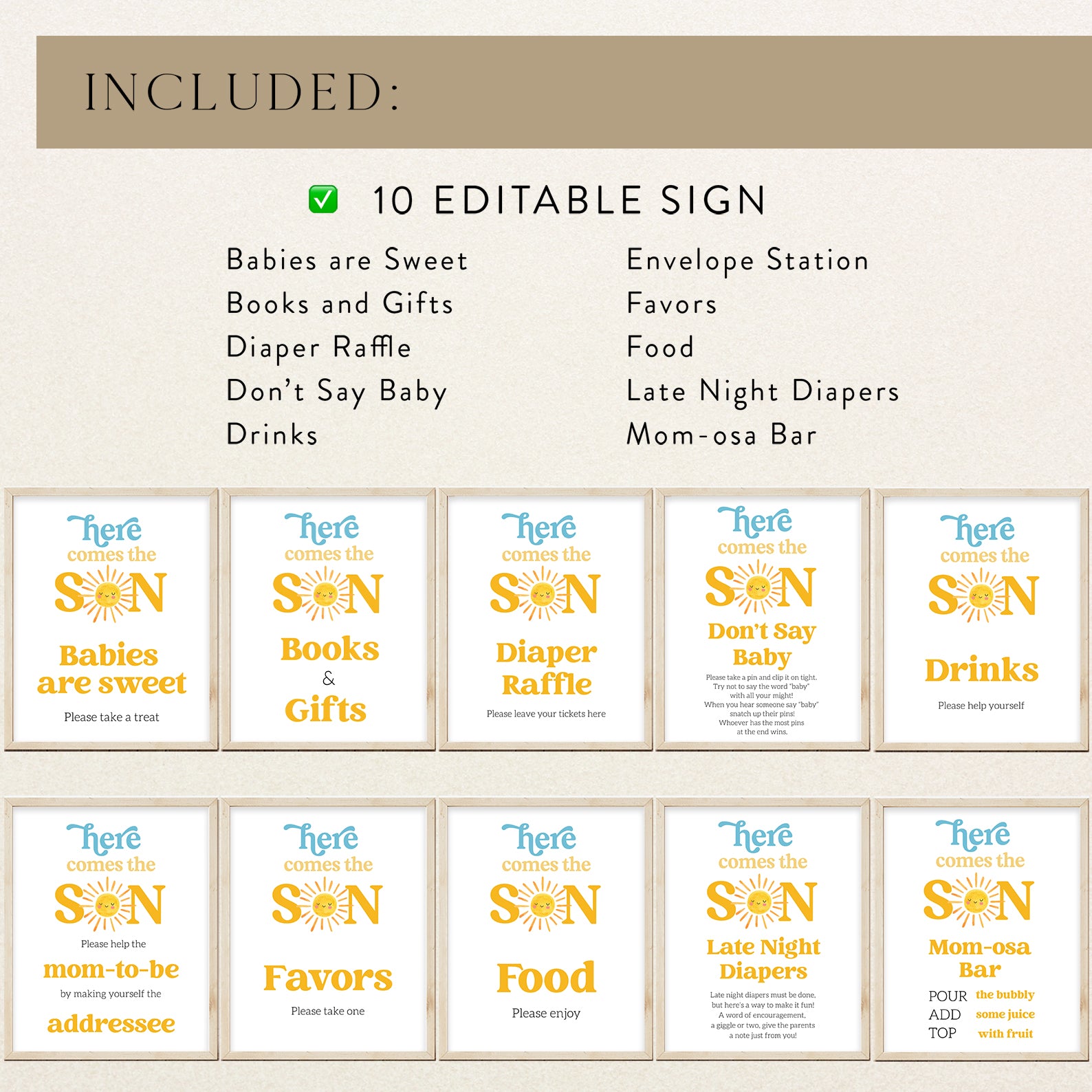 Brighten up your baby shower with this charming set of ten editable table signs! Featuring a playful sun that adds a whimsical touch, these signs perfectly complement a sunny and joyful celebration. The set includes: Babies Are Sweet, Books and Gifts, Diaper Raffle Sign, Don't Say Baby, Drinks Sign, Envelope Station, Favors, Food Sign, Late Night Diapers, and Mom-osa Bar—ideal for creating a warm and inviting atmosphere for your special day.