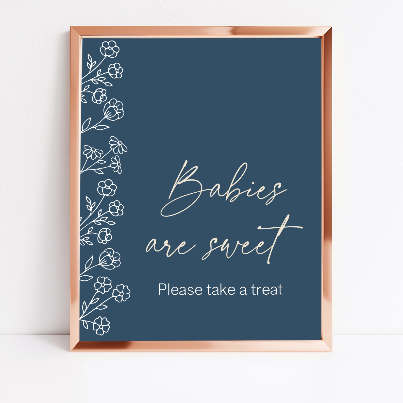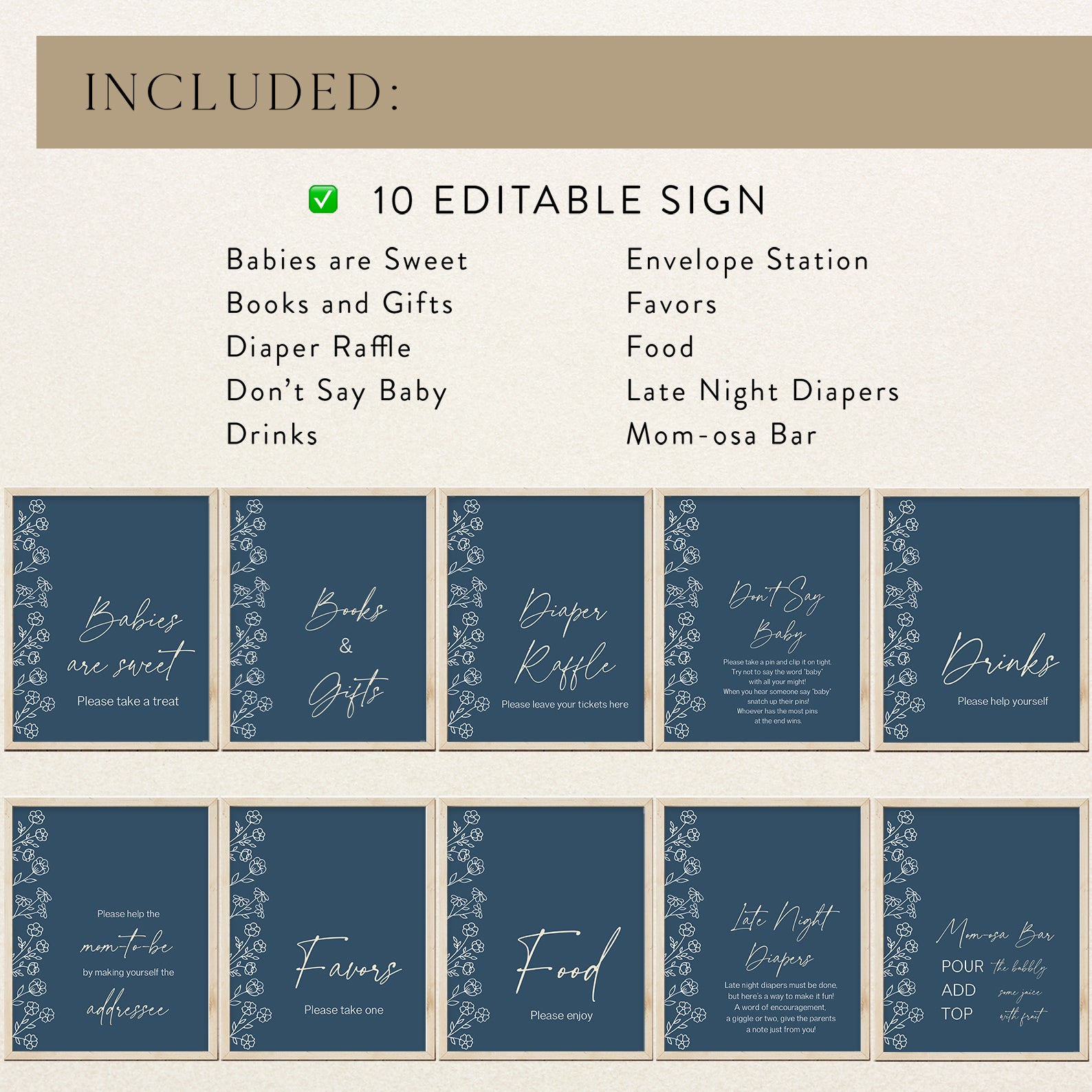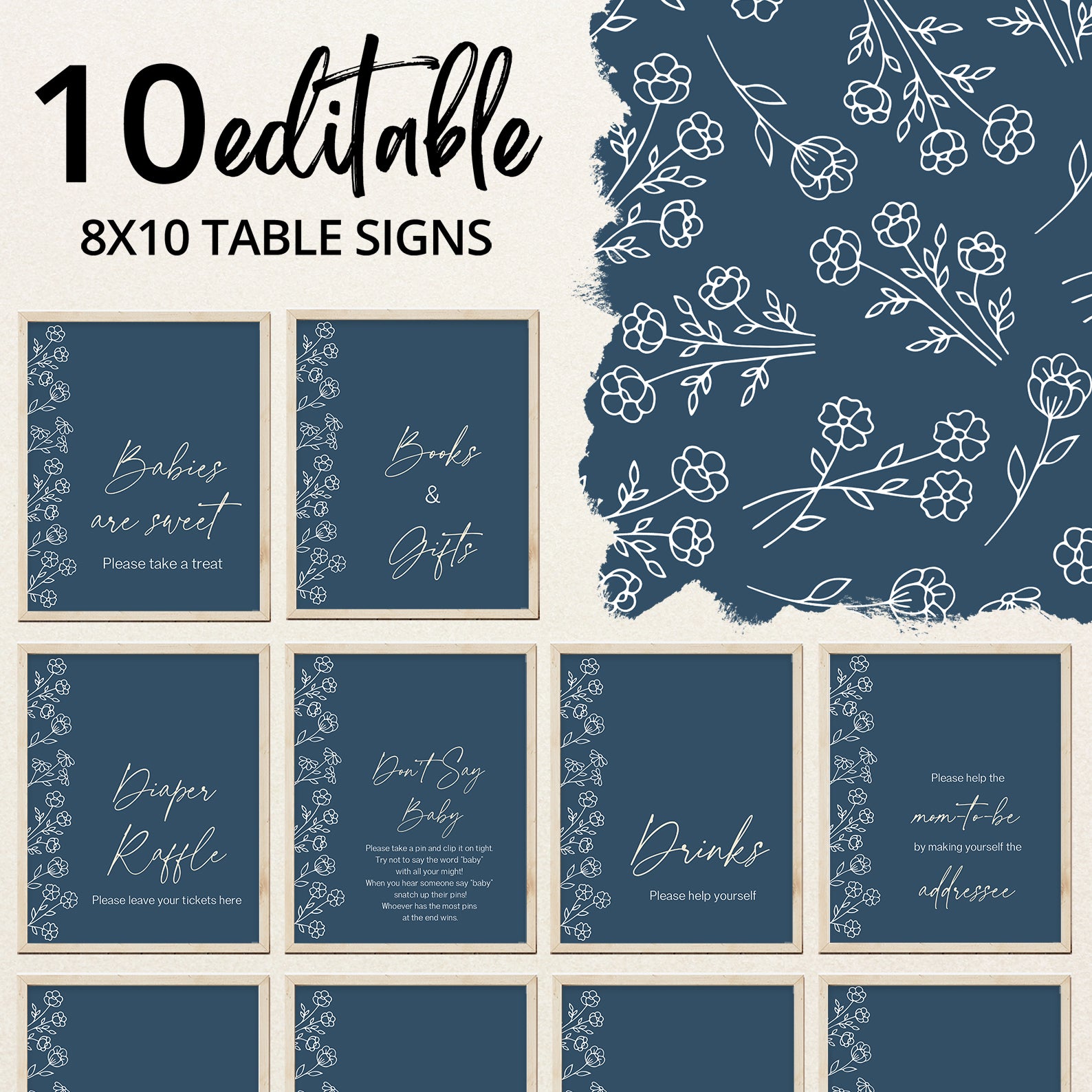 Celebrate the arrival of your little one with our minimalist spring baby shower table sign set! Designed with a charming floral pattern on the left side and a soothing blue background, these elegant signs are perfect for welcoming guests to your baby boy’s special day. This editable set includes 10 coordinating signs: Babies Are Sweet, Books and Gifts, Diaper Raffle, Don’t Say Baby, Drinks, Envelope Station, Favors, Food, Late Night Diapers, and Mom-osa Bar. Effortlessly add a modern, stylish touch to your celebration decor!