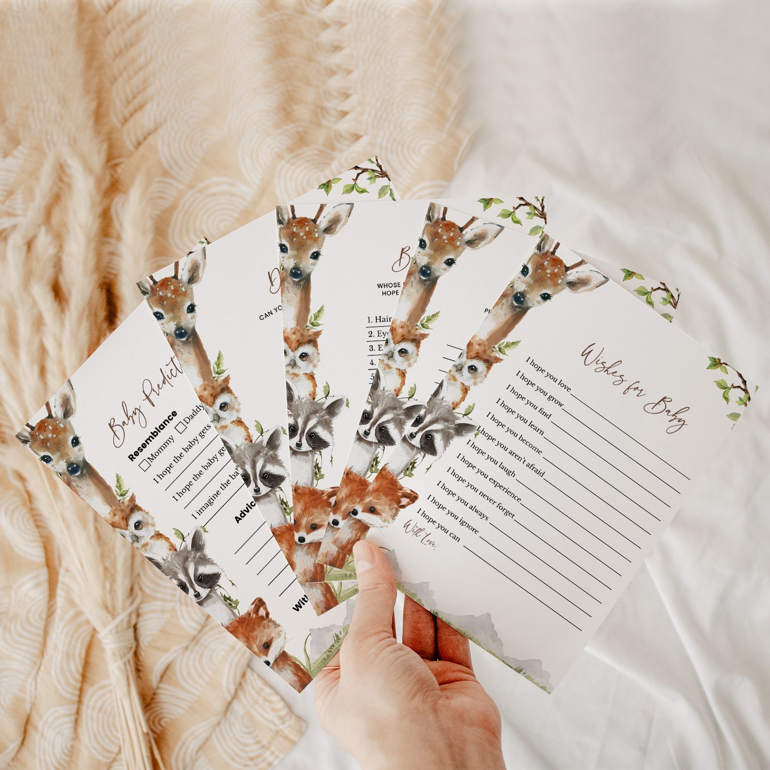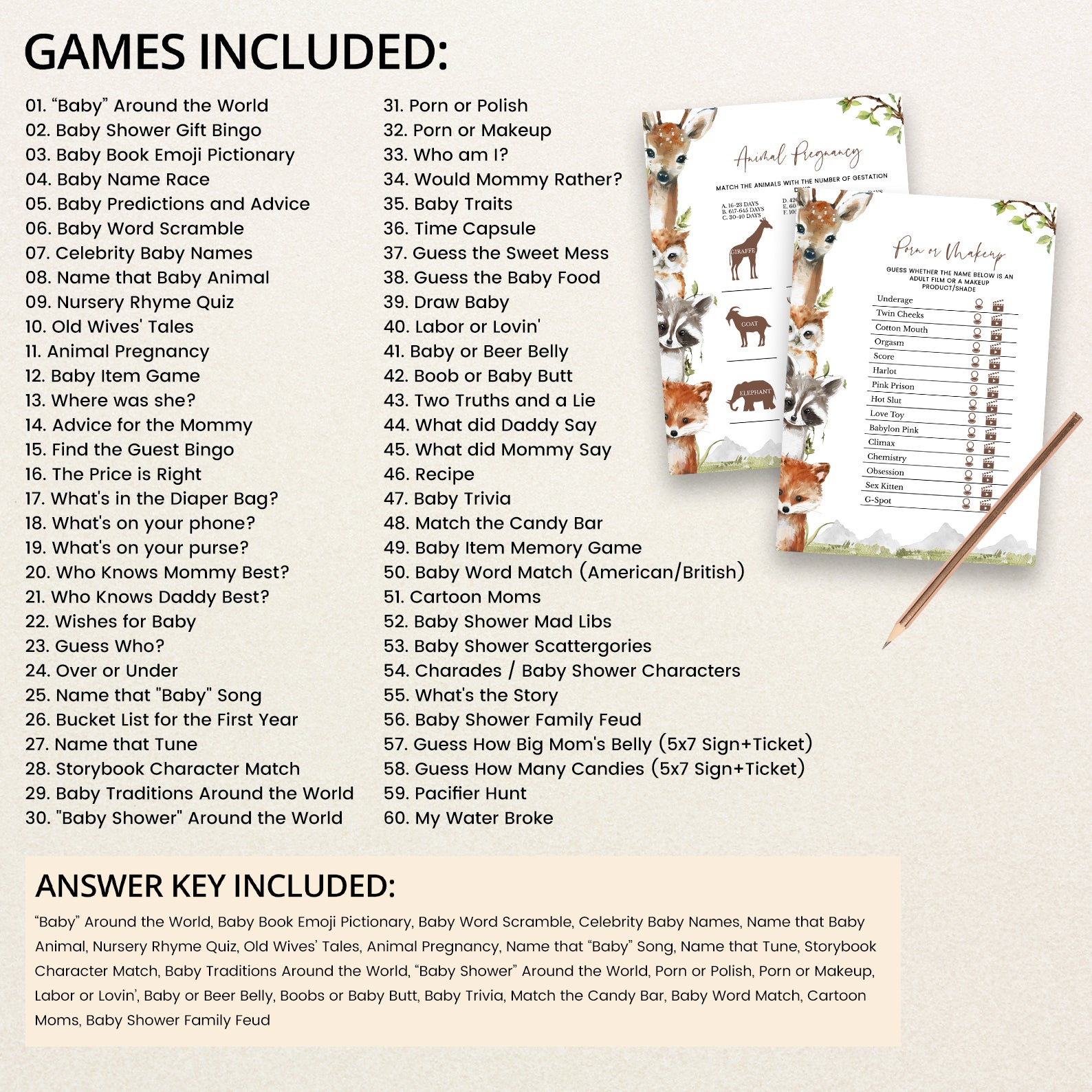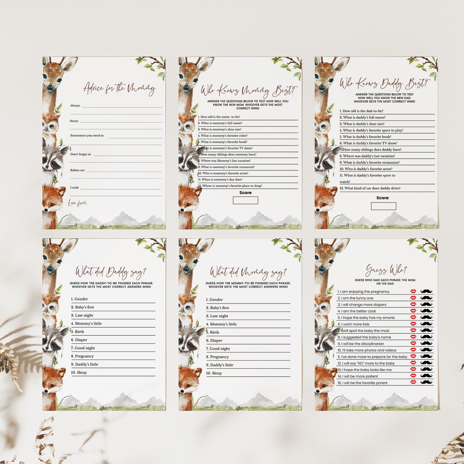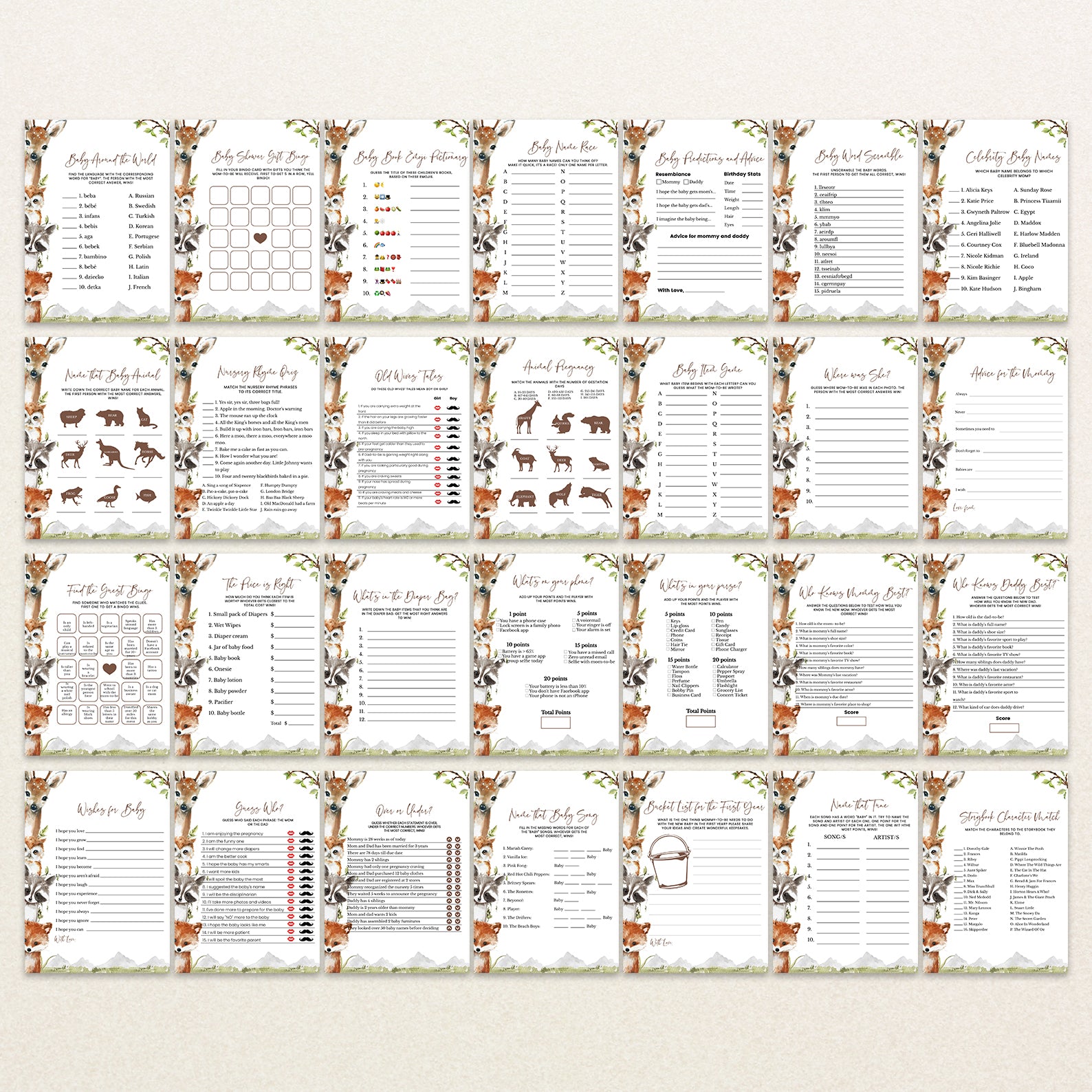 Celebrate your little one's arrival with our charming "It's a Boy" safari jungle-themed baby shower game bundle! This delightful design features an adorable ensemble of safari animals—including a deer, owl, and playful foxes—peeking out from lush green leaves along the side. A whimsical watercolor wood slice creatively replaces the "o" in "Boy," while a serene mountain forest scene anchors the bottom of the design. This beautifully coordinated bundle includes 60 fun and engaging baby shower games, perfect for adding excitement and lasting memories to your celebration.
