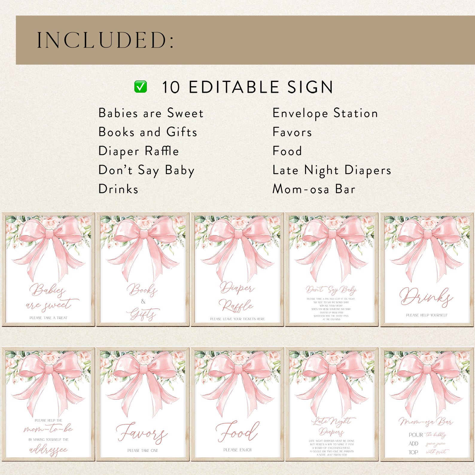 Celebrate the arrival of your little one with our charming Spring Baby Shower Table Signs! Featuring delicate pink watercolor ribbons and adorned with lovely pink roses and lush green leaves, these signs add a whimsical touch to your event. Perfect for creating a beautiful, welcoming atmosphere, the signs include all the essentials, such as Babies Are Sweet, Books and Gifts, Diaper Raffle, Don’t Say Baby, Drinks, Envelope Station, Favors, Food, Late Night Diapers, and Mom-osa Bar. Easily customizable, these signs will guide your guests while adding elegance to your celebration!