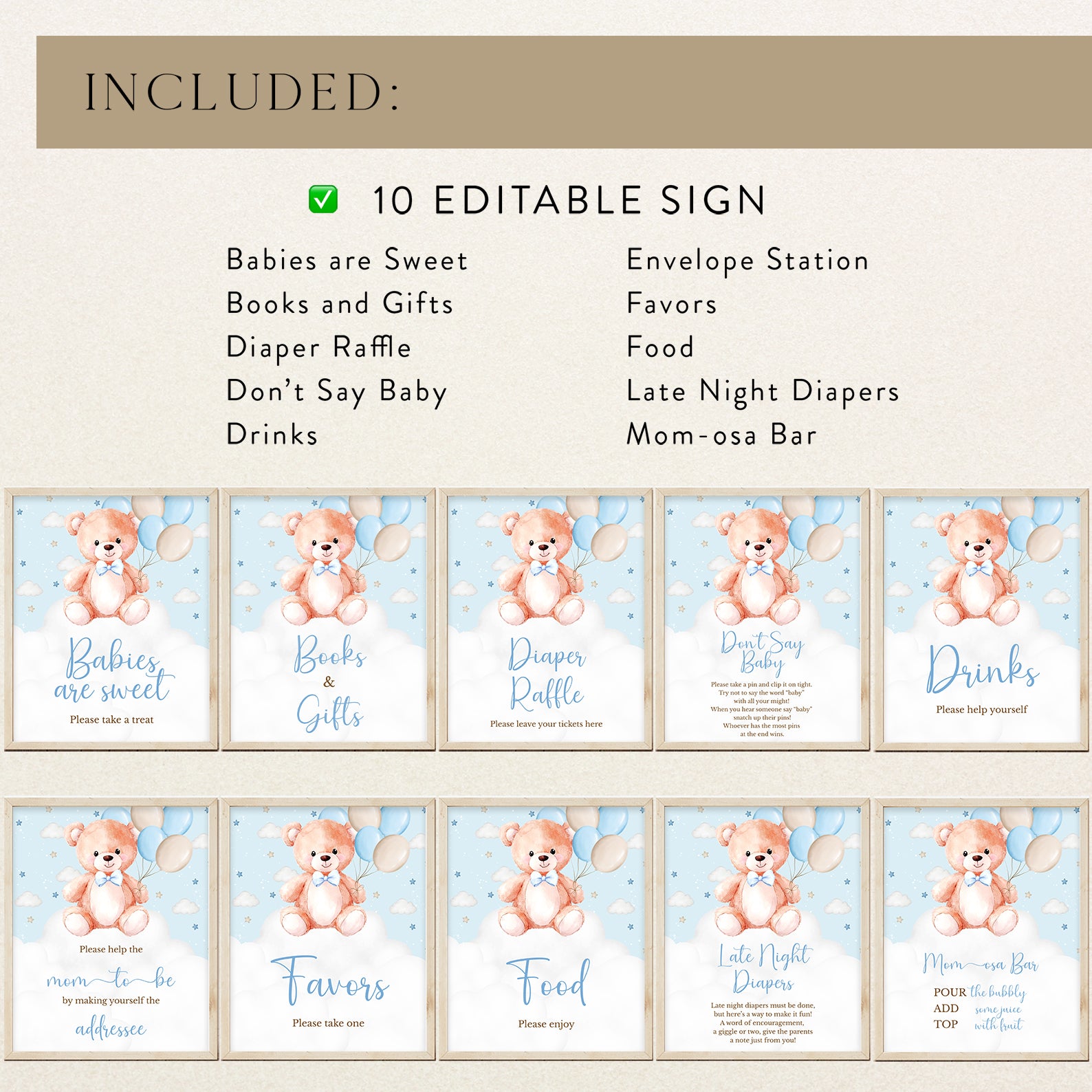 Celebrate the arrival of your little one with our charming "We Can Bearly Wait" baby shower invitation! This delightful design features an adorable teddy bear draped in a blue ribbon, holding light beige and blue balloons while nestled on a fluffy white cloud. Surrounding the bear are twinkling stars and soft clouds, creating a whimsical atmosphere for your event. For added convenience, include ten editable table signs—Babies Are Sweet, Books and Gifts, Diaper Raffle, Don't Say Baby, Drinks, Envelope Station, Favors, Food, Late Night Diapers, and Mom-osa Bar—for a perfectly organized celebration your guests will love!