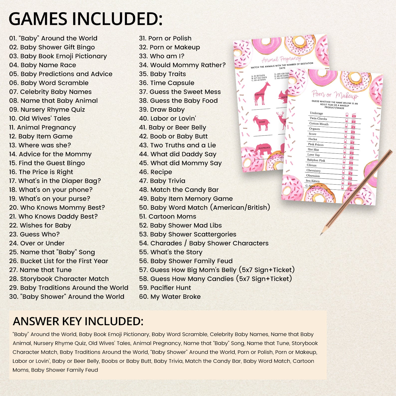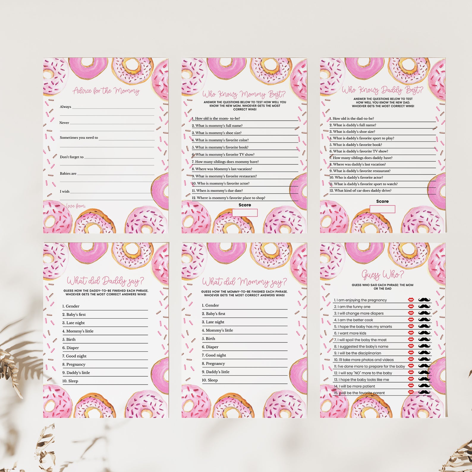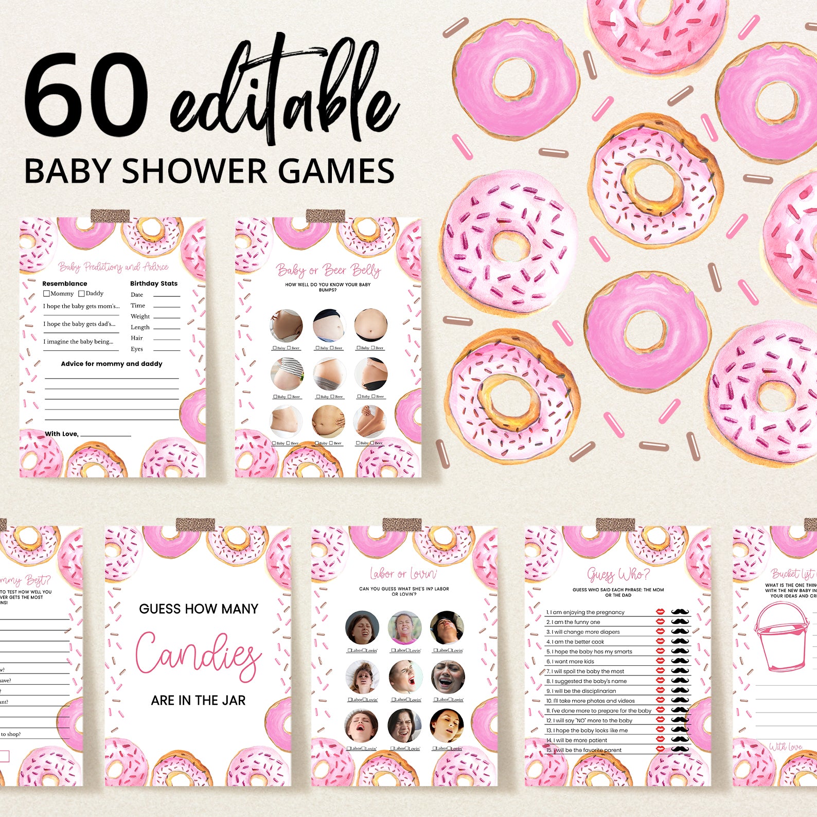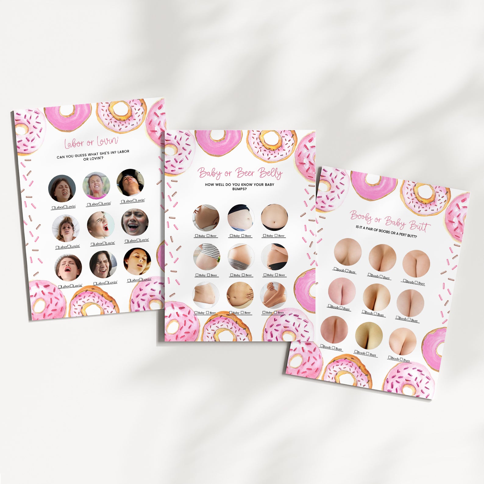 Celebrate your little one with our Evergreen Baby Shower game bundle, available in both blue and pink themes! This playful collection includes 60 entertaining baby shower games, all featuring whimsical borders with delightful donuts—sprinkled and plain—for a sweet and joyful vibe. Coordinating sprinkles and colorful accents add extra charm, making this bundle perfect for a fun-filled event. Whether you're planning for a baby boy or girl, this game set brings laughter, love, and unforgettable memories to your celebration!