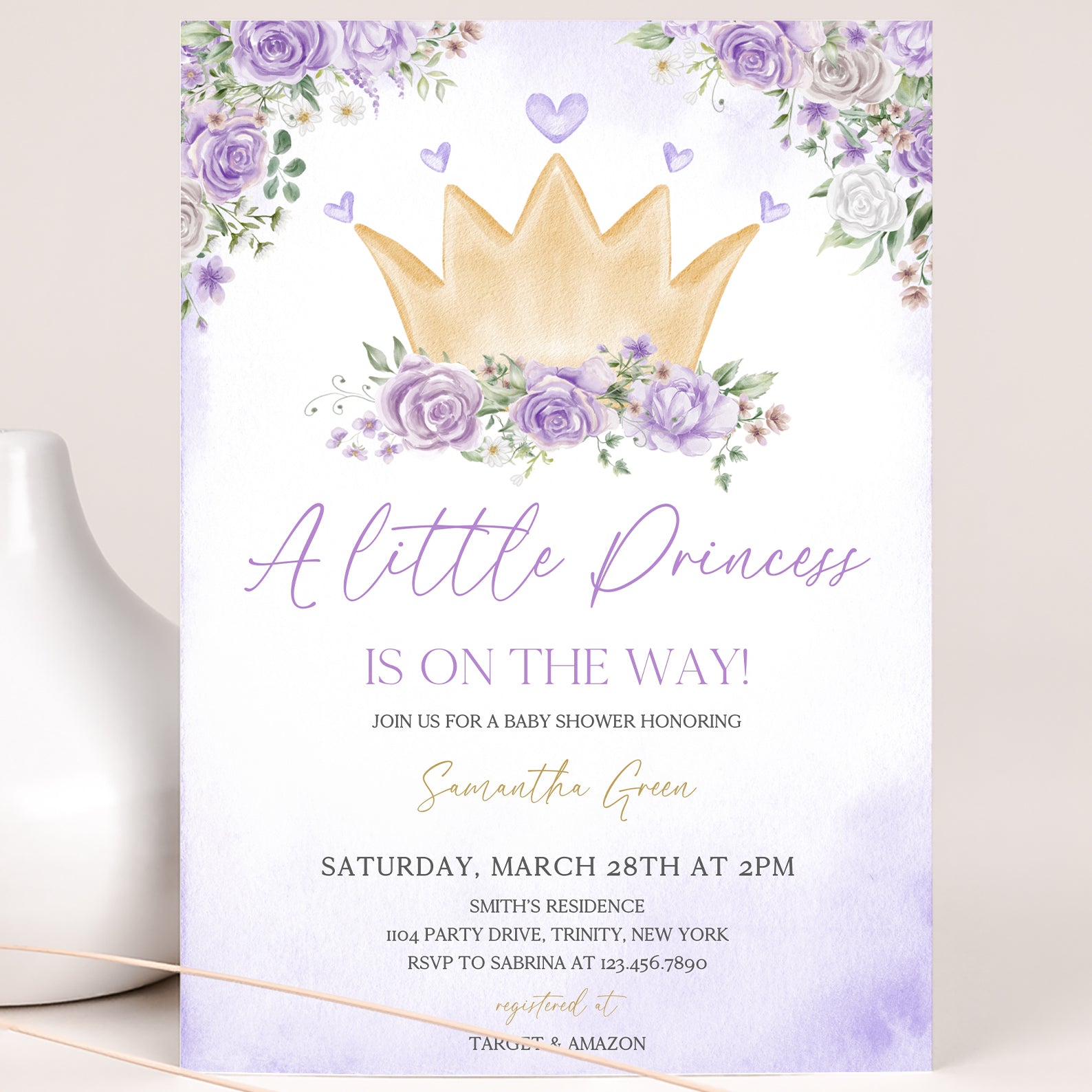 - Purchase this Purple Princess Baby Shower Invite with Crown & Florals template