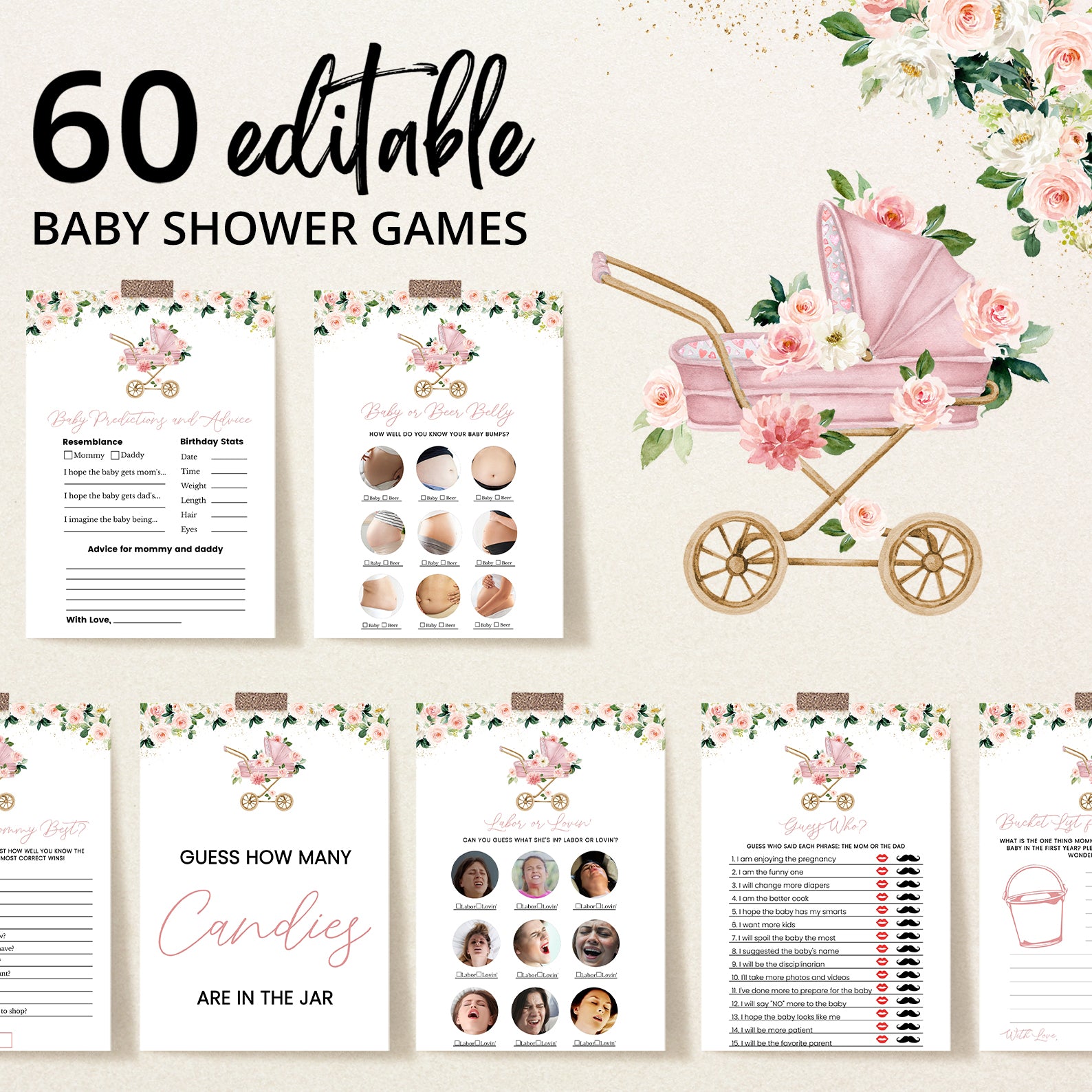 - Purchase this Pink Stroller Spring Baby Shower Digital Game Bundle with Florals template
