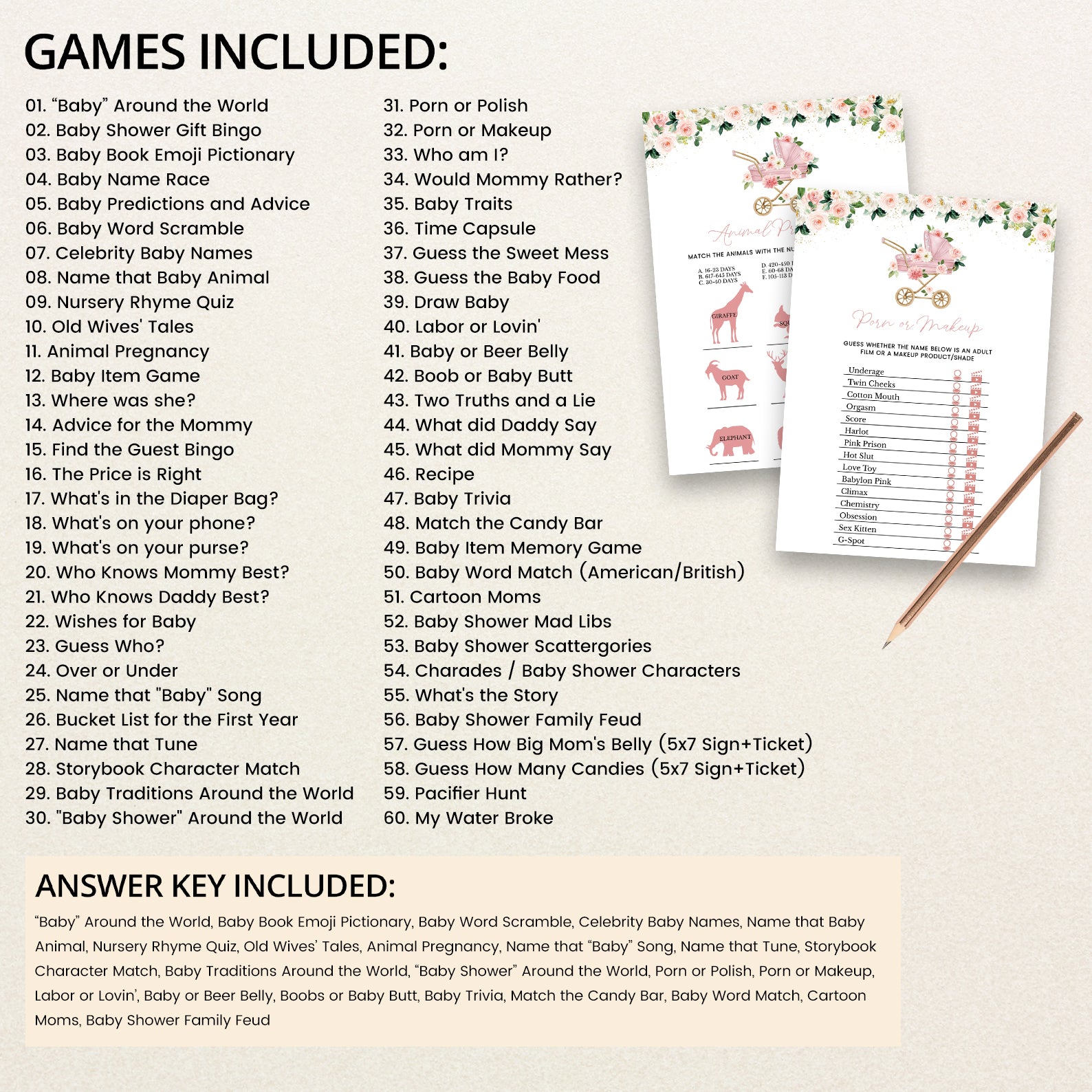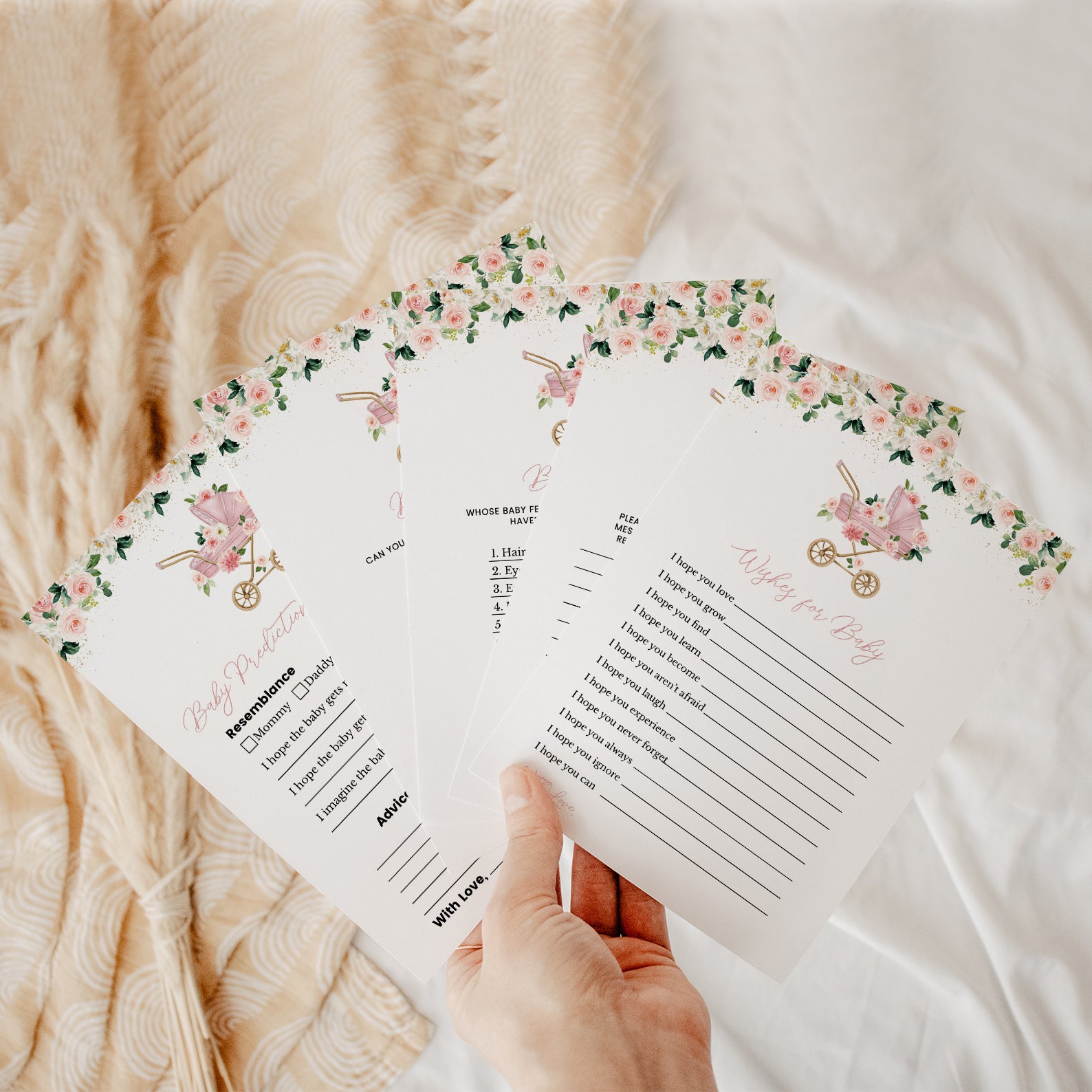 Celebrate the arrival of your little one with our enchanting spring baby shower game bundle! Adorned with delicate pink and white florals, lush green leaves, and elegant gold accents, this beautifully themed 60-game set brings the essence of springtime joy to your celebration. A charming pink baby stroller embellished with white and pink roses adds a whimsical touch, making this bundle perfect for a sweet and stylish gathering. Entertain your guests and create lasting memories with games that are as lovely as the season!