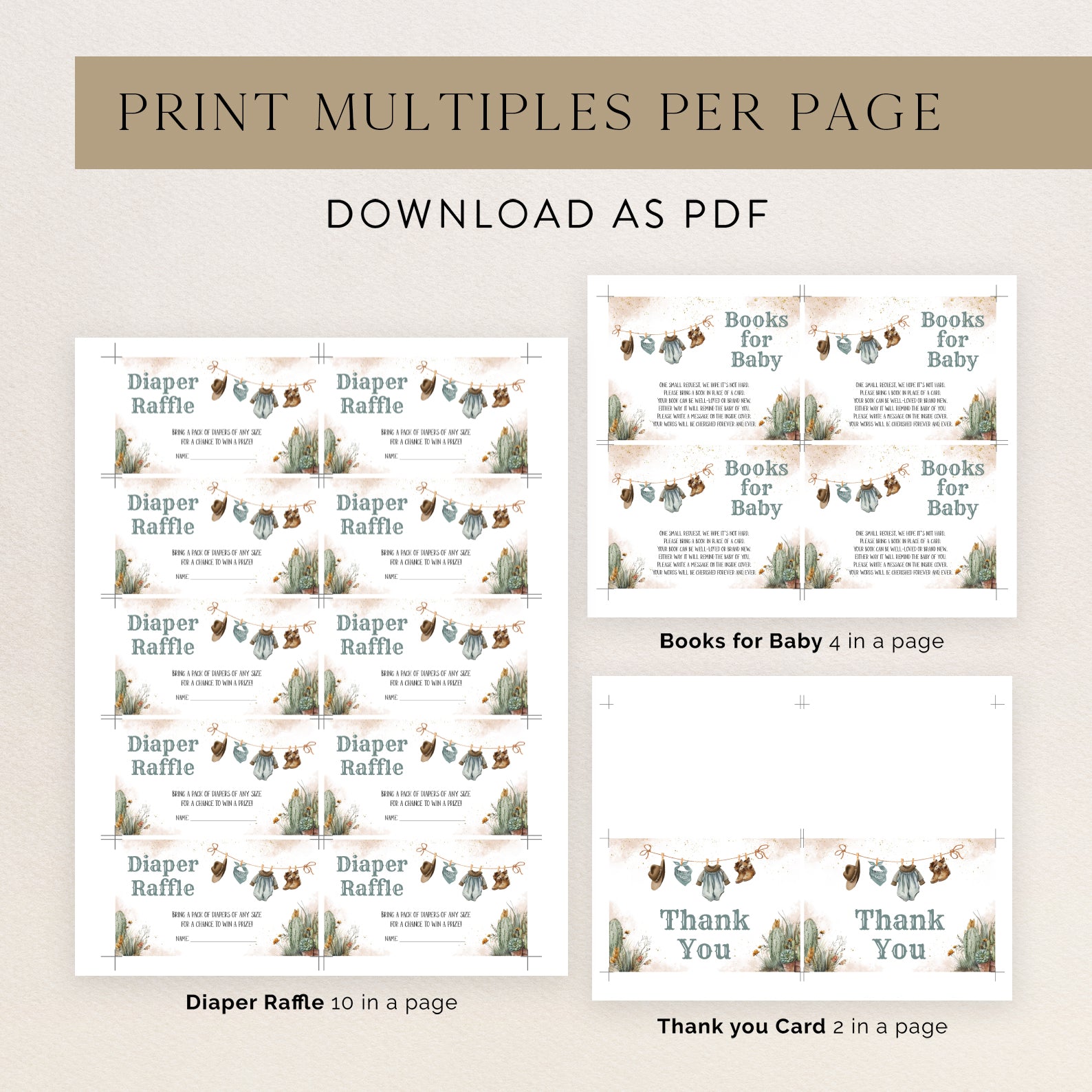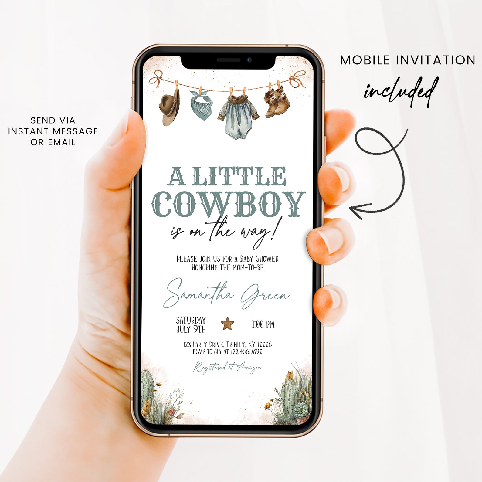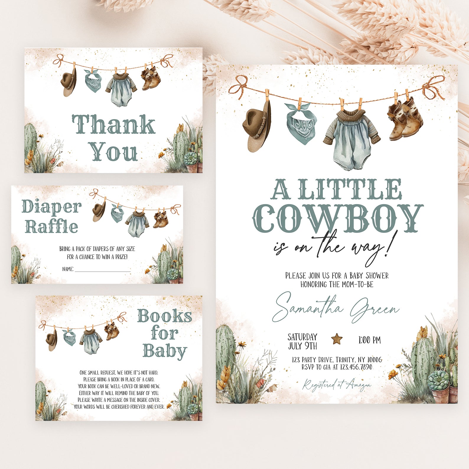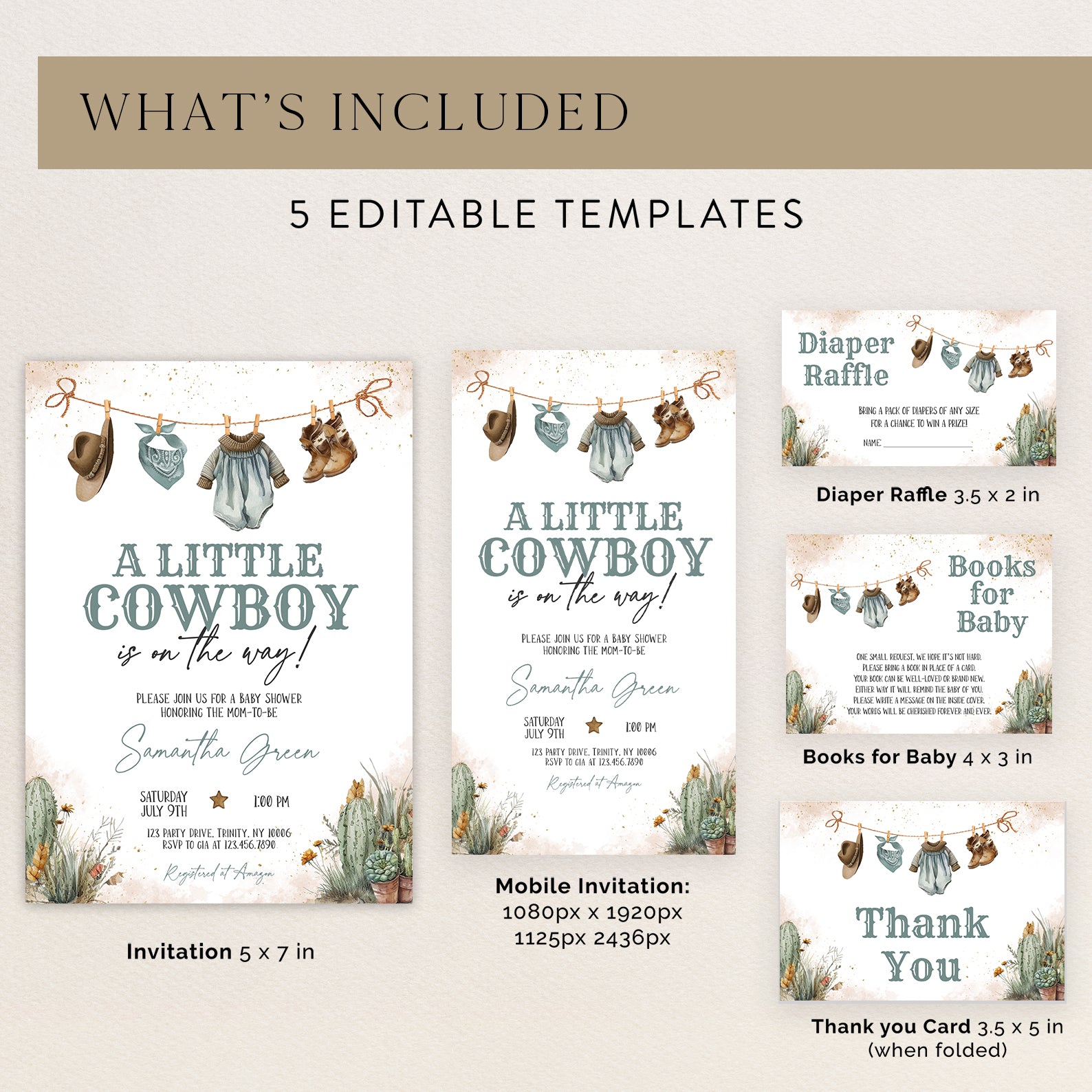Round up your guests in style with our "A Little Cowboy is on the Way" baby shower bundle! This digital set includes an invitation, mobile invite, diaper raffle card, books for baby card, and thank you card all featuring cute cowboy gear and cactuses. With a fun Western vibe and easy-to-edit format, it’s the perfect way to celebrate your little buckaroo’s arrival. Yeehaw!