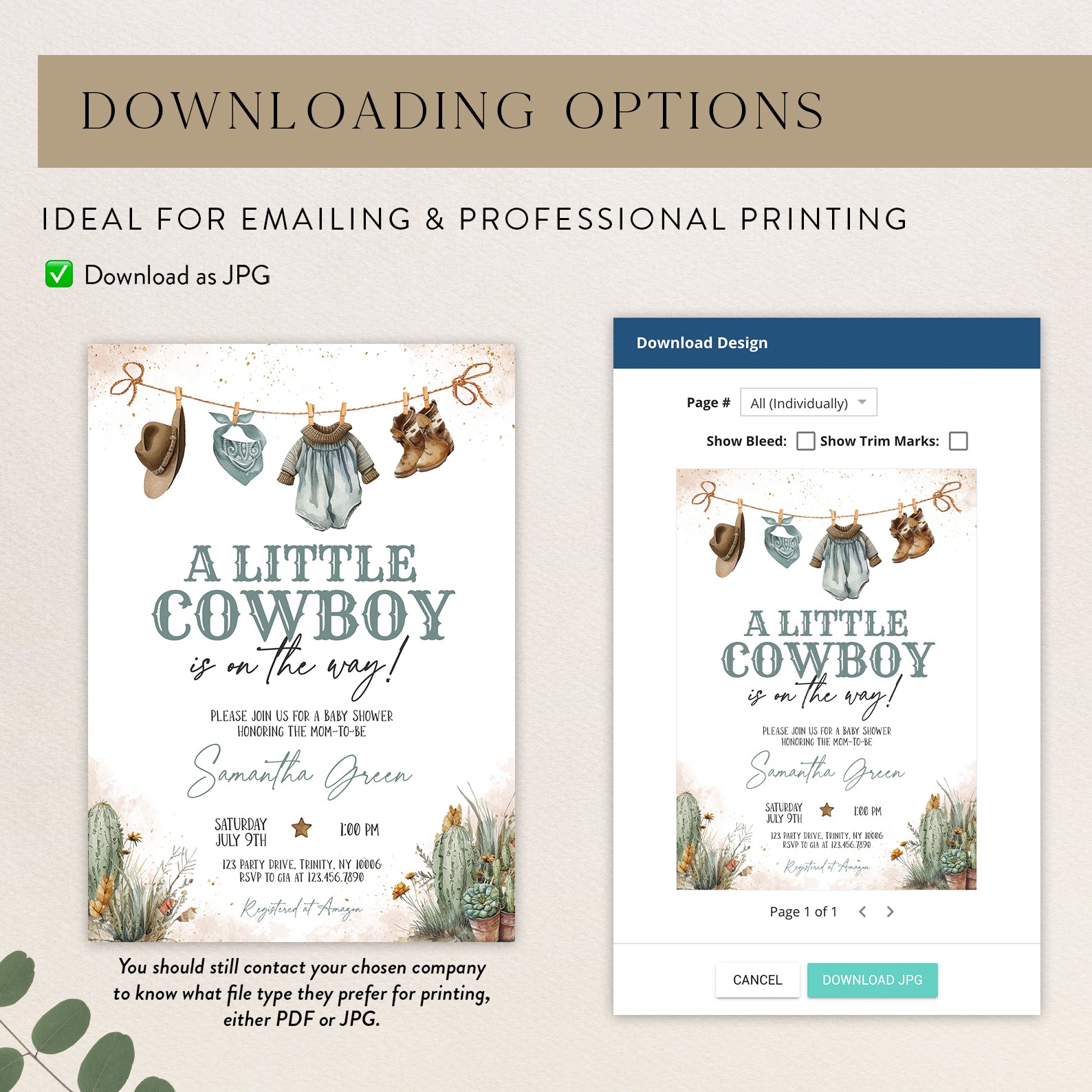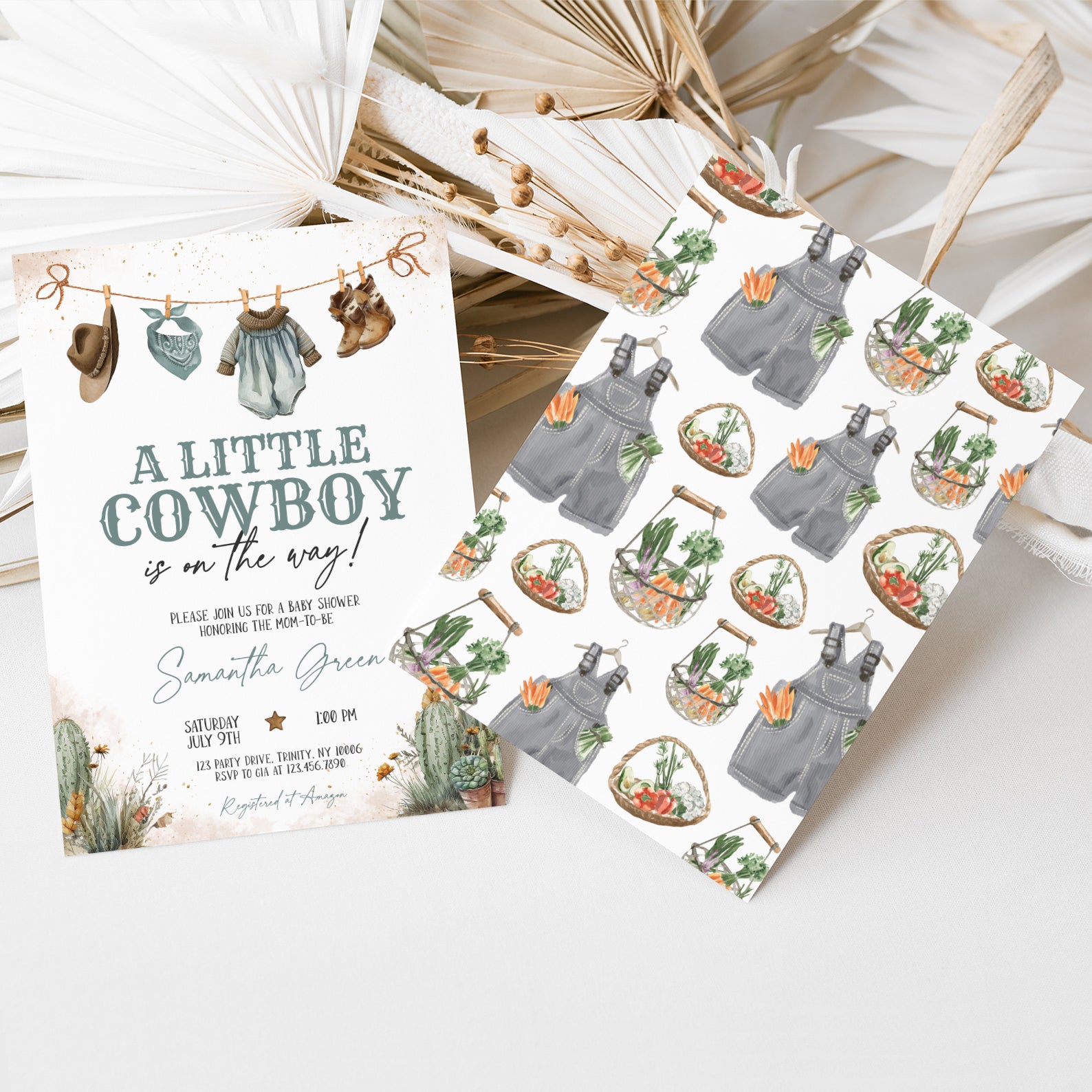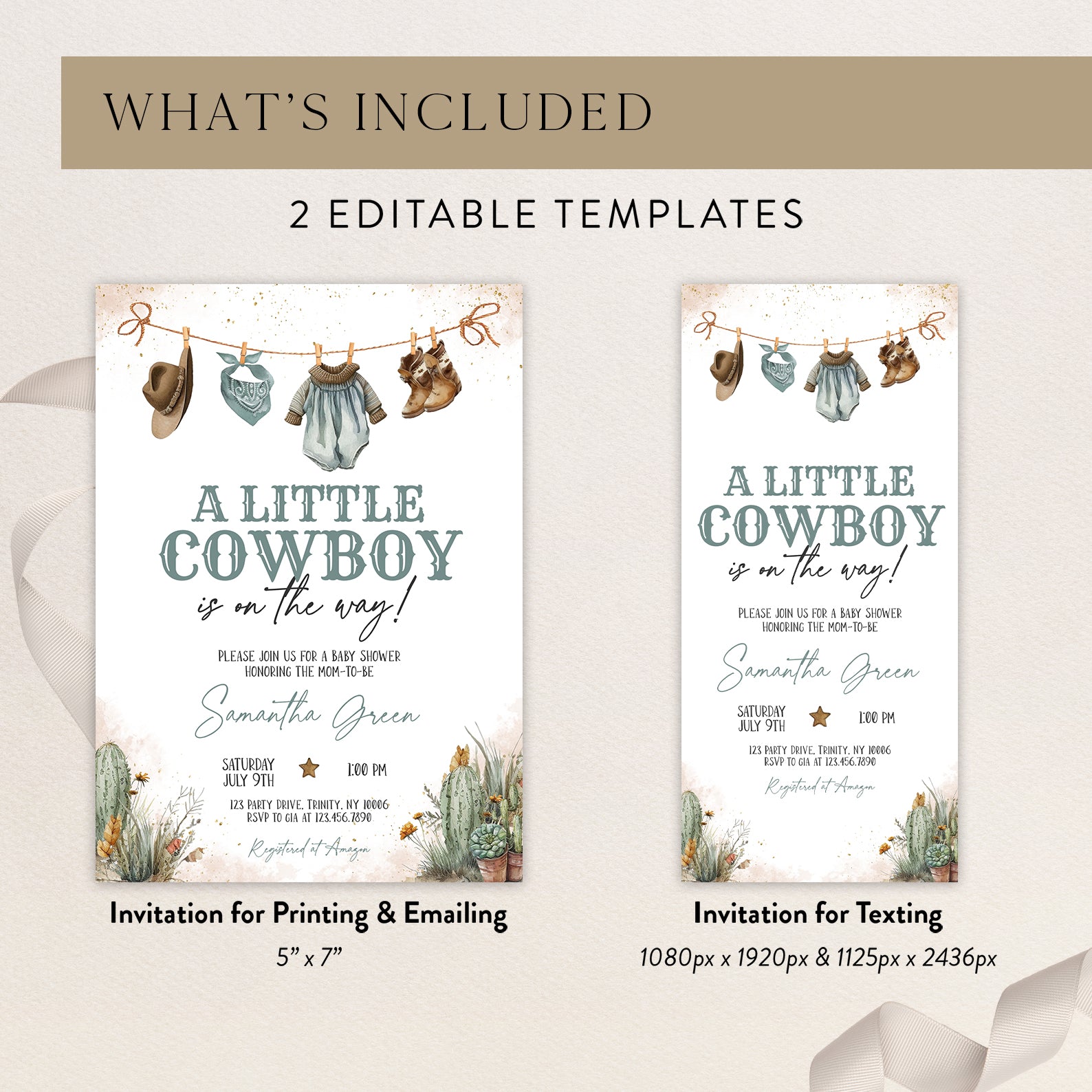 - Purchase this A Little Cowboy Is On the Way: Western Baby Invite Bundle template