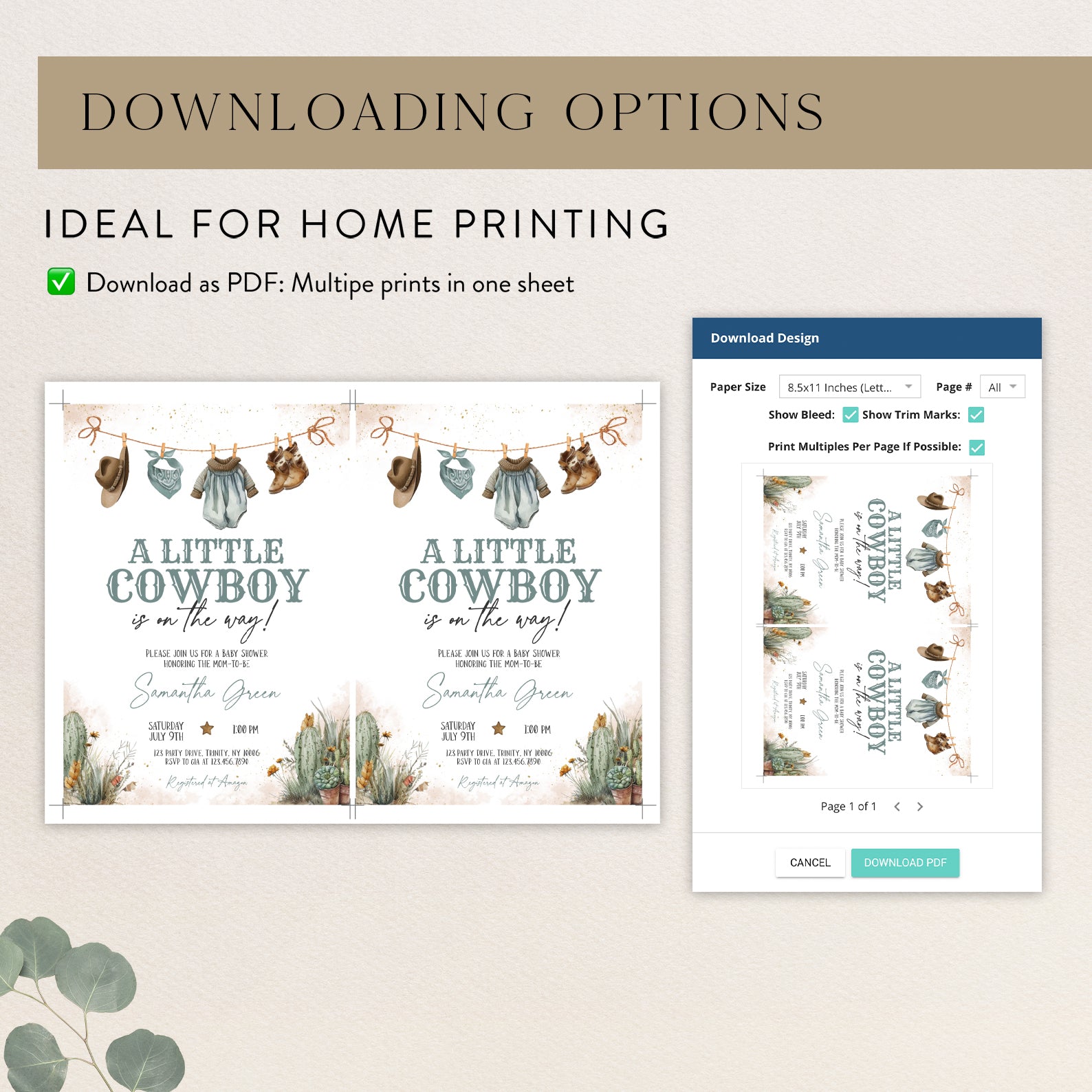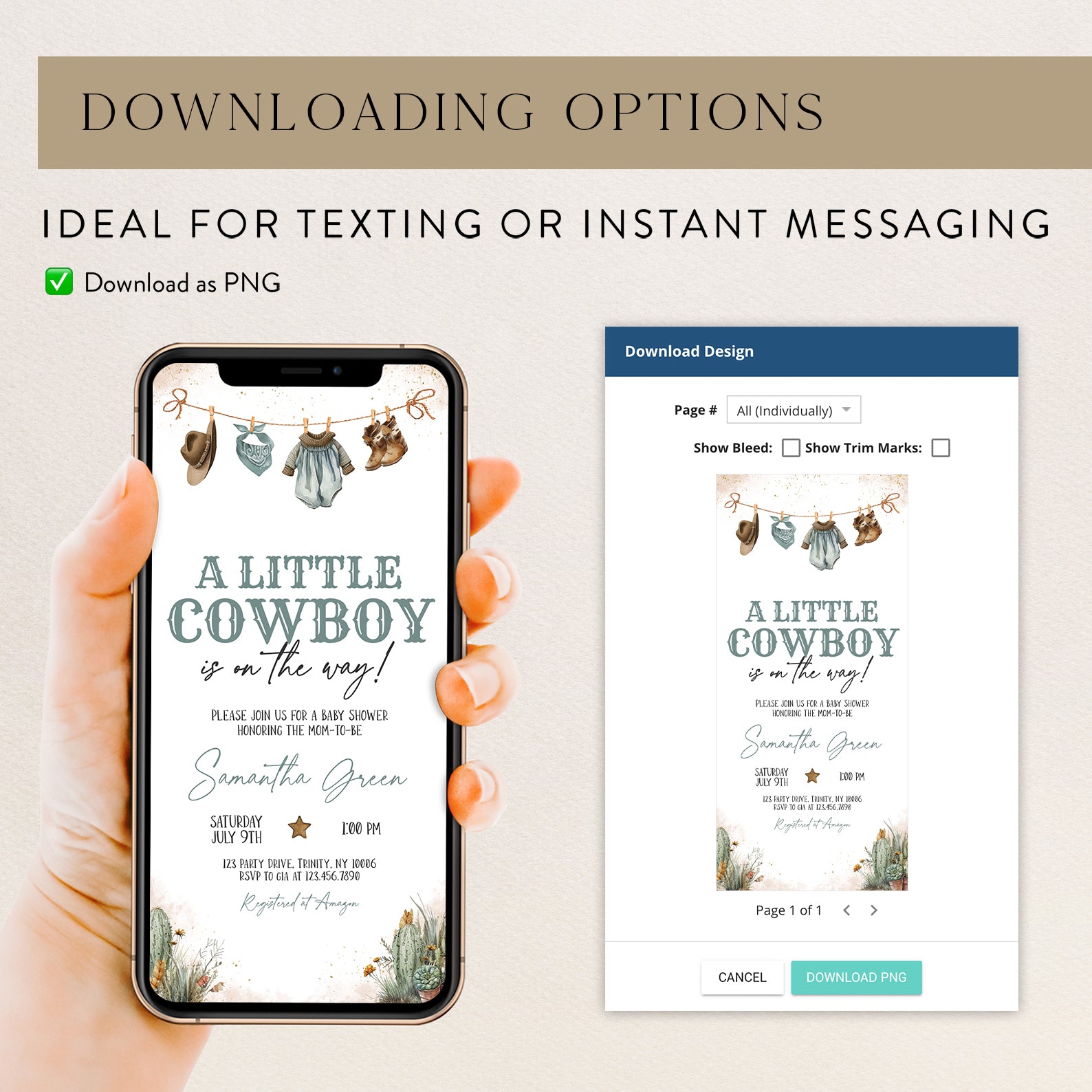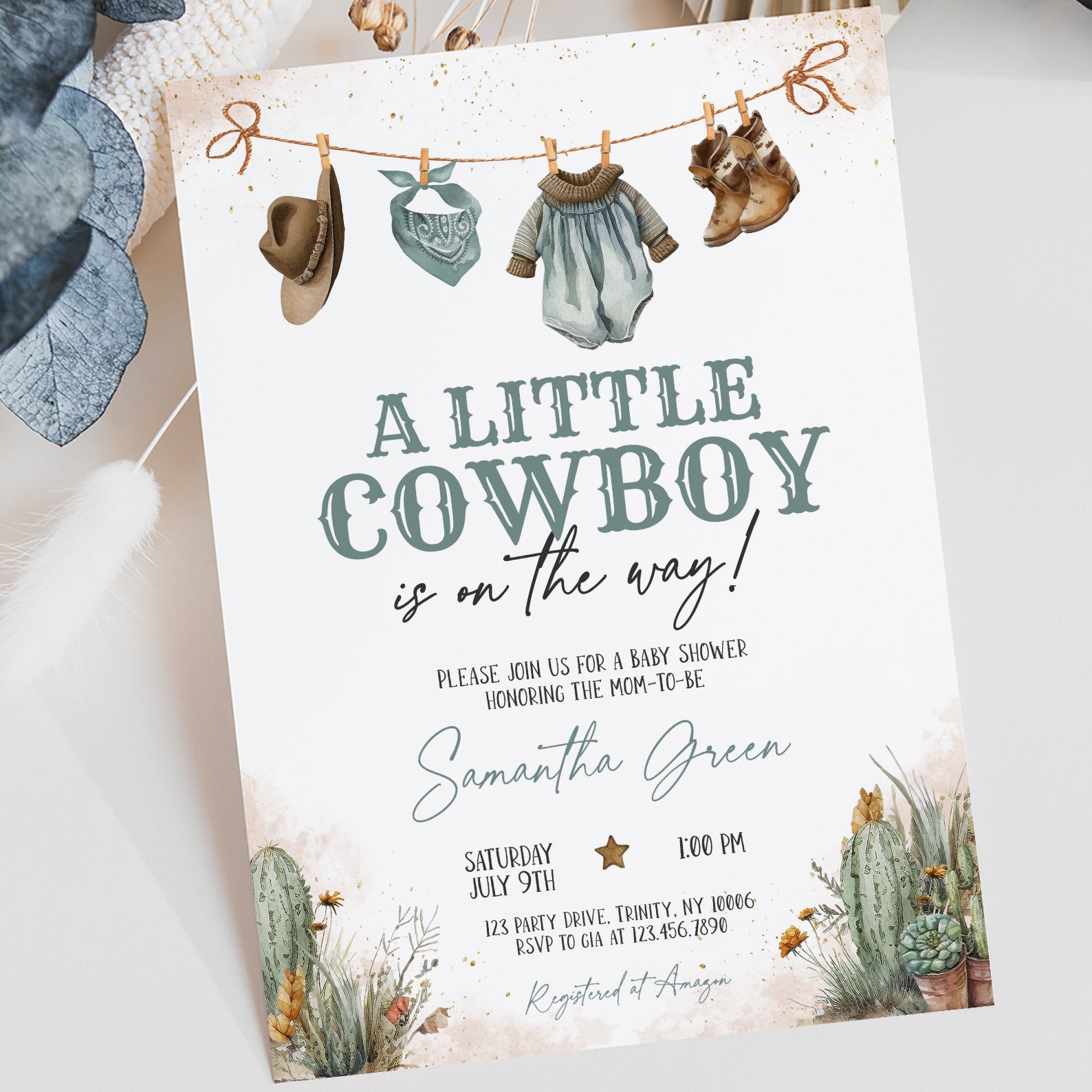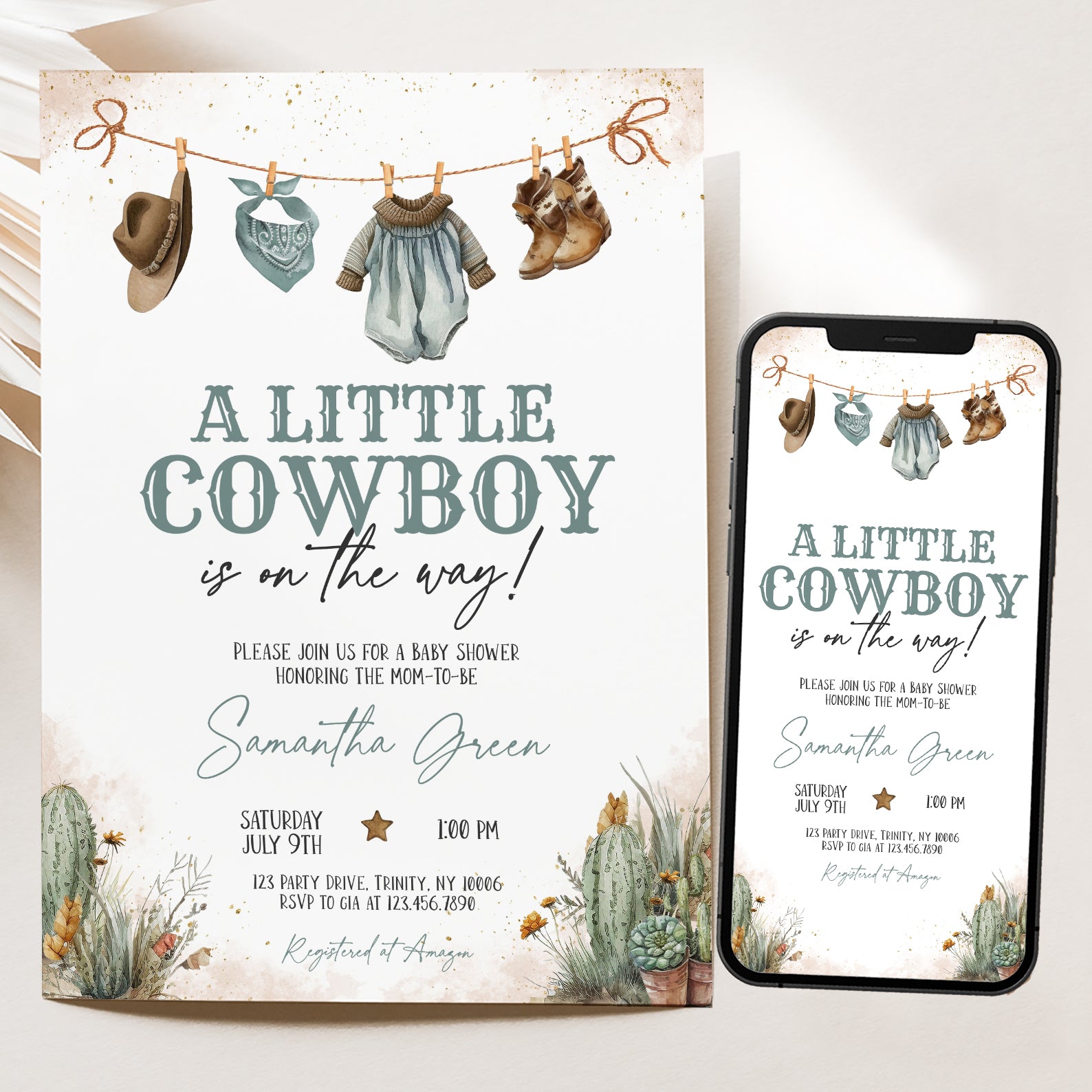 - Purchase this A Little Cowboy Is On the Way: Western Baby Invite Bundle template