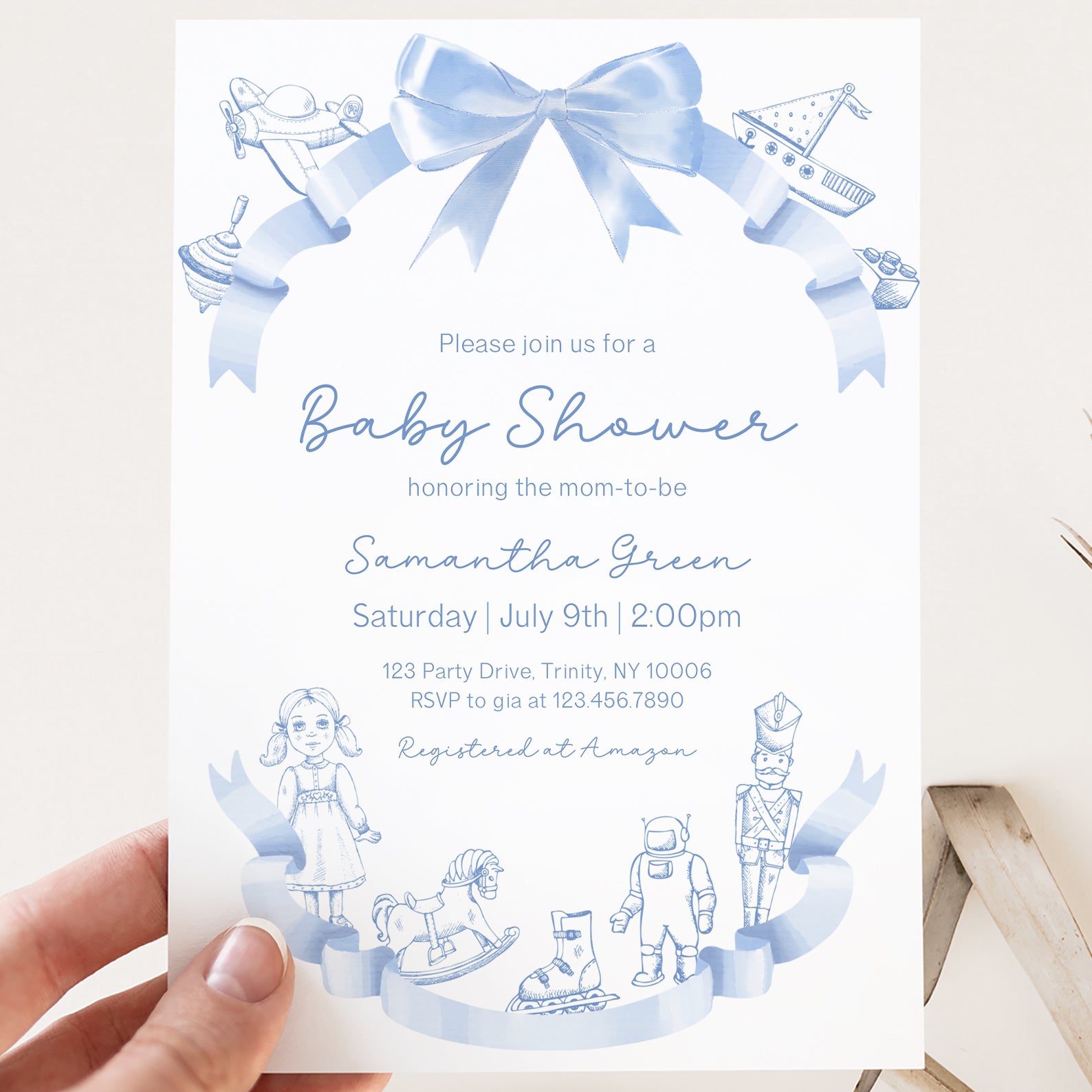 - Purchase this Blue Baby Shower Digital Invite: Toile de Jouy Toys template