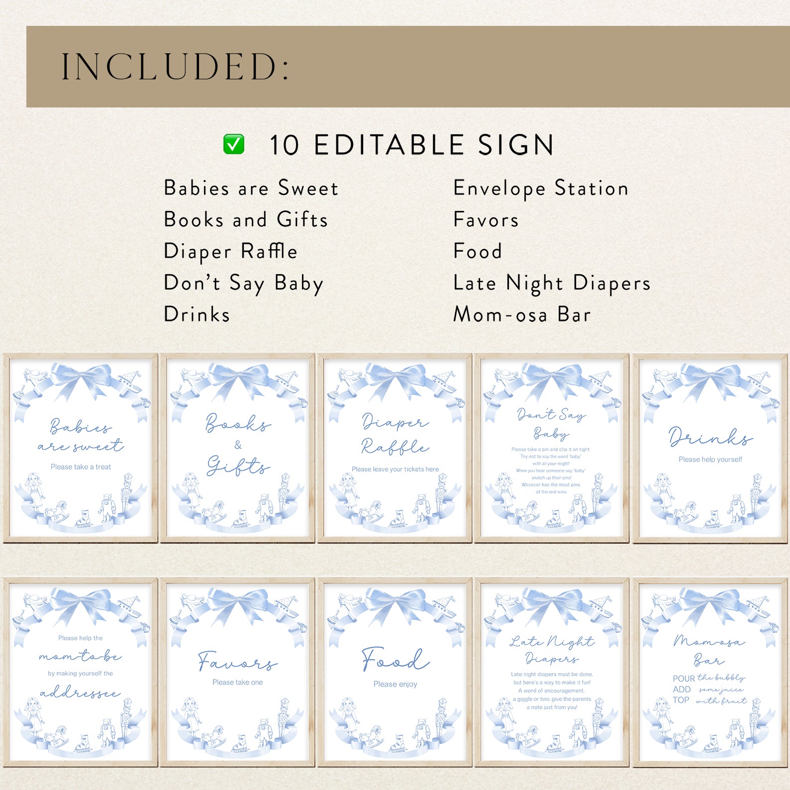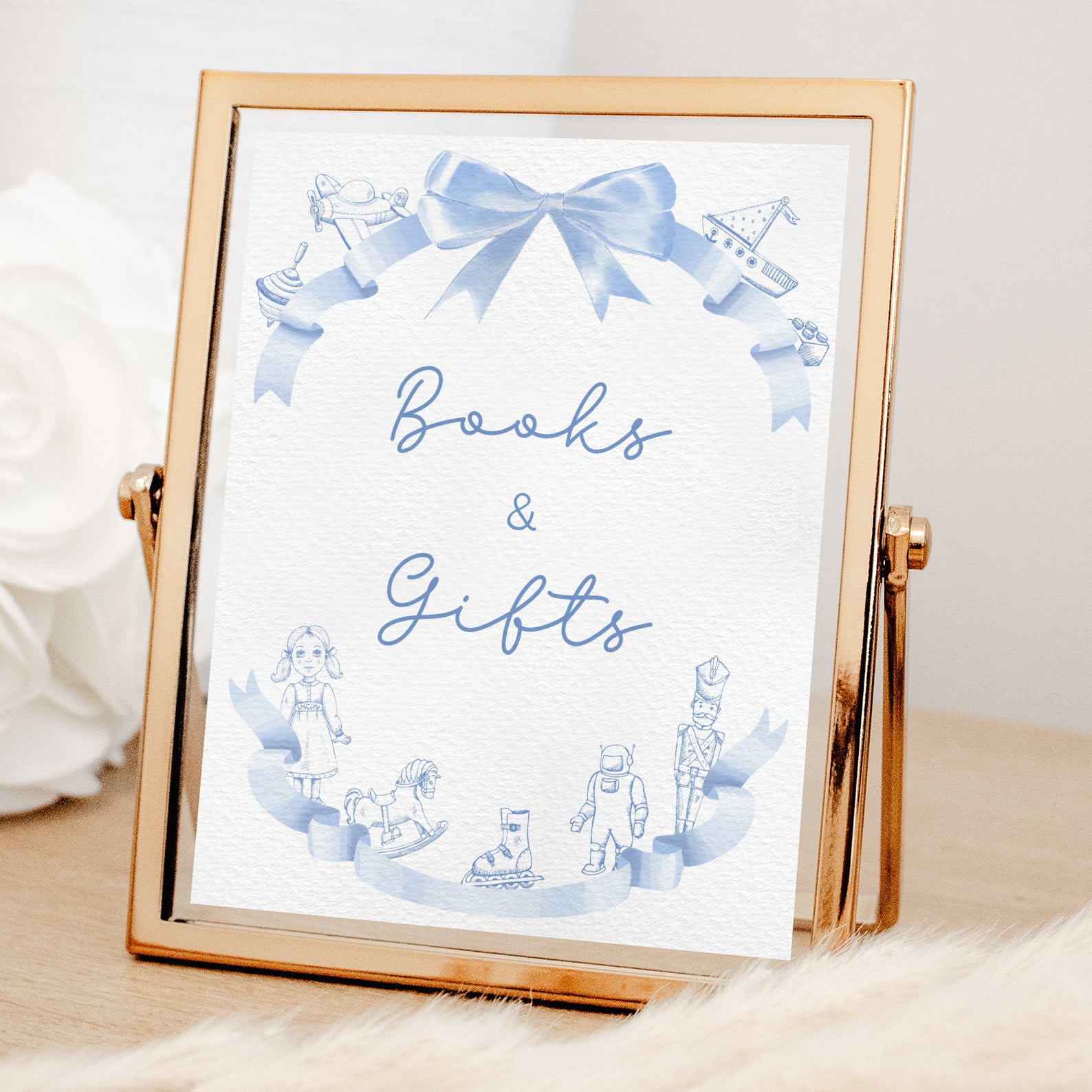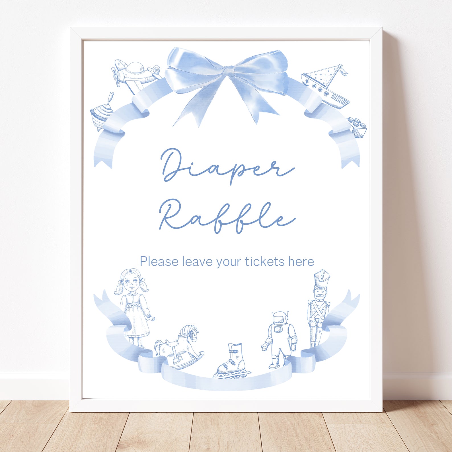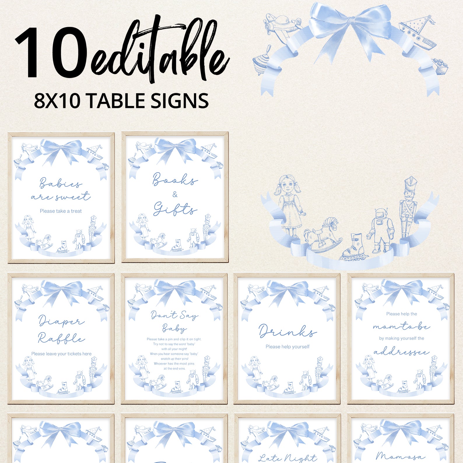 Add a classic touch to your baby shower setup with this elegant set of 10 editable table signs. Designed in a soft blue theme with blue ribbon accents, each sign features a charming toile de Jouy border with whimsical illustrations like a spinning top, airplane, and nutcracker. Includes signs for Babies Are Sweet, Books and Gifts, Diaper Raffle, Don’t Say Baby, Drinks, and more perfect for tying together a timeless and playful celebration.