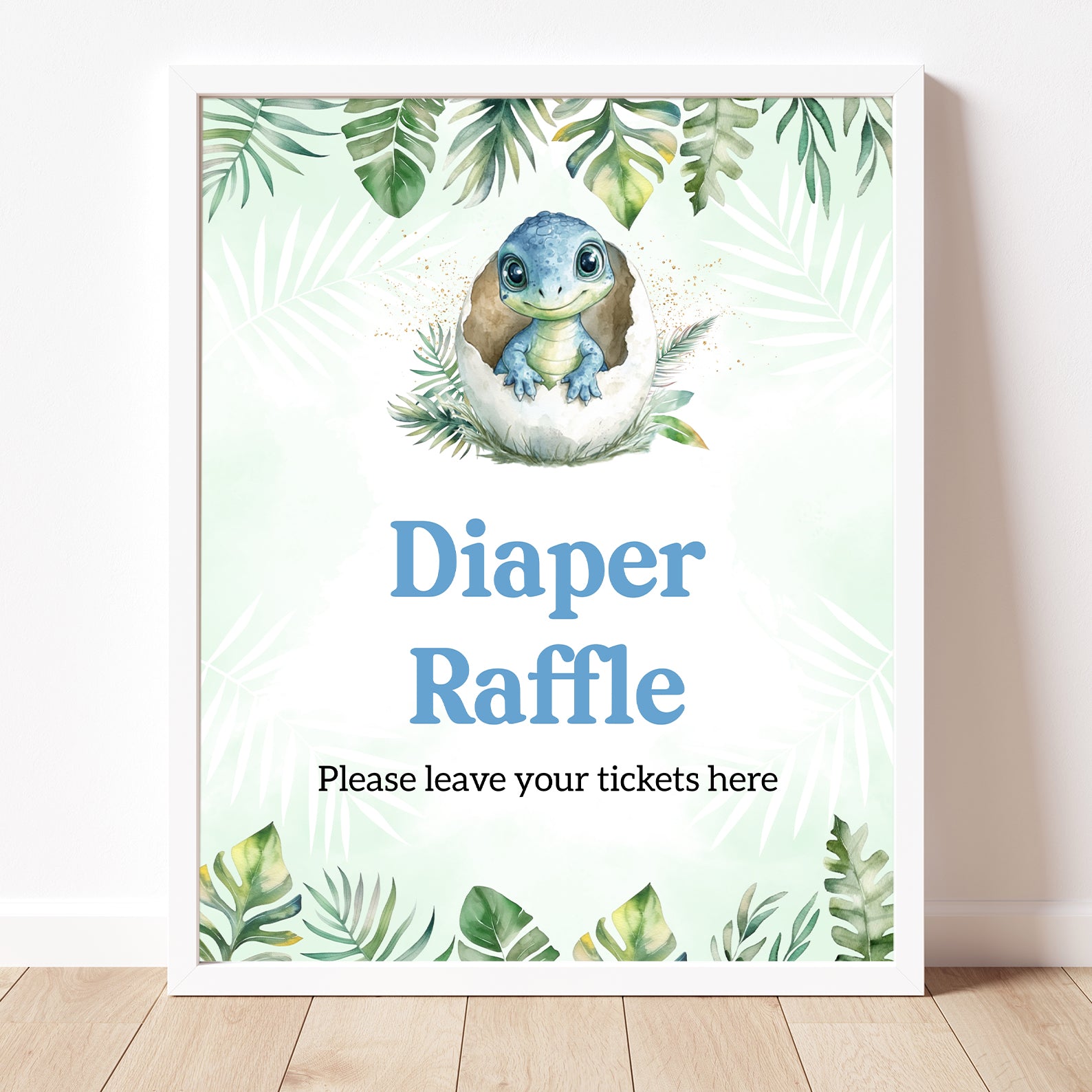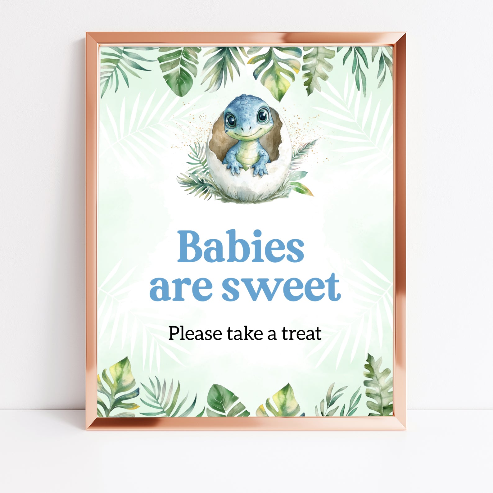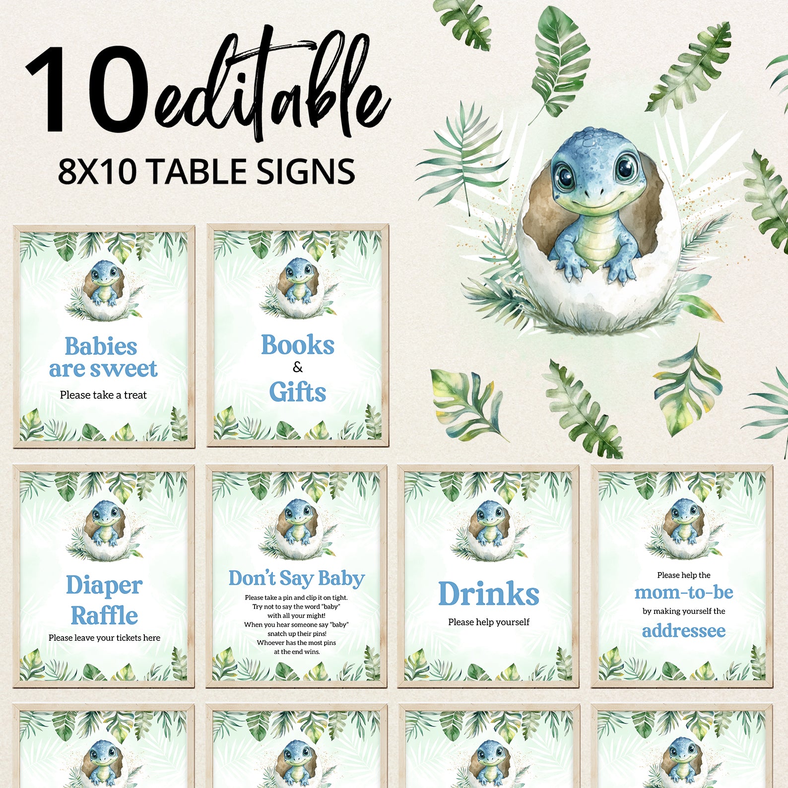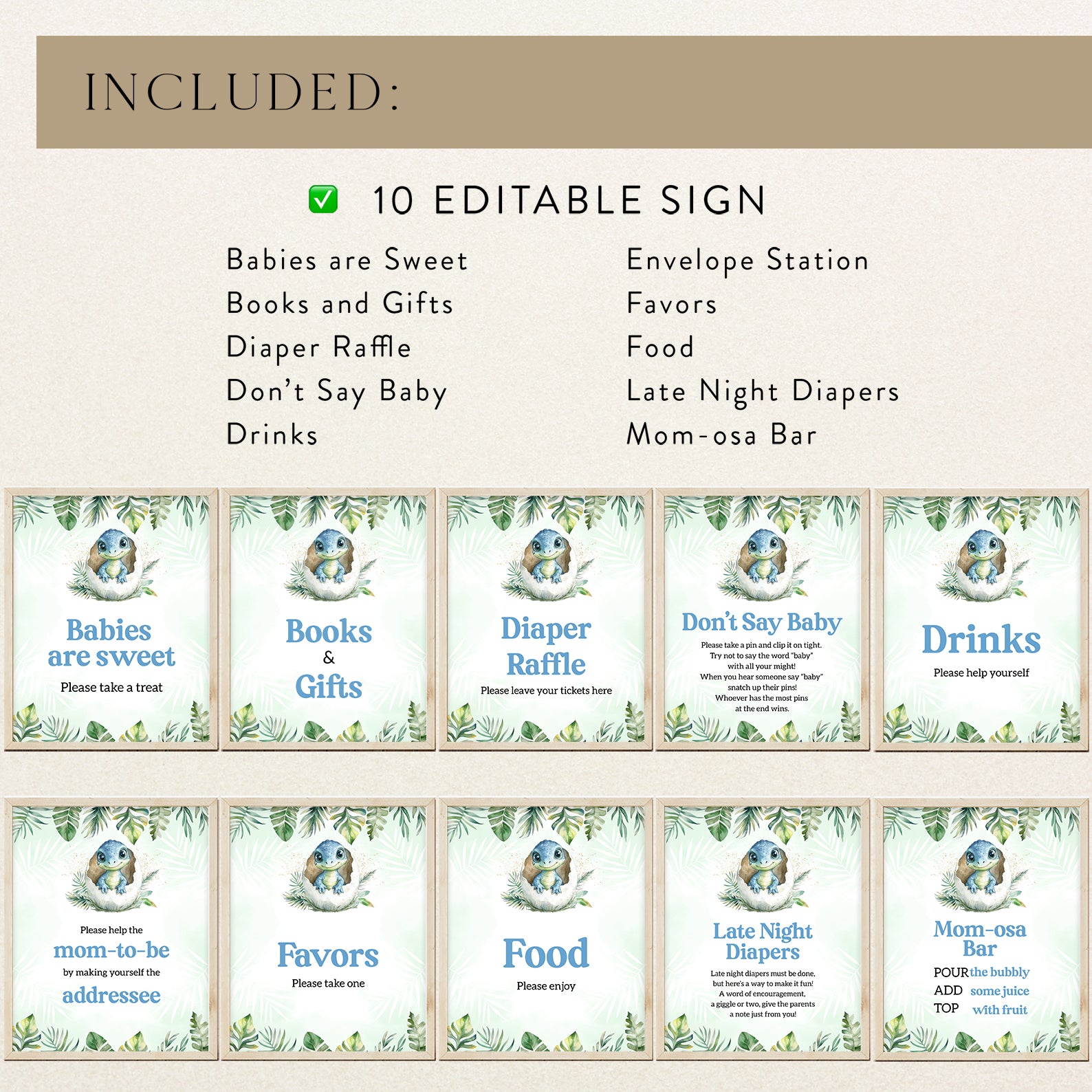 Add a playful prehistoric touch to your baby shower with our dinosaur-themed editable table sign bundle! This set of ten signs includes: Babies Are Sweet, Books and Gifts, Diaper Raffle, Don't Say Baby, Drinks, Envelope Station, Favors, Food, Late Night Diapers, and Mom-osa Bar. Each design features a baby blue dinosaur, cracked egg, and lush green tropical leaves. Perfect for tying your “Hatching Soon” theme together in style!