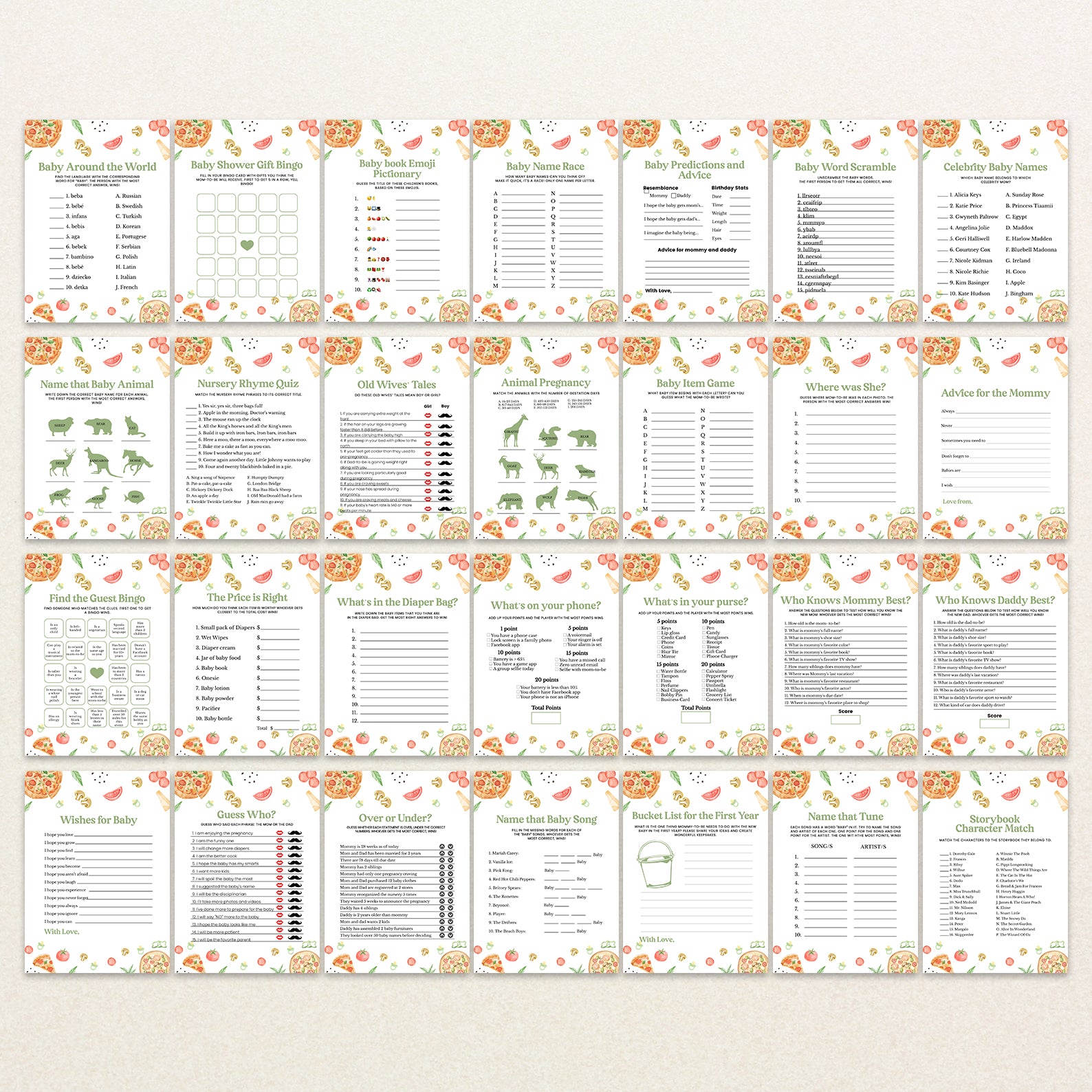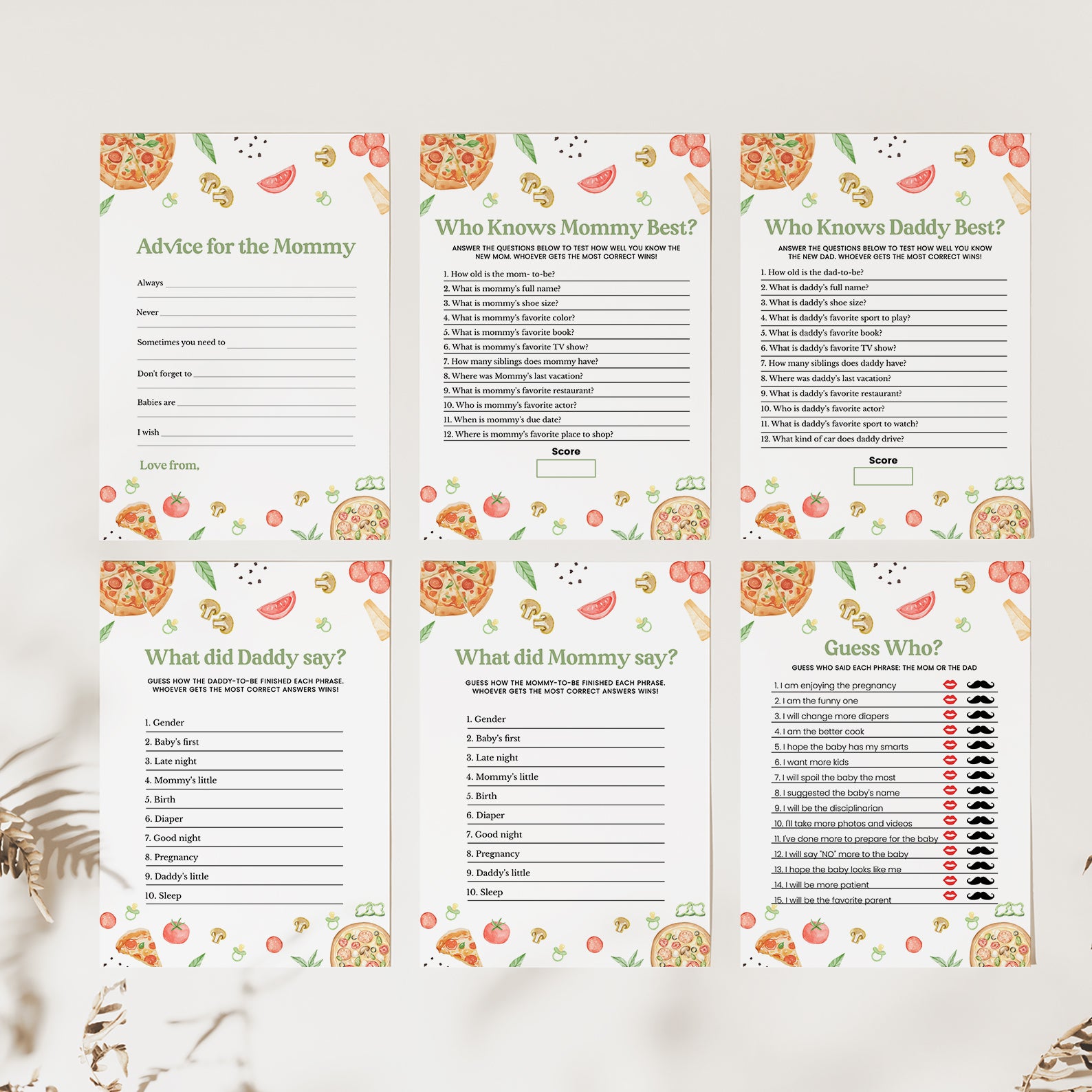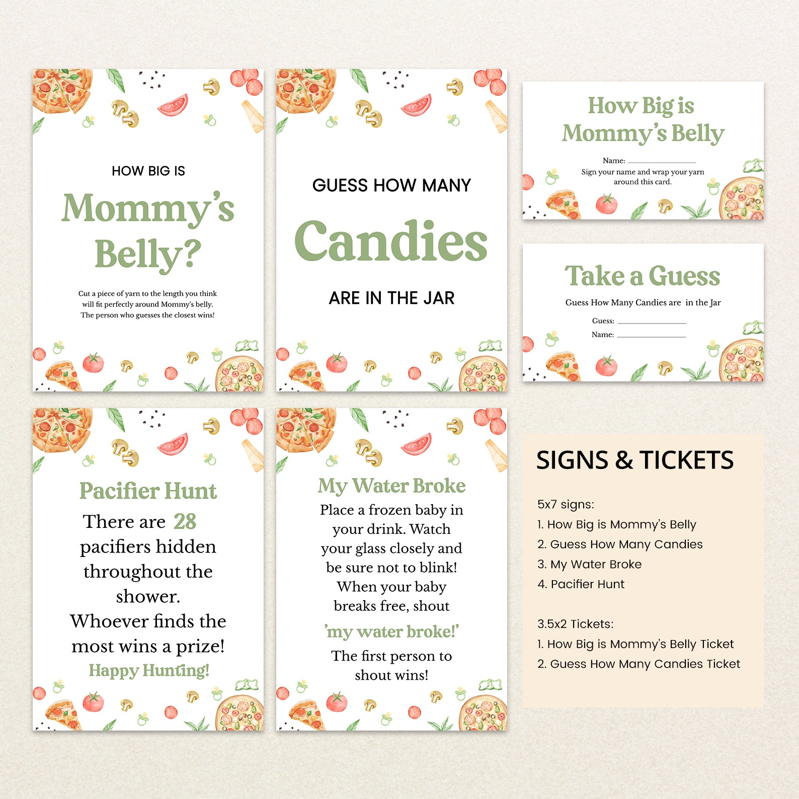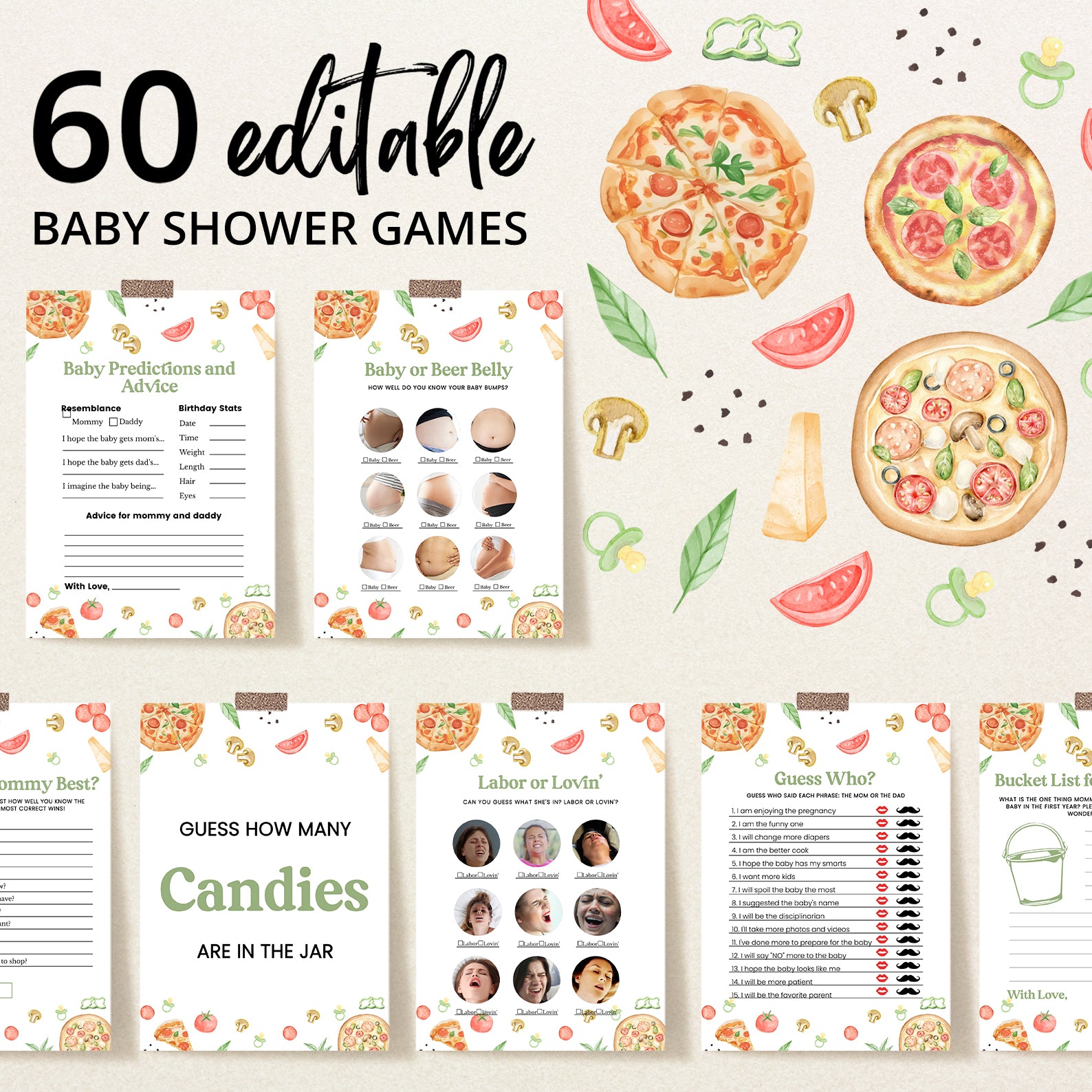 Spice up your baby shower with our fun-filled pizza-themed game bundle! Featuring 60 editable games, this set is perfect for keeping guests entertained. Each game is designed to match the playful "Oh Baby" pizza theme, complete with cheesy slices, mushrooms, tomatoes, and pacifiers. From guessing games to word scrambles, this editable collection adds the perfect flavor to your celebration!