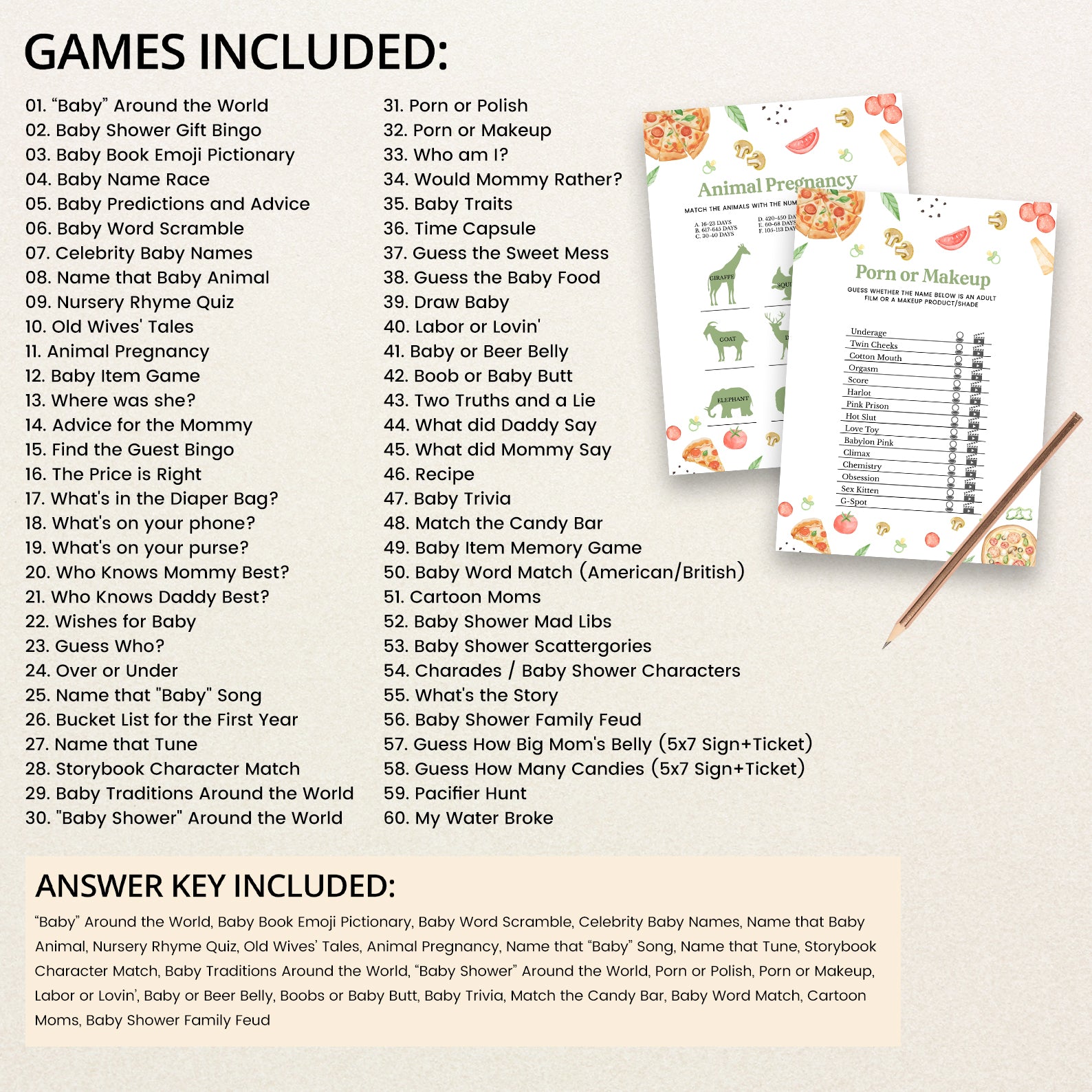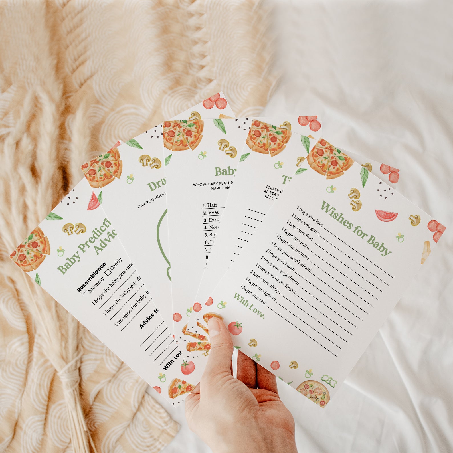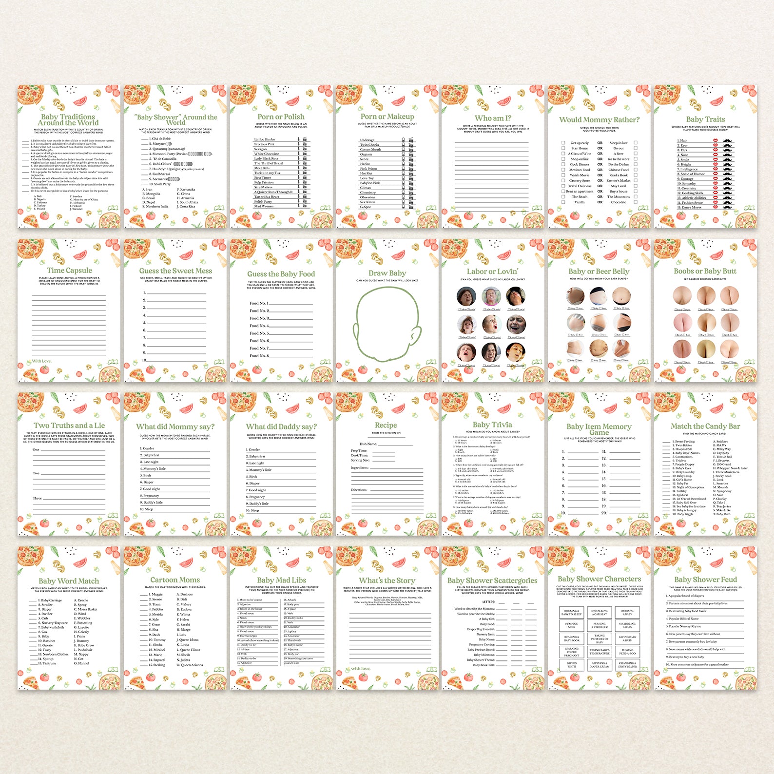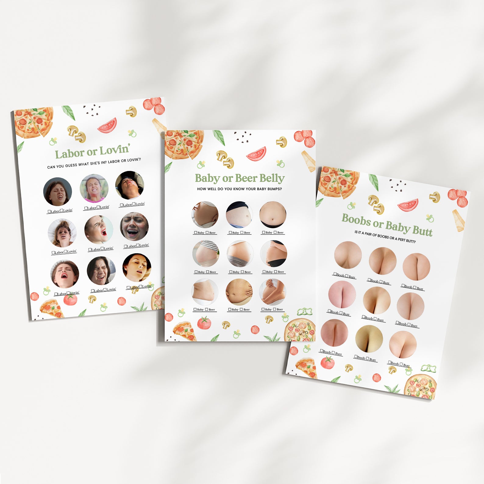 Spice up your baby shower with our fun-filled pizza-themed game bundle! Featuring 60 editable games, this set is perfect for keeping guests entertained. Each game is designed to match the playful "Oh Baby" pizza theme, complete with cheesy slices, mushrooms, tomatoes, and pacifiers. From guessing games to word scrambles, this editable collection adds the perfect flavor to your celebration!