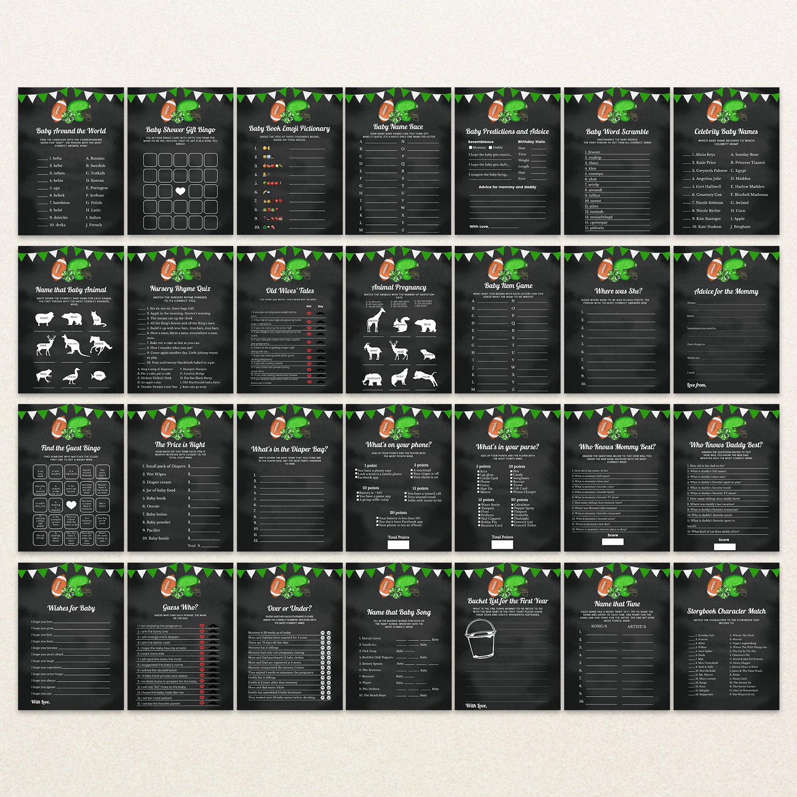 Add a winning play to your baby shower with our Touchdown It’s a Boy Game Bundle! This all-star set includes 60 editable baby shower games, each designed to match the sporty football theme. With a bold black background, green and white accents, football details, and playful typography, this bundle is perfect for keeping guests entertained. From classics to fun twists, these games are easy to customize and print for your little MVP’s big celebration!