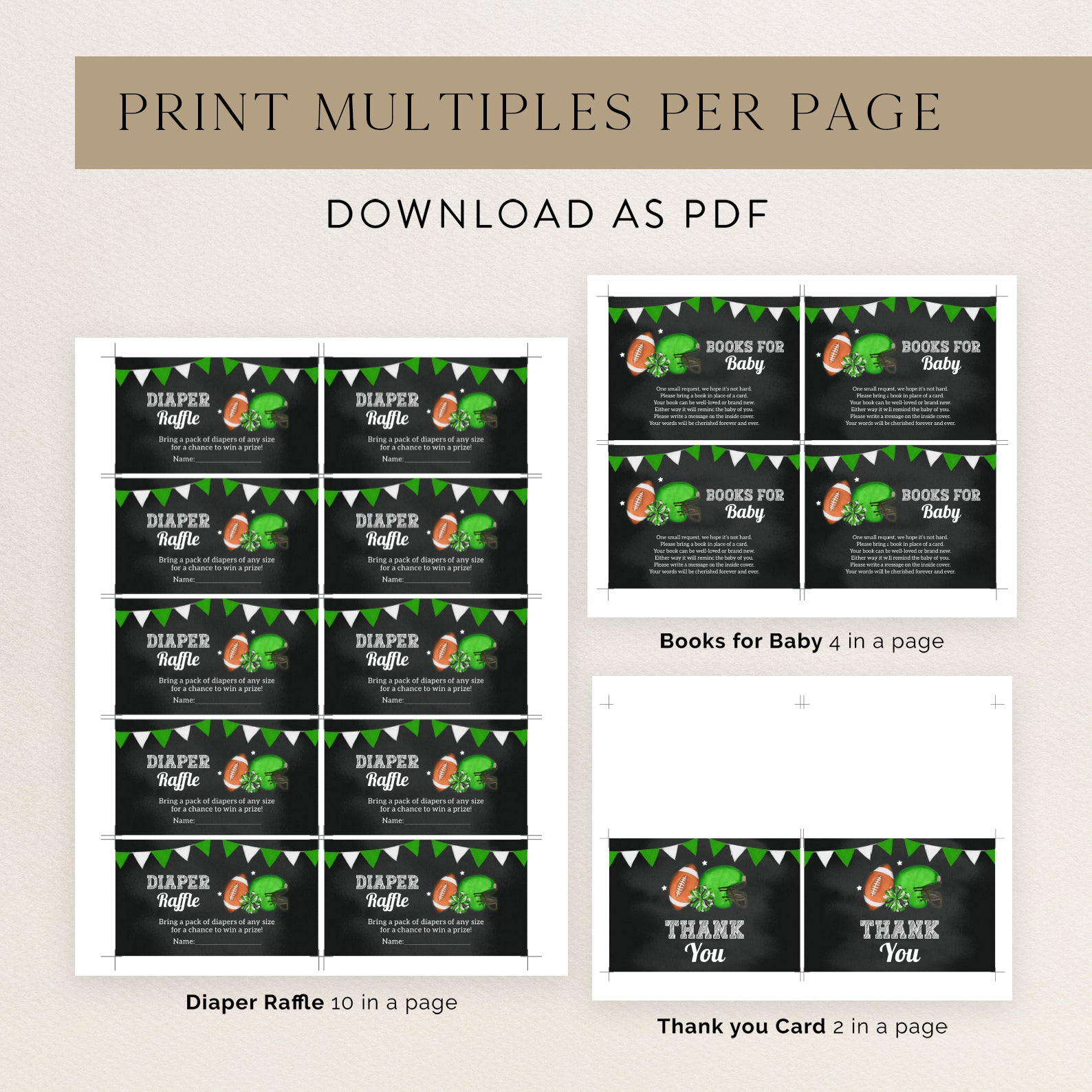 Celebrate your little MVP with this fun football-themed baby shower bundle! Featuring a black background with sporty touches like a green pom pom, football, helmet, and triangle banner, this set includes a digital invitation, mobile invite, diaper raffle card, books for baby card, and thank you card. Designed for easy customization and sharing, it’s the perfect way to kick off a winning baby shower for your future all-star!