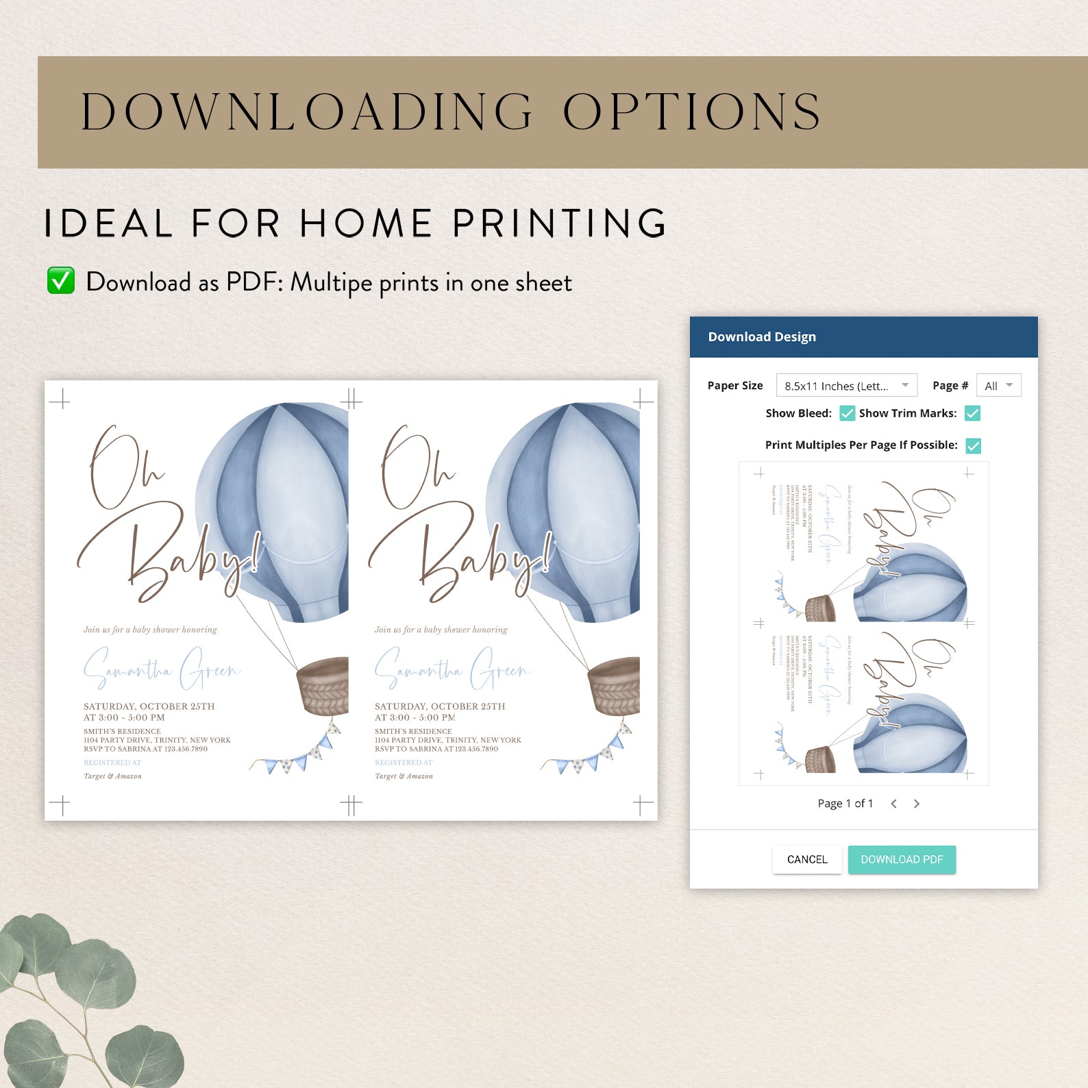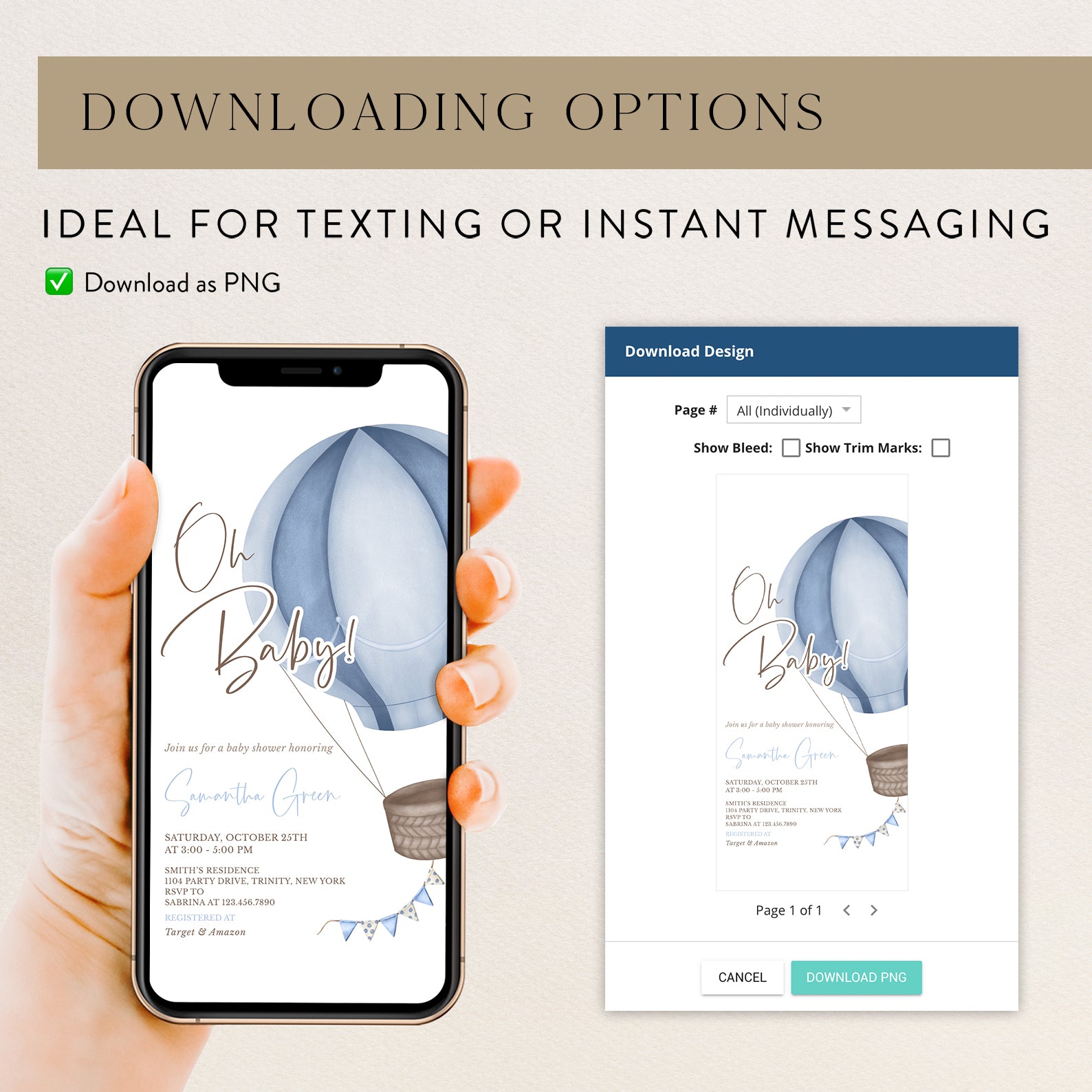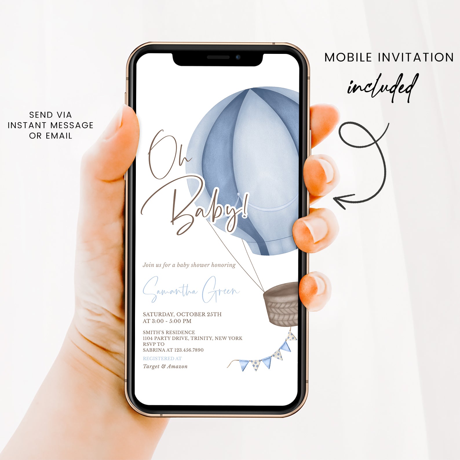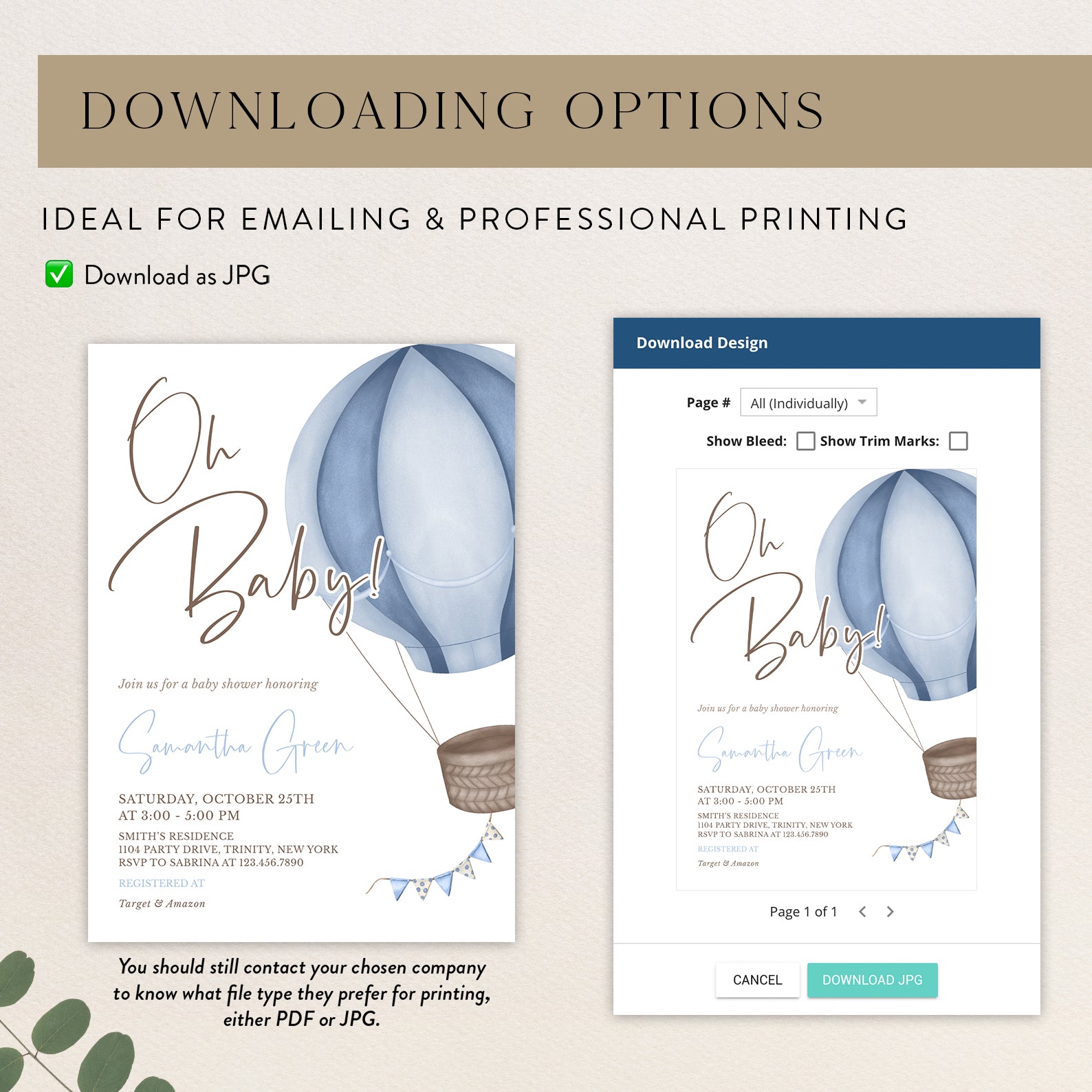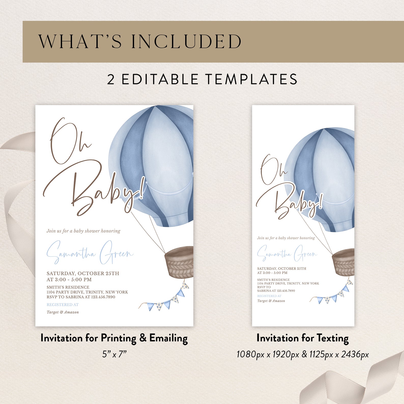 - Purchase this Oh Baby Hot Air Balloon Invite: Blue & Brown Baby Shower template