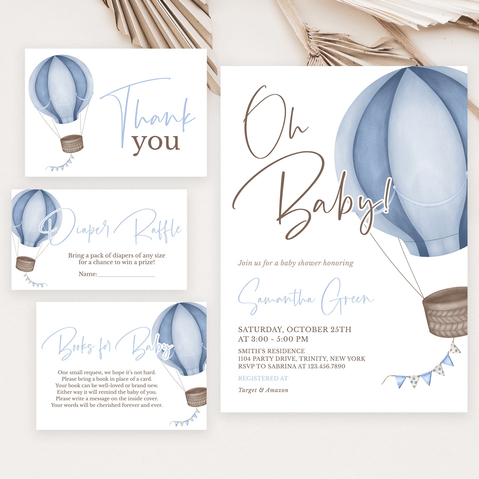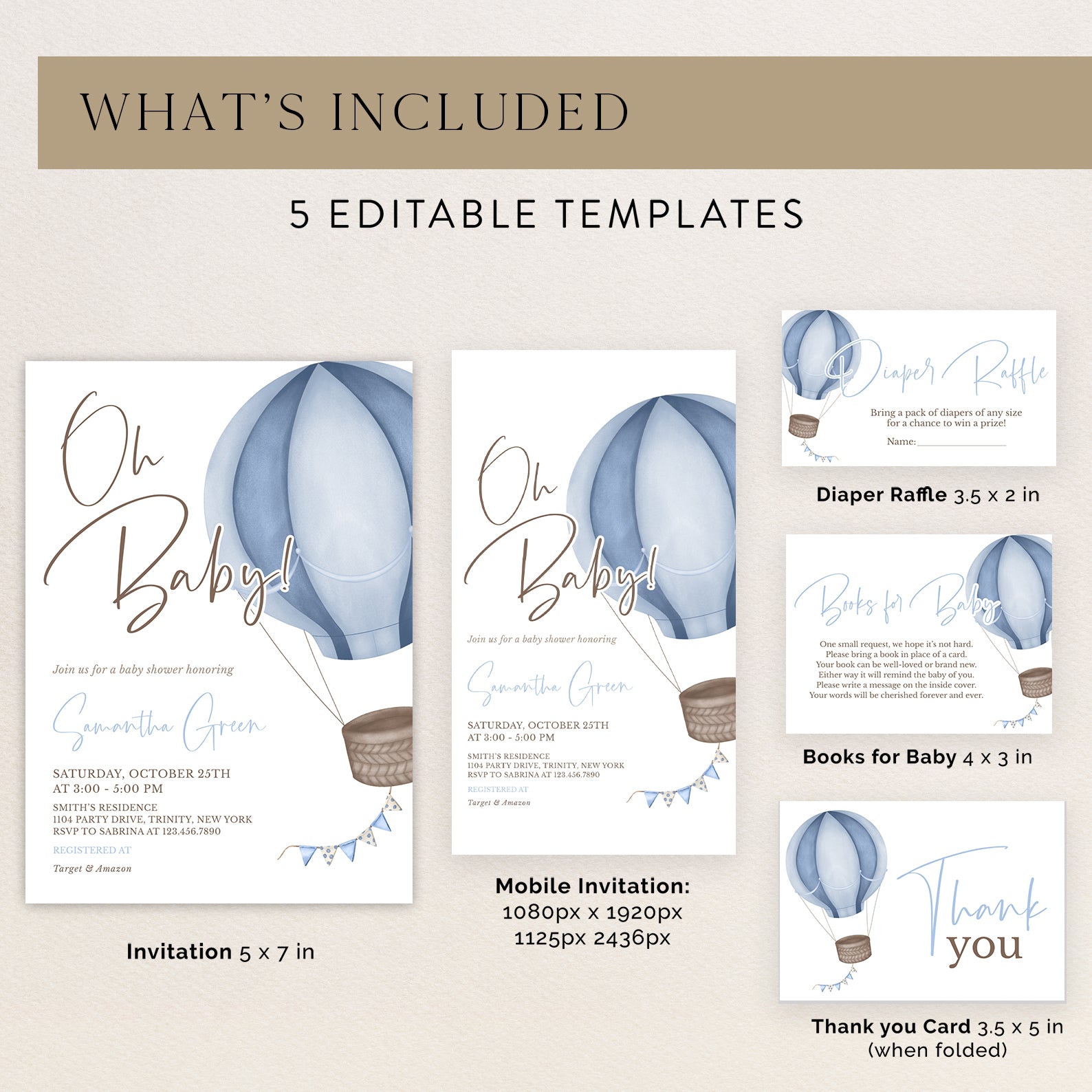 - Purchase this Oh Baby Hot Air Balloon Invite Bundle: Blue & Brown Baby Shower template