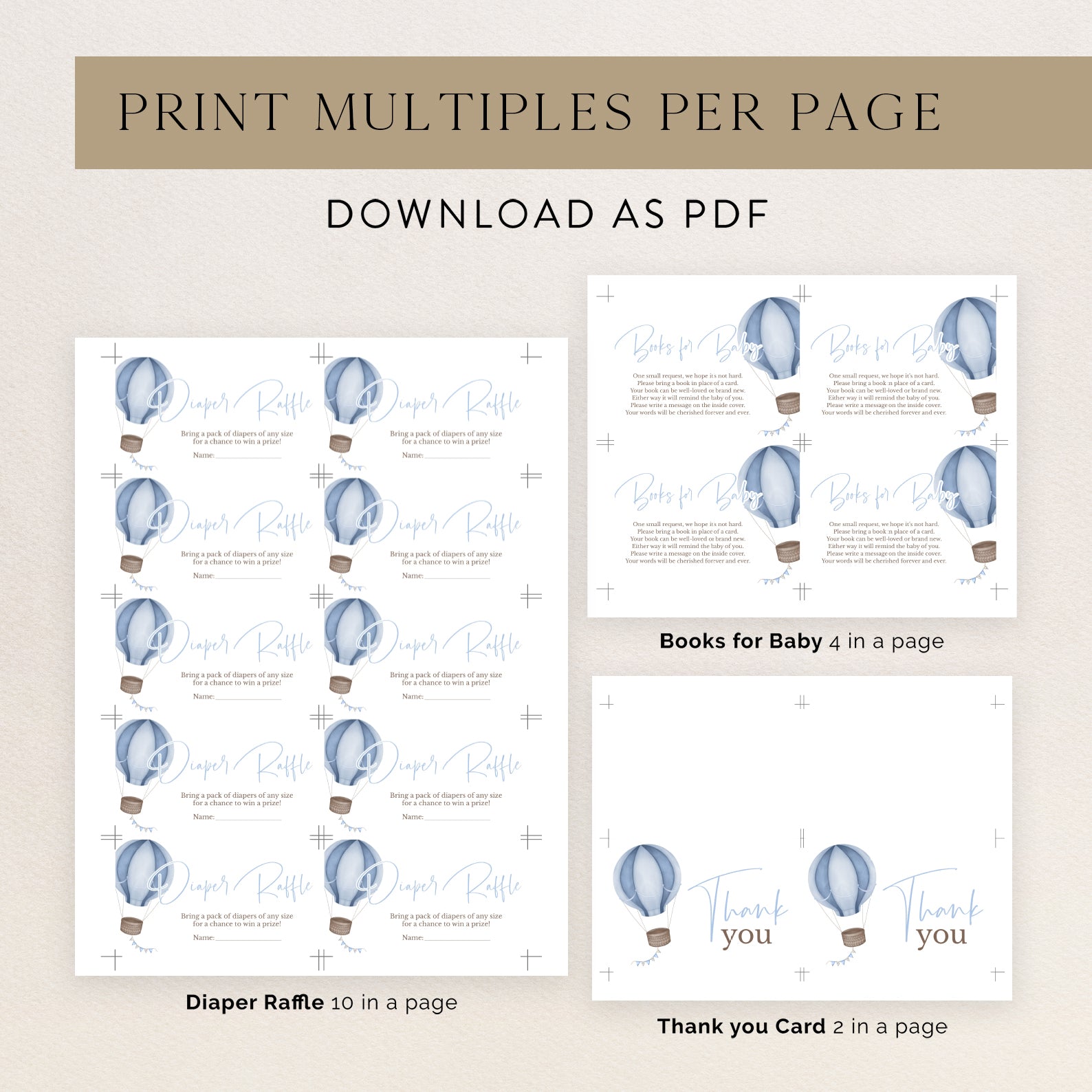 Celebrate your baby boy’s arrival with this charming blue and brown baby shower bundle! Featuring a whimsical hot air balloon and playful banner accents, this set includes a digital invitation, mobile version, diaper raffle card, books for baby insert, and a thank you card. With coordinated designs and easy customization, it’s the perfect way to set a joyful tone for your celebration.