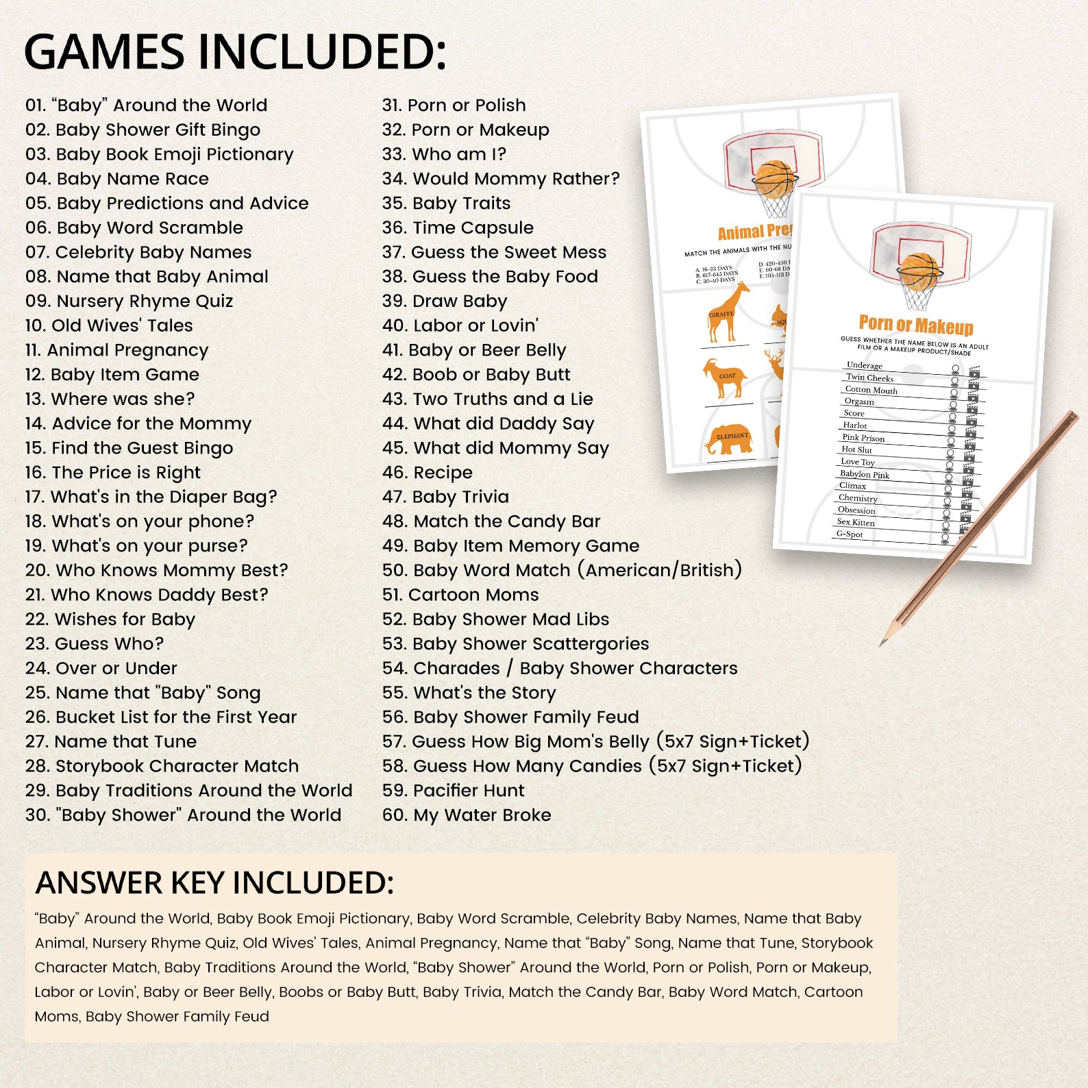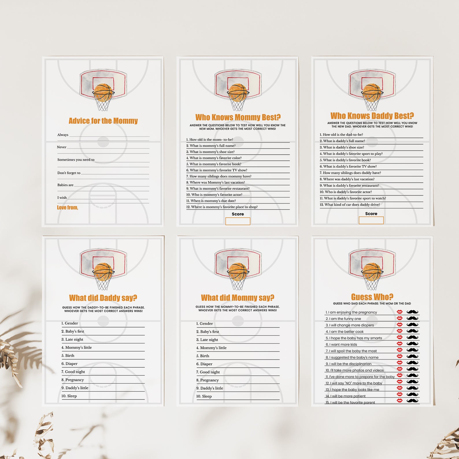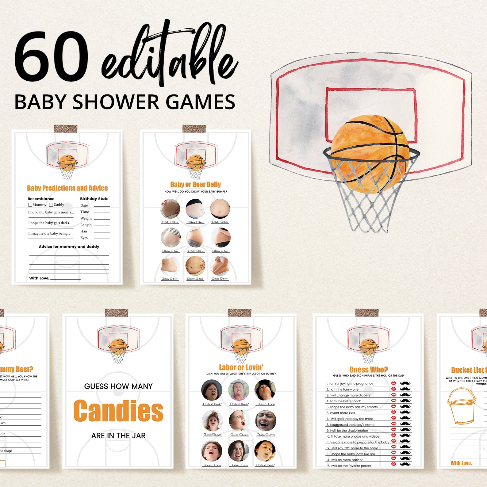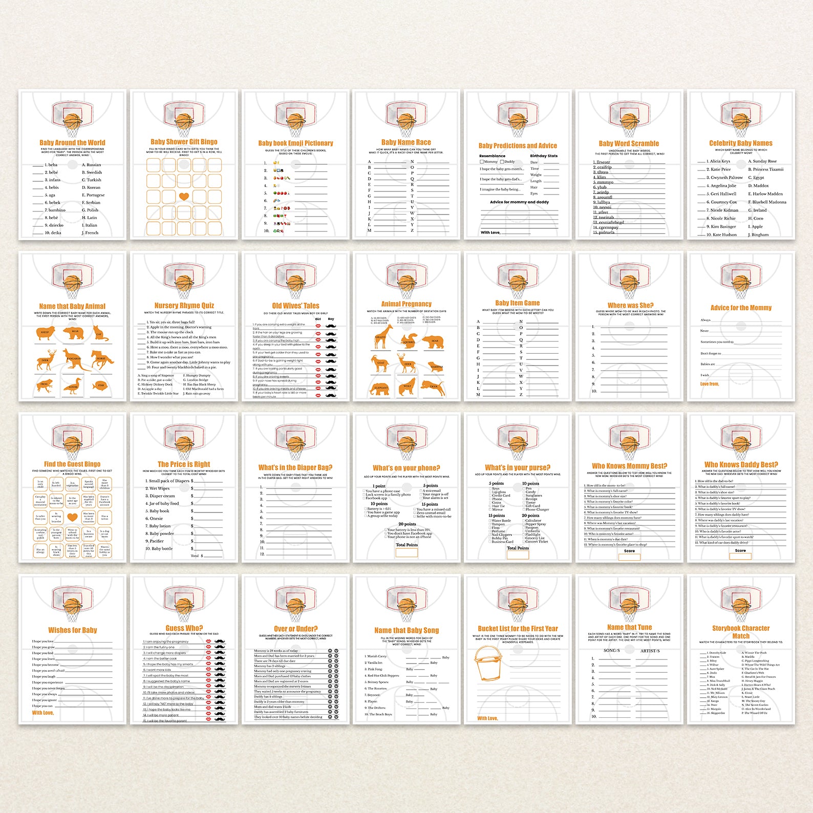 Keep the party lively with this basketball-themed baby shower game bundle! Featuring 60 editable games, this set is perfect for parents who love a good challenge. Designed to match your sporty celebration, each game adds fun and excitement for guests of all ages. From trivia to word games, keep the energy high and everyone engaged as you honor your little champ’s big debut!