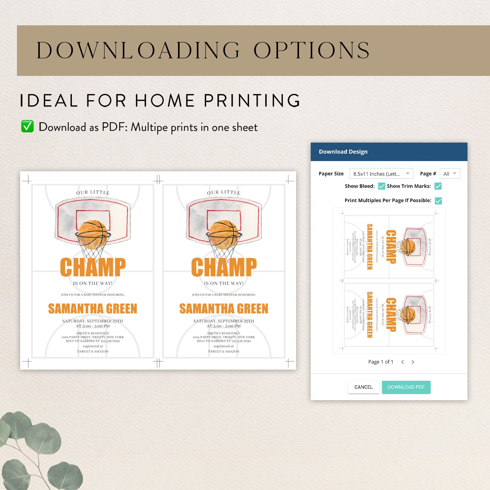 Get ready to celebrate your little MVP with our "Our Little Champ is on the Way" digital baby shower invitation! Featuring a vibrant top view of a basketball court, this invitation sets the perfect tone for a fun and sporty celebration. The eye-catching basketball ring and ball at the top add a playful touch, making it ideal for basketball-loving parents. Easily customizable and instantly downloadable, this invitation ensures your guests will be excited to join in the festivities. Score big with this unique invite and make your baby shower unforgettable!