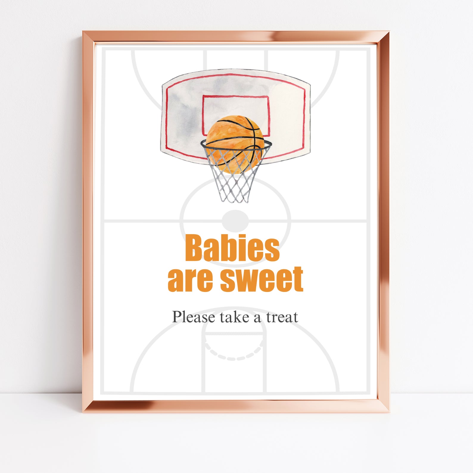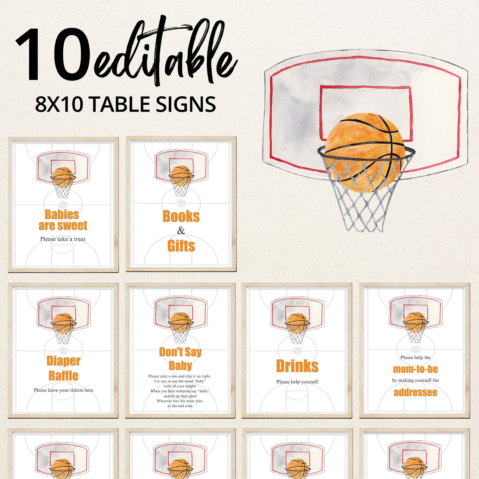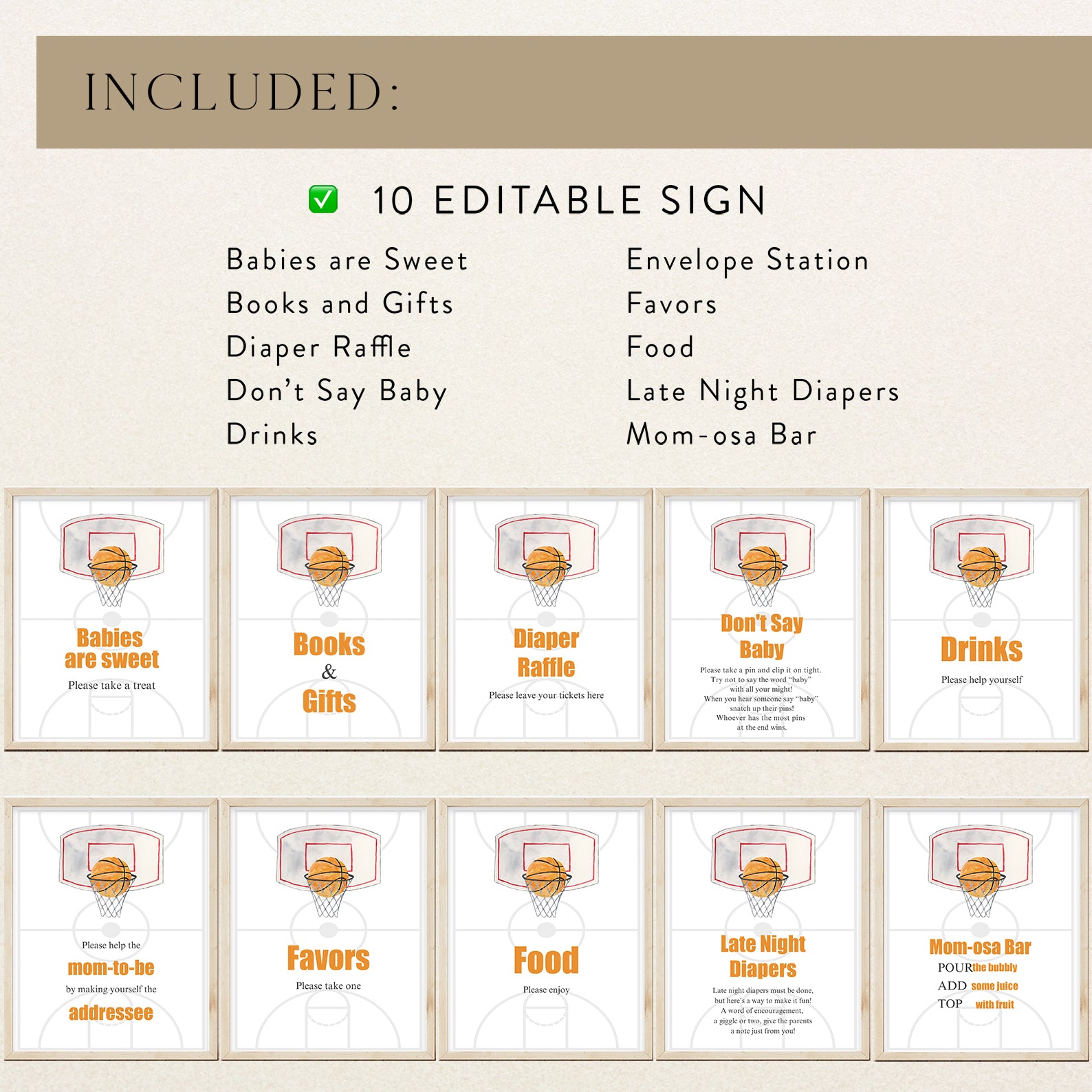 Add a sporty touch to your baby shower with this basketball-themed table sign bundle! Designed with a top-view basketball court background and playful hoop and ball accents, each of the ten editable signs like Mom-osa Bar, Diaper Raffle, and Babies Are Sweet brings fun and function to your event. Perfect for organizing stations while keeping the theme energetic and cohesive for your little champ’s big celebration.