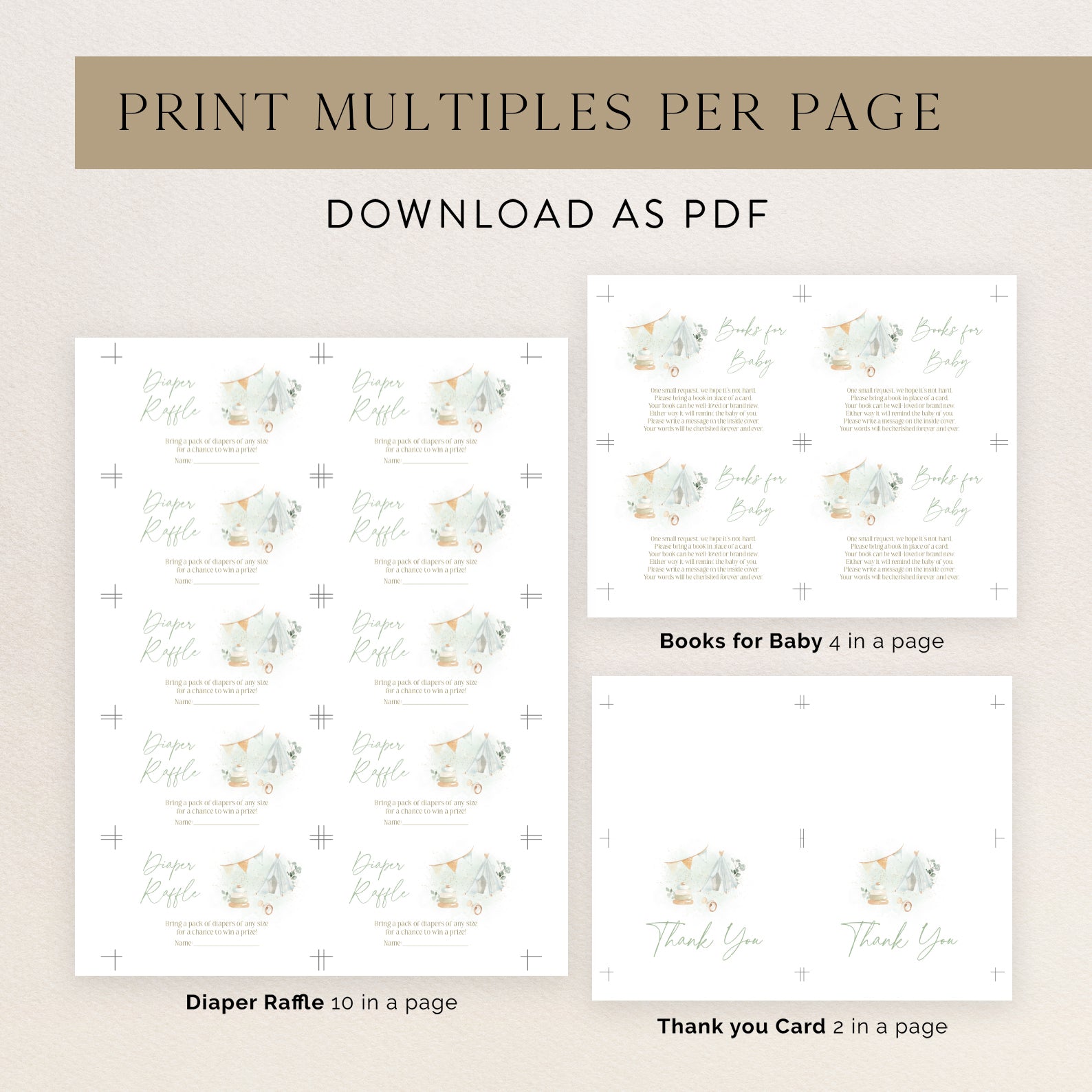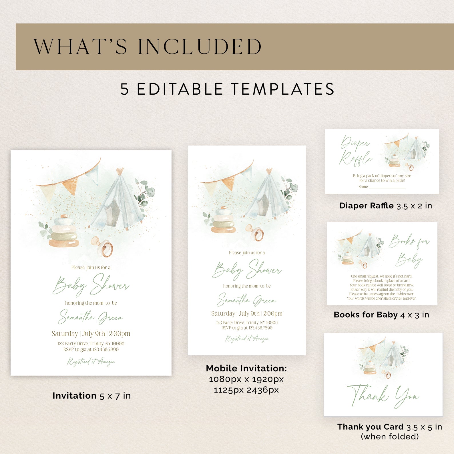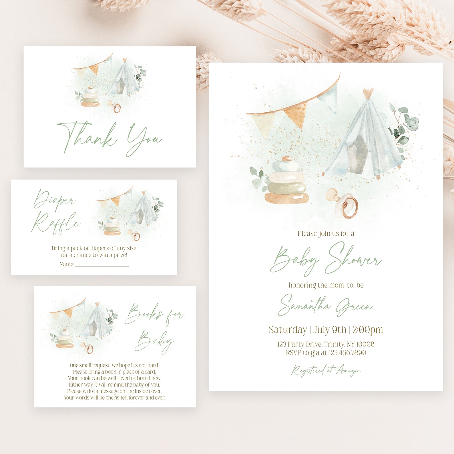 Celebrate your baby shower with this minimalist green and brown invitation bundle, featuring soft watercolor elements like a teepee tent, pacifier, and cozy towels with gold accents. This set includes a printable invitation, mobile invite, diaper raffle card, books for baby insert, and thank you card—everything you need to host a stylish and heartfelt event with a natural, whimsical touch.