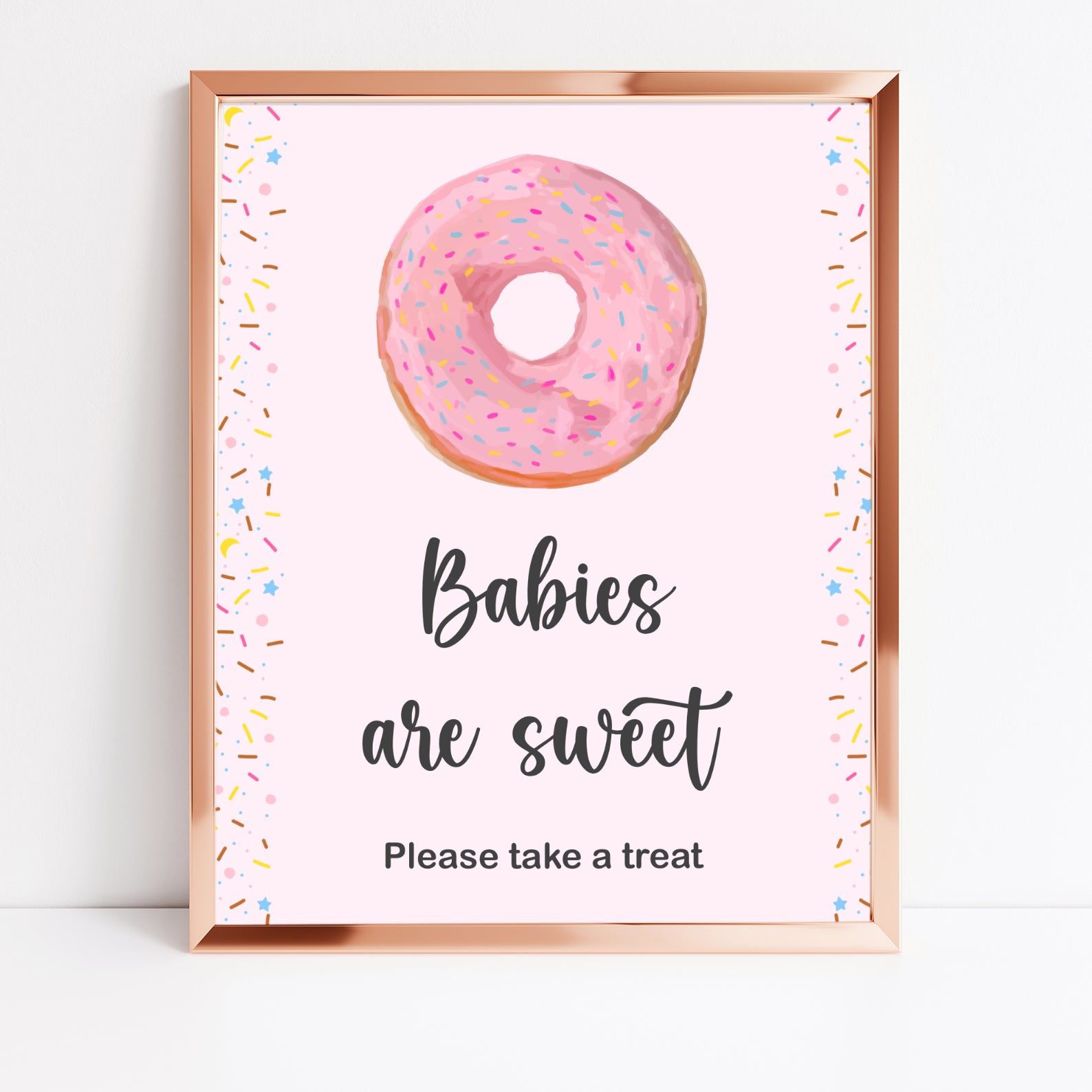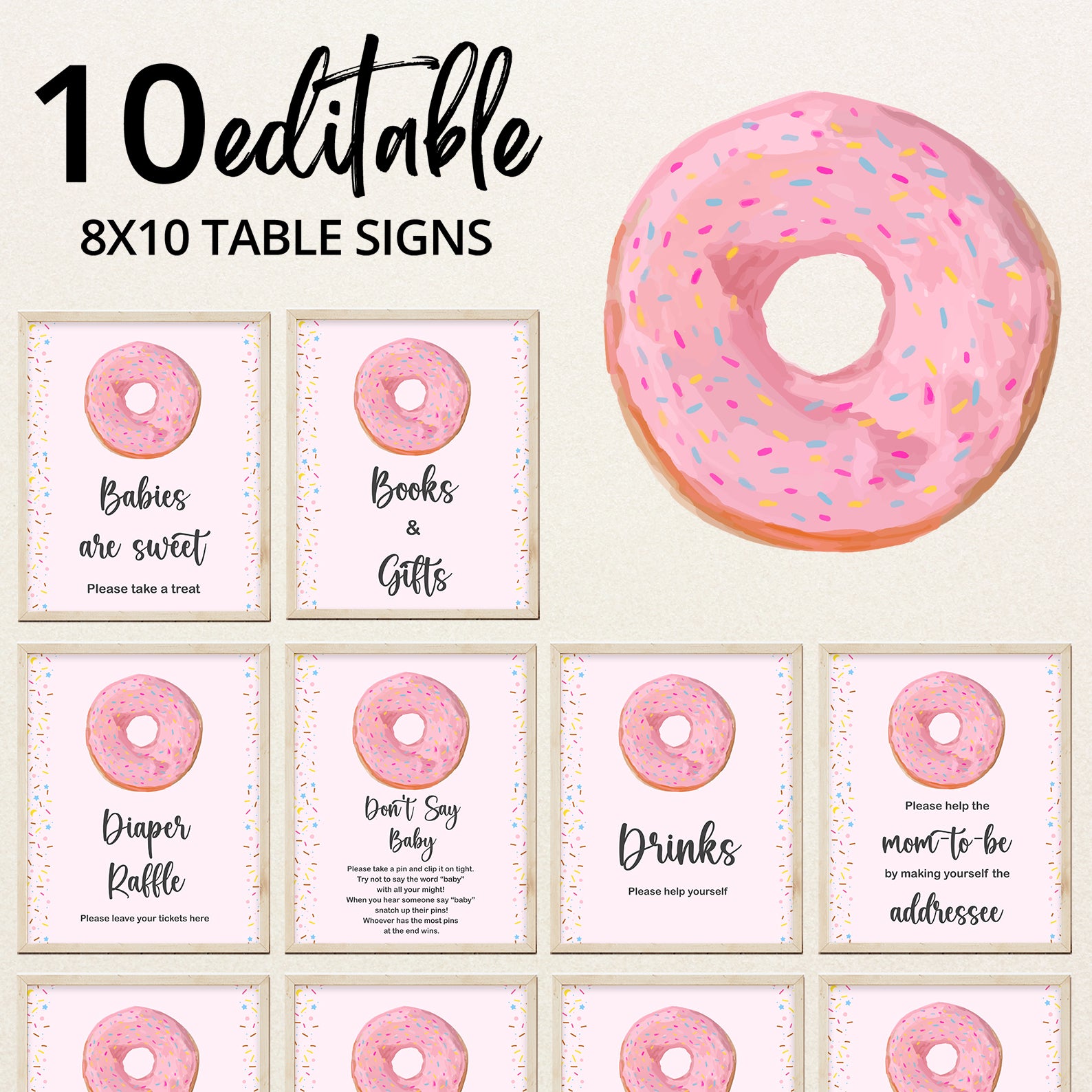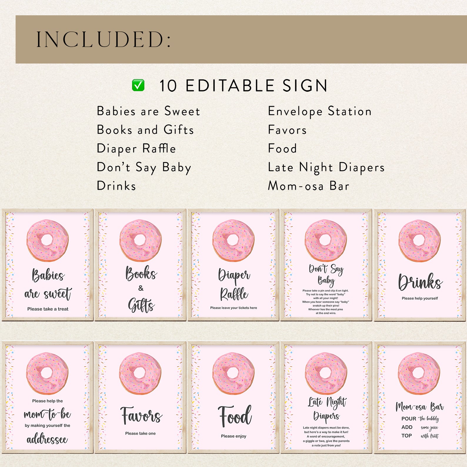 Add a sweet and festive touch to your baby shower with this set of 10 editable table signs. Featuring a pink background with a mouthwatering pink-iced donut and colorful sprinkles, each sign is designed to coordinate perfectly with your celebration. Includes Babies Are Sweet, Books and Gifts, Diaper Raffle, Don’t Say Baby, Drinks, Envelope Station, Favors, Food, Late Night Diapers, and Mom-osa Bar for a fun and organized event.