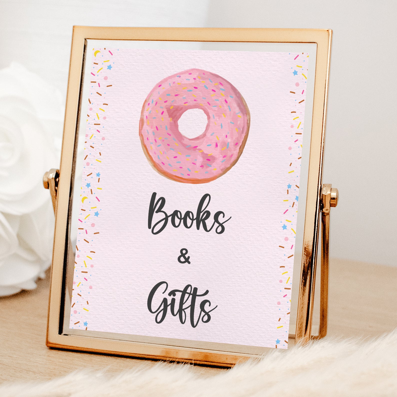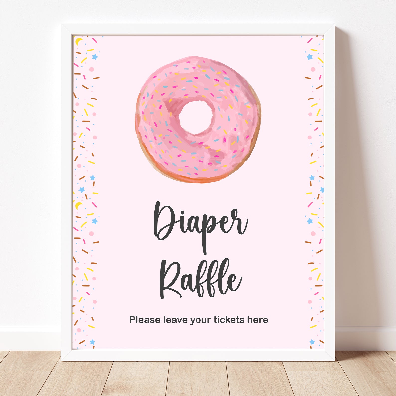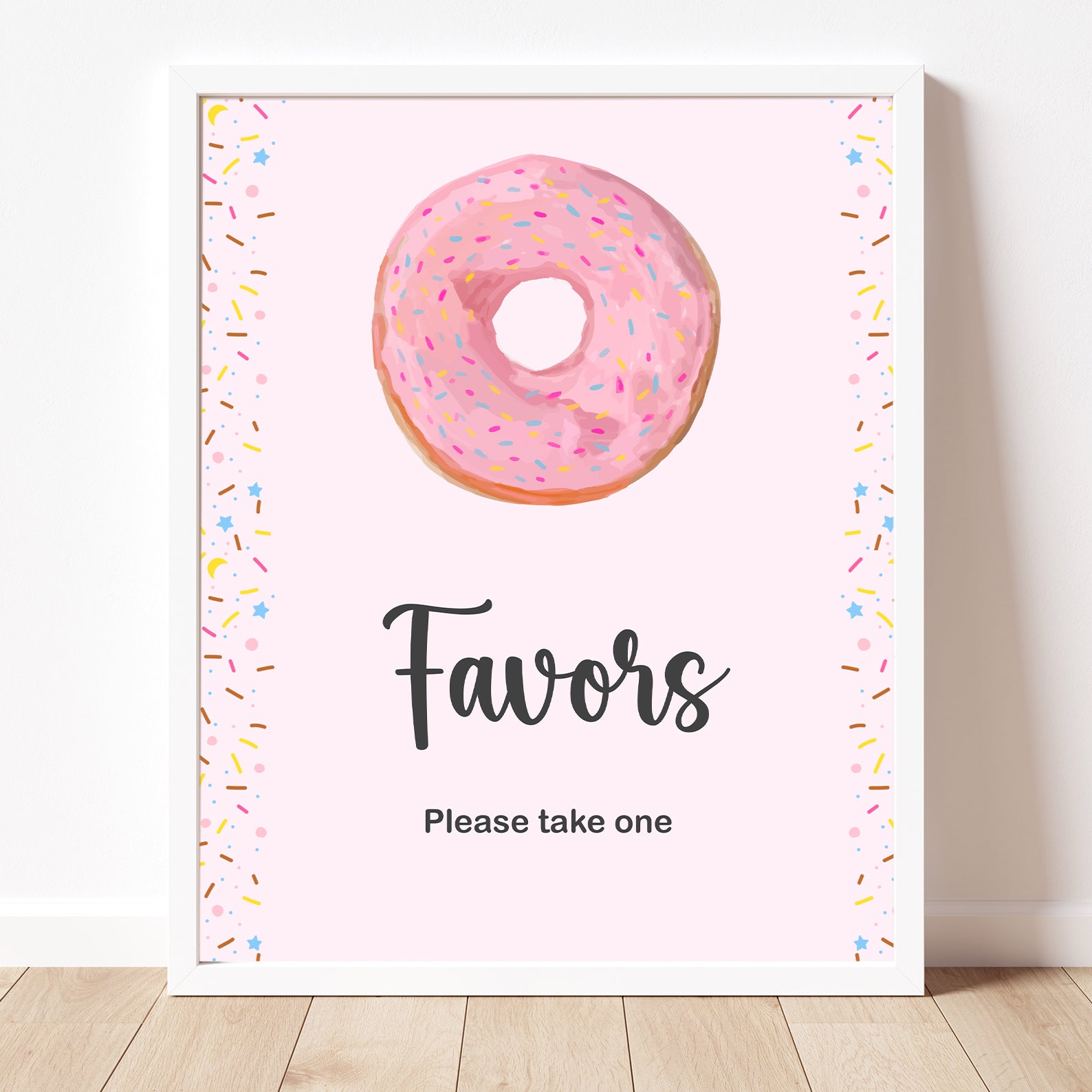 Add a sweet and festive touch to your baby shower with this set of 10 editable table signs. Featuring a pink background with a mouthwatering pink-iced donut and colorful sprinkles, each sign is designed to coordinate perfectly with your celebration. Includes Babies Are Sweet, Books and Gifts, Diaper Raffle, Don’t Say Baby, Drinks, Envelope Station, Favors, Food, Late Night Diapers, and Mom-osa Bar for a fun and organized event.