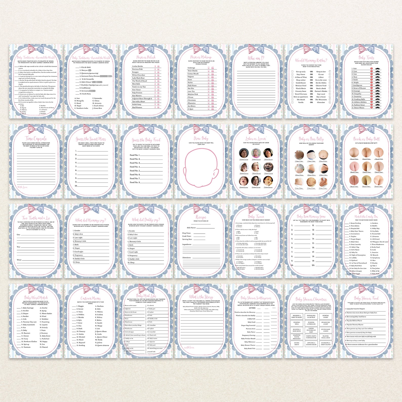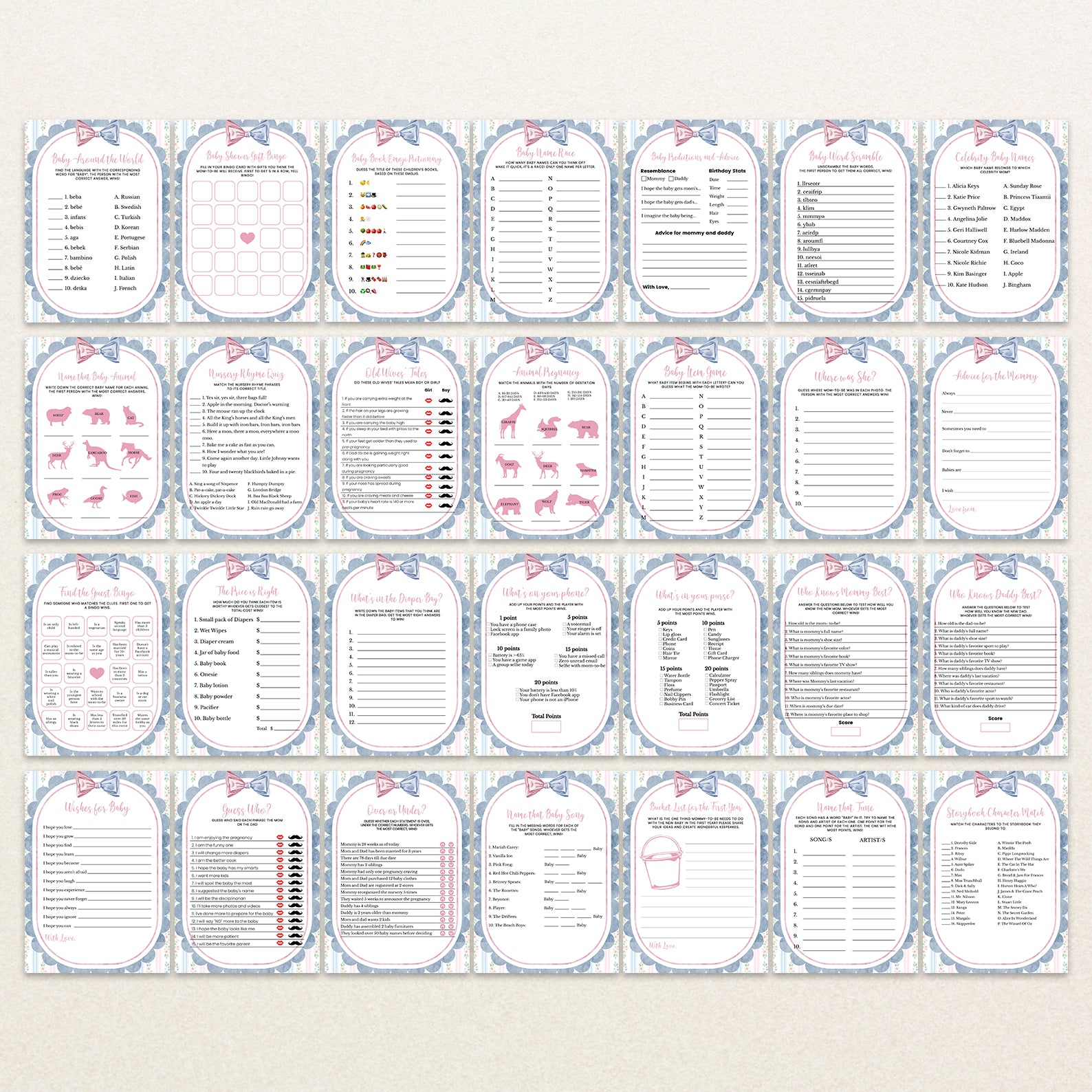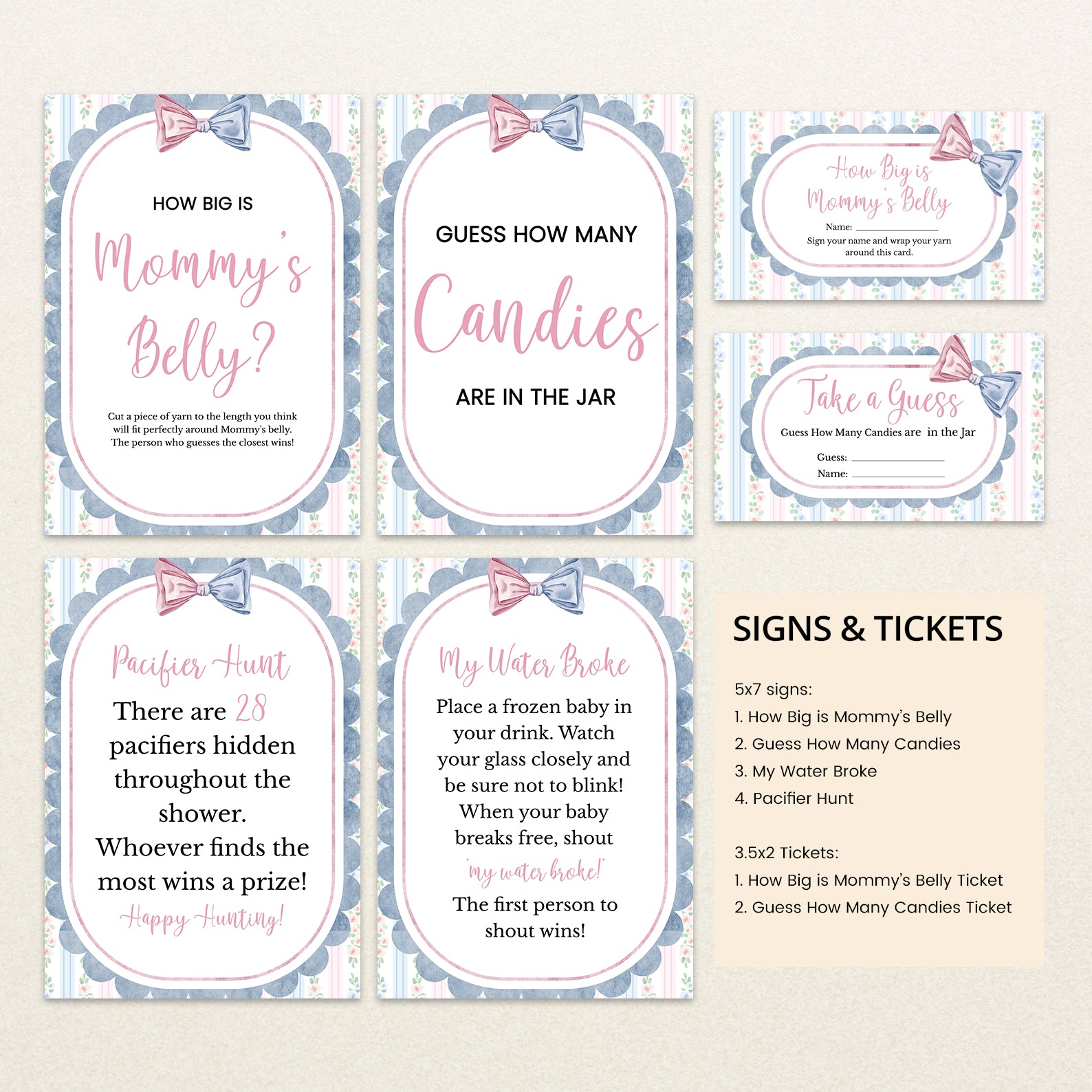 Celebrate the upcoming arrival of your little one with our charming Baby Shower Game Bundle! Featuring a delightful flower pattern and a soft blue pastel scalloped frame, this elegant set brings a sweet and stylish touch to your celebration. Adorned with playful pink and blue ribbons, it’s perfect for a gender-neutral or gender reveal theme. This bundle includes 60 editable baby shower games, making it easy to personalize and entertain your guests. Add fun, flair, and a cohesive design to your special day with this beautifully coordinated set!