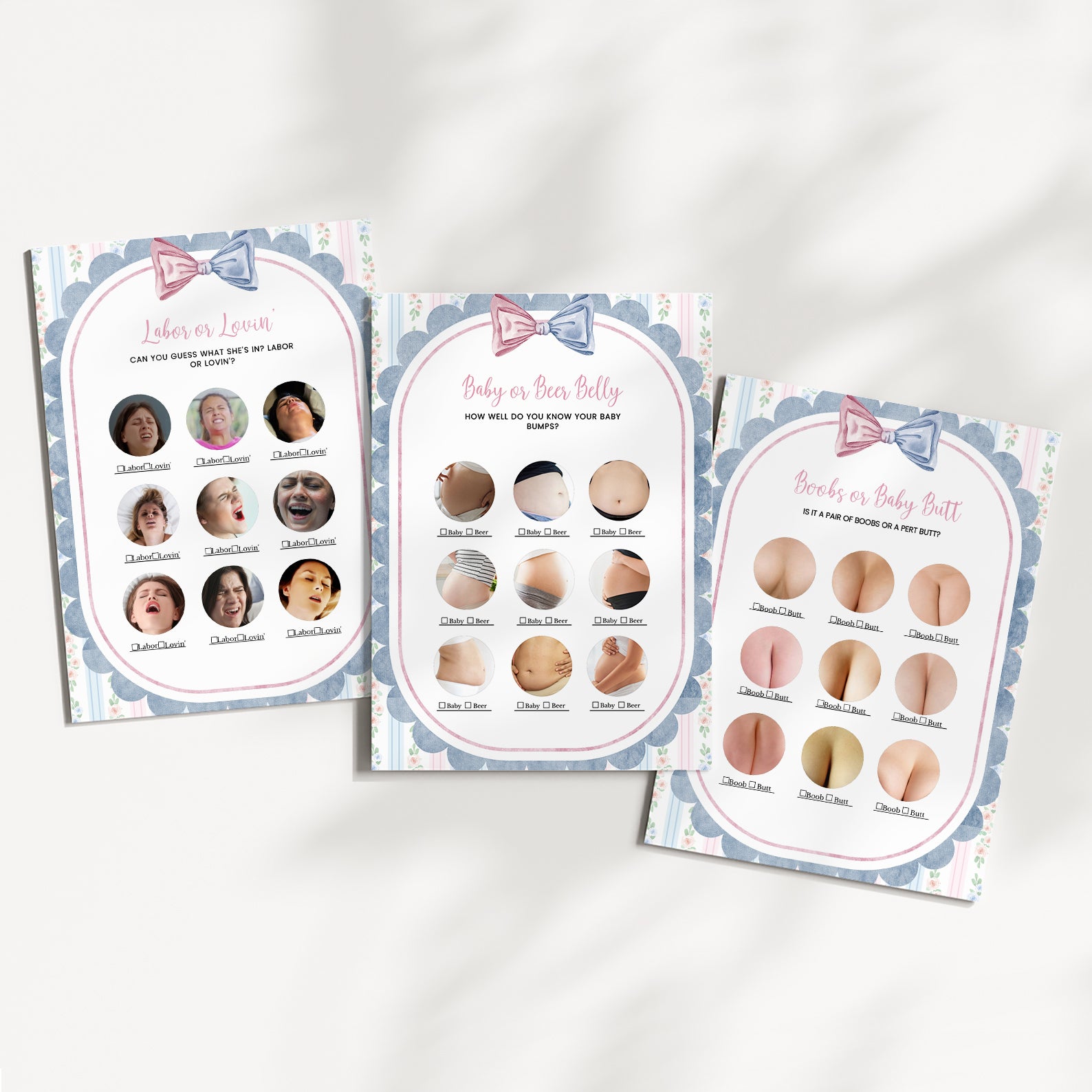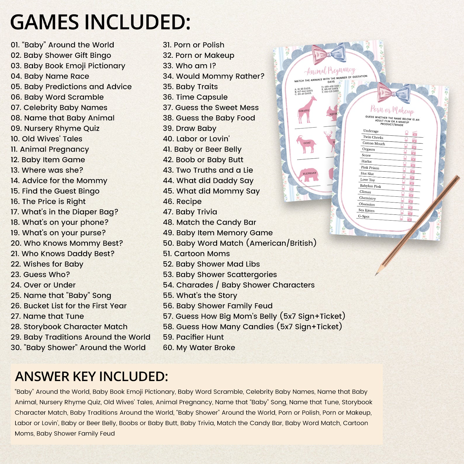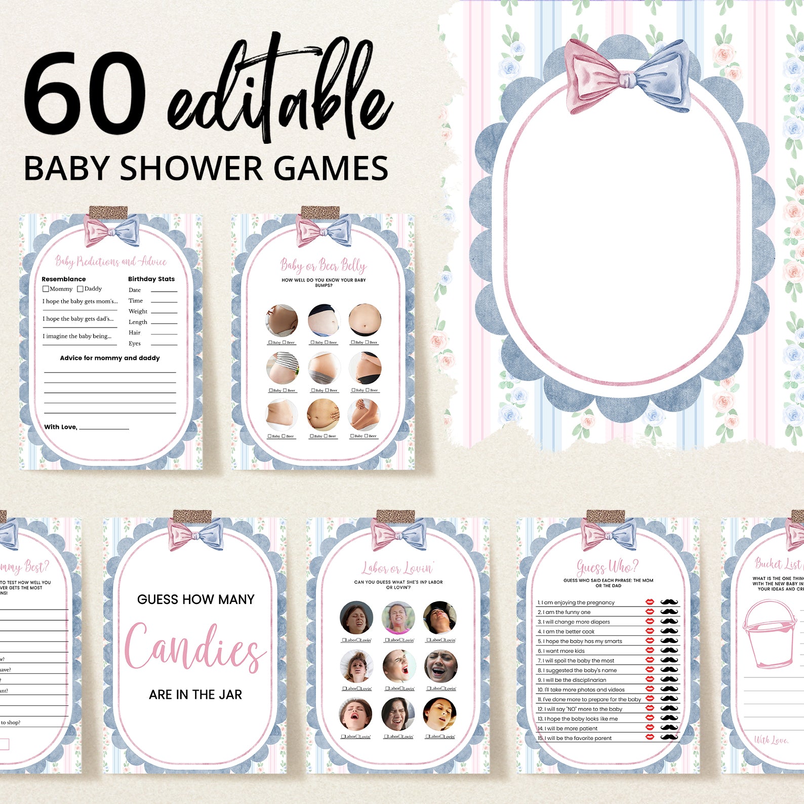 Celebrate the upcoming arrival of your little one with our charming Baby Shower Game Bundle! Featuring a delightful flower pattern and a soft blue pastel scalloped frame, this elegant set brings a sweet and stylish touch to your celebration. Adorned with playful pink and blue ribbons, it’s perfect for a gender-neutral or gender reveal theme. This bundle includes 60 editable baby shower games, making it easy to personalize and entertain your guests. Add fun, flair, and a cohesive design to your special day with this beautifully coordinated set!