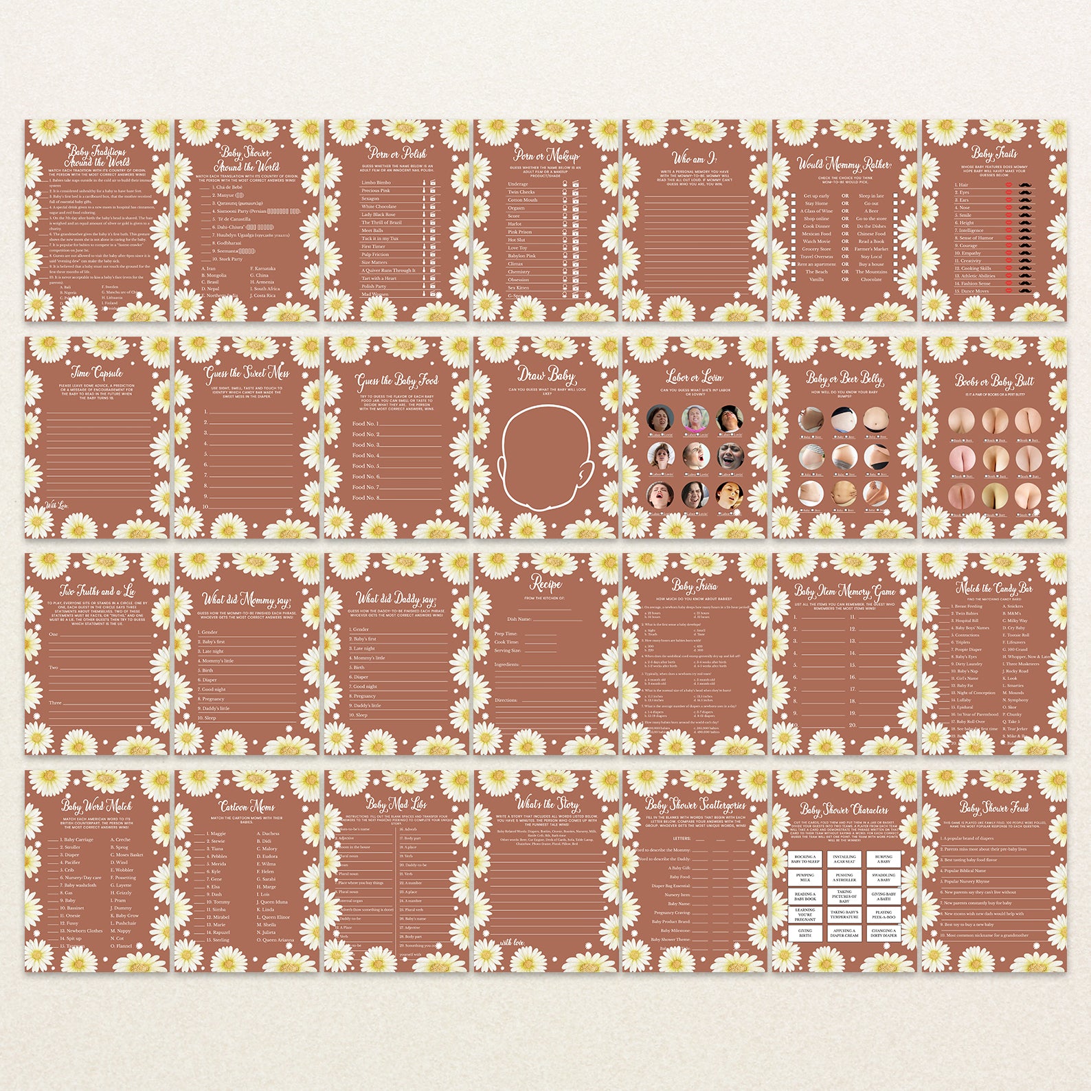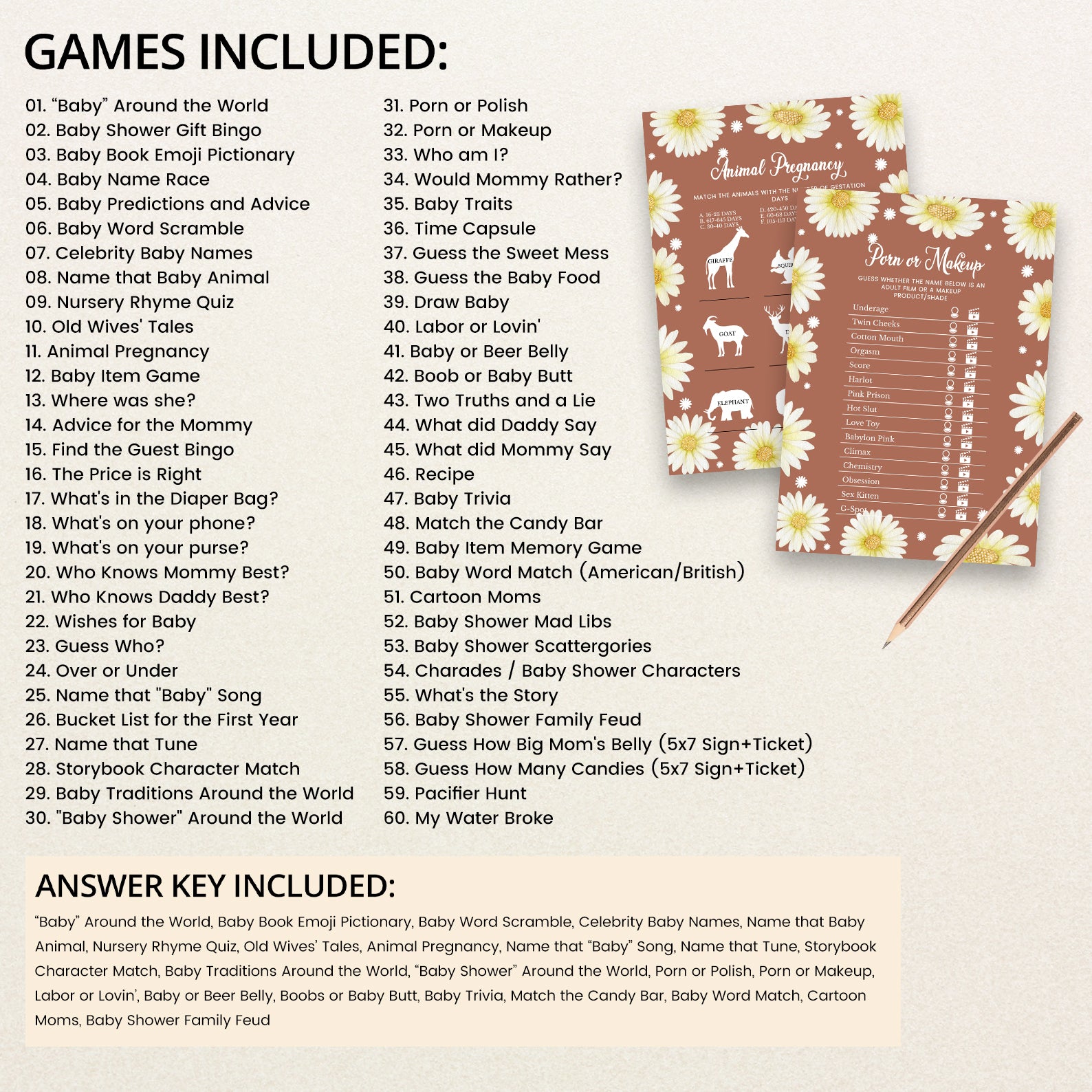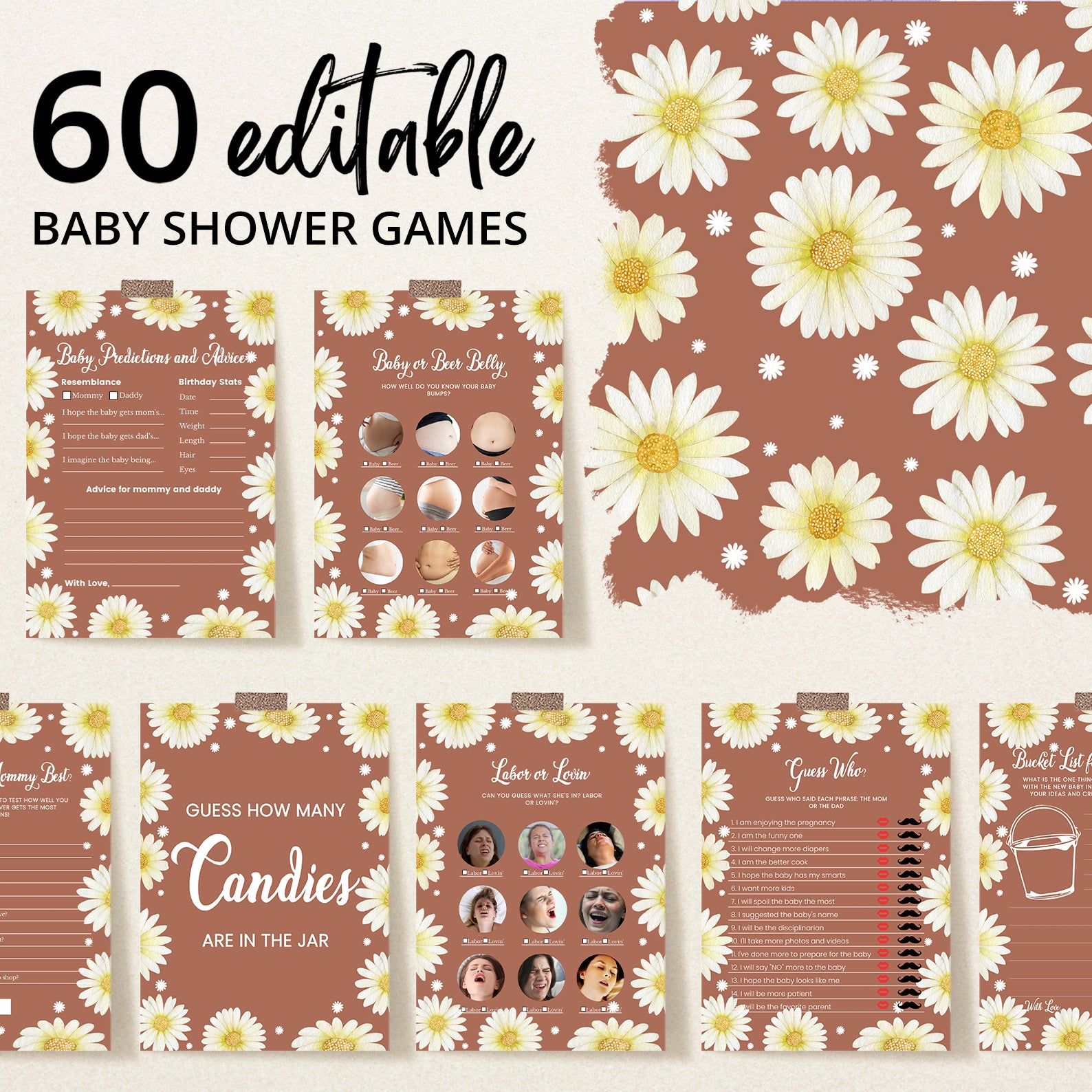 Keep guests entertained with this charming bundle of 60 editable baby shower games! Designed to complement a daisy-themed celebration, each game features soft white florals on a cozy brown background. Perfect for a rustic summer gathering. From classics like Baby Bingo to fun quizzes and word games, this bundle makes it easy to create joyful memories. Fully customizable to match your event’s style.