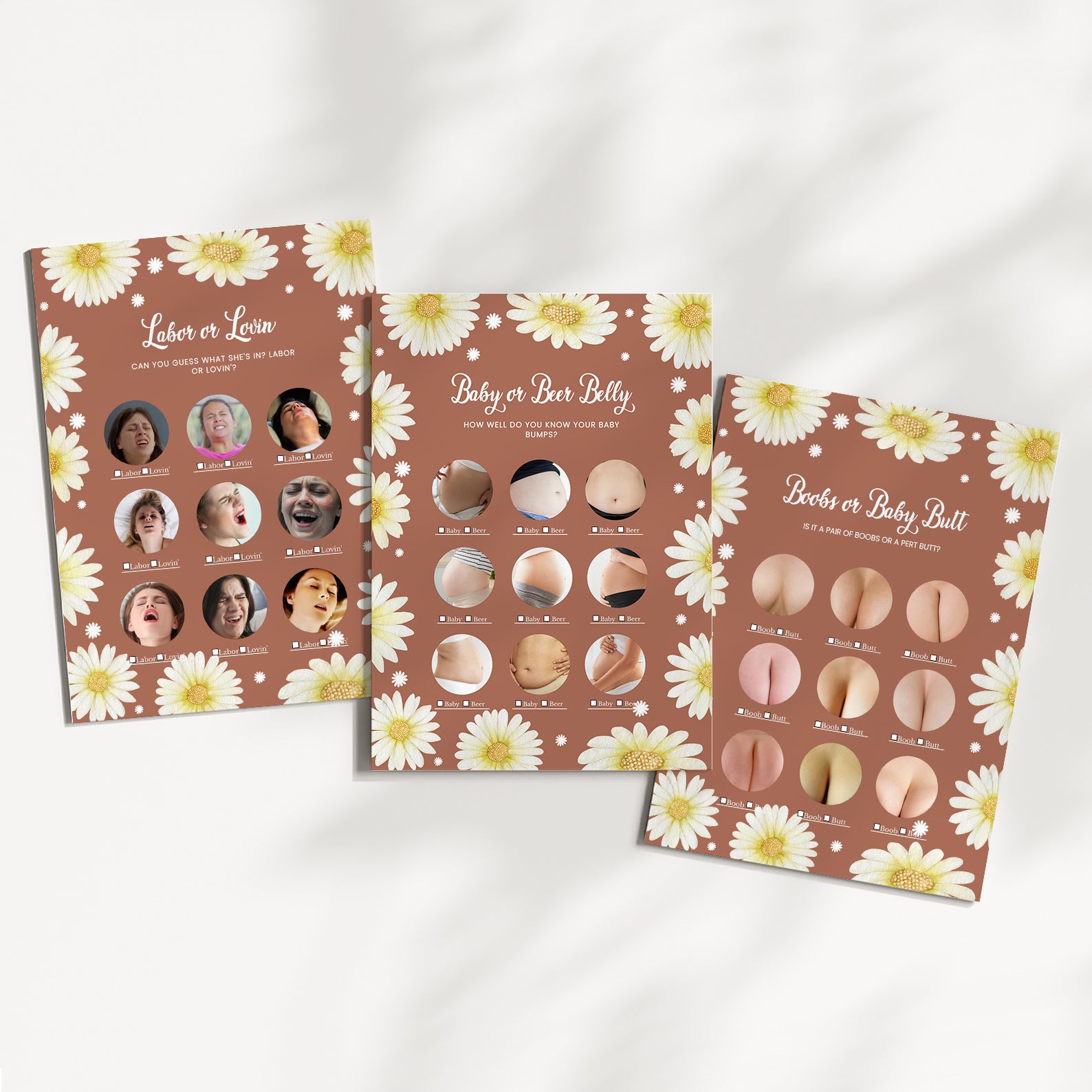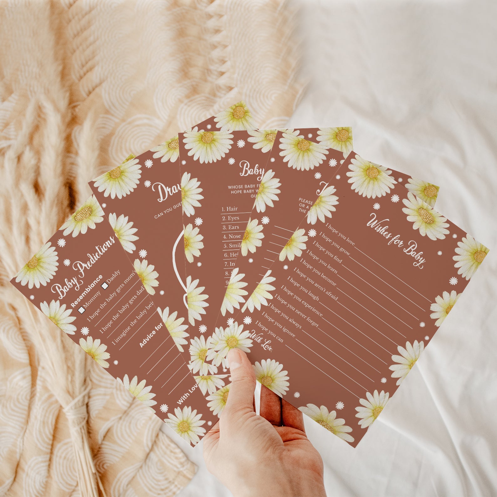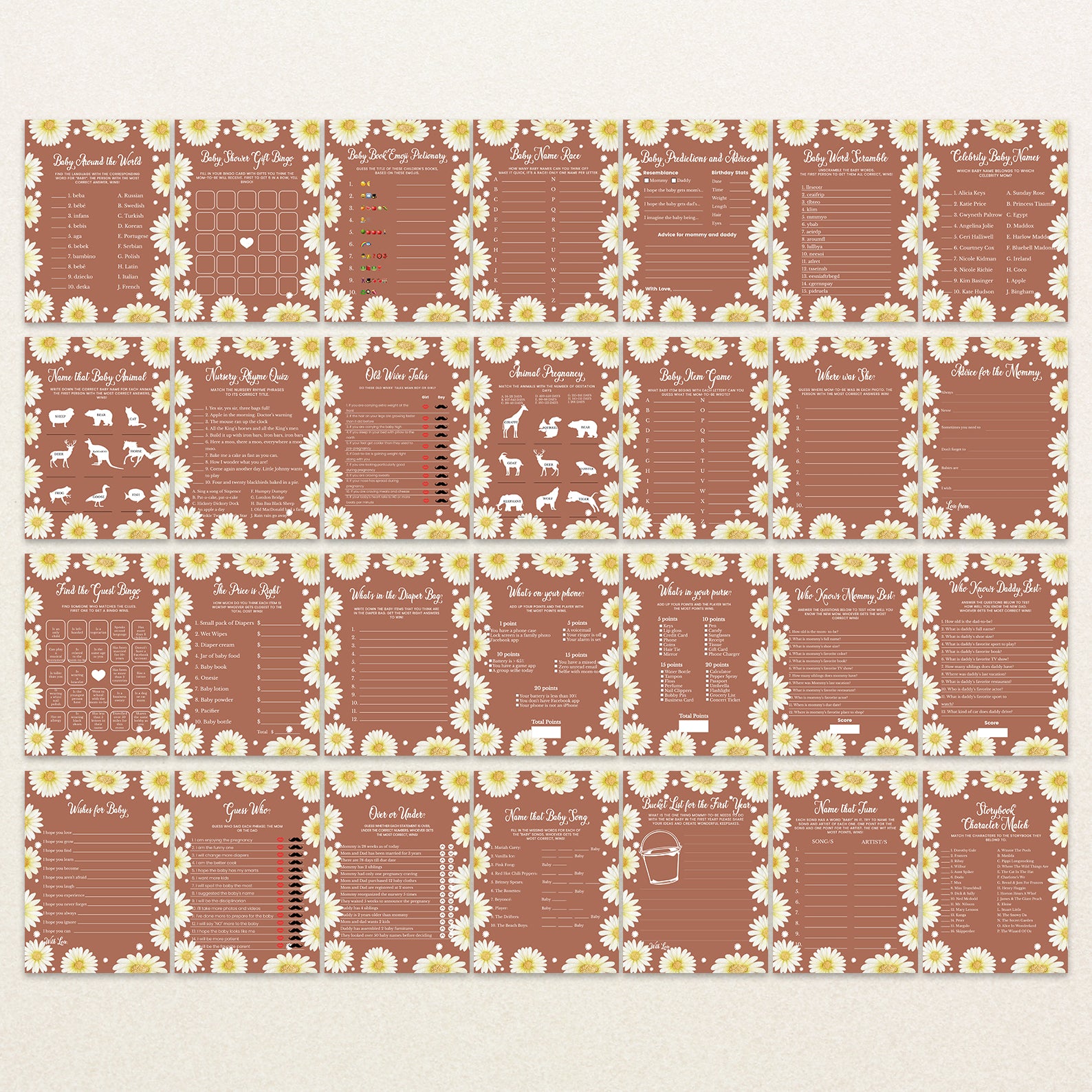 Keep guests entertained with this charming bundle of 60 editable baby shower games! Designed to complement a daisy-themed celebration, each game features soft white florals on a cozy brown background. Perfect for a rustic summer gathering. From classics like Baby Bingo to fun quizzes and word games, this bundle makes it easy to create joyful memories. Fully customizable to match your event’s style.