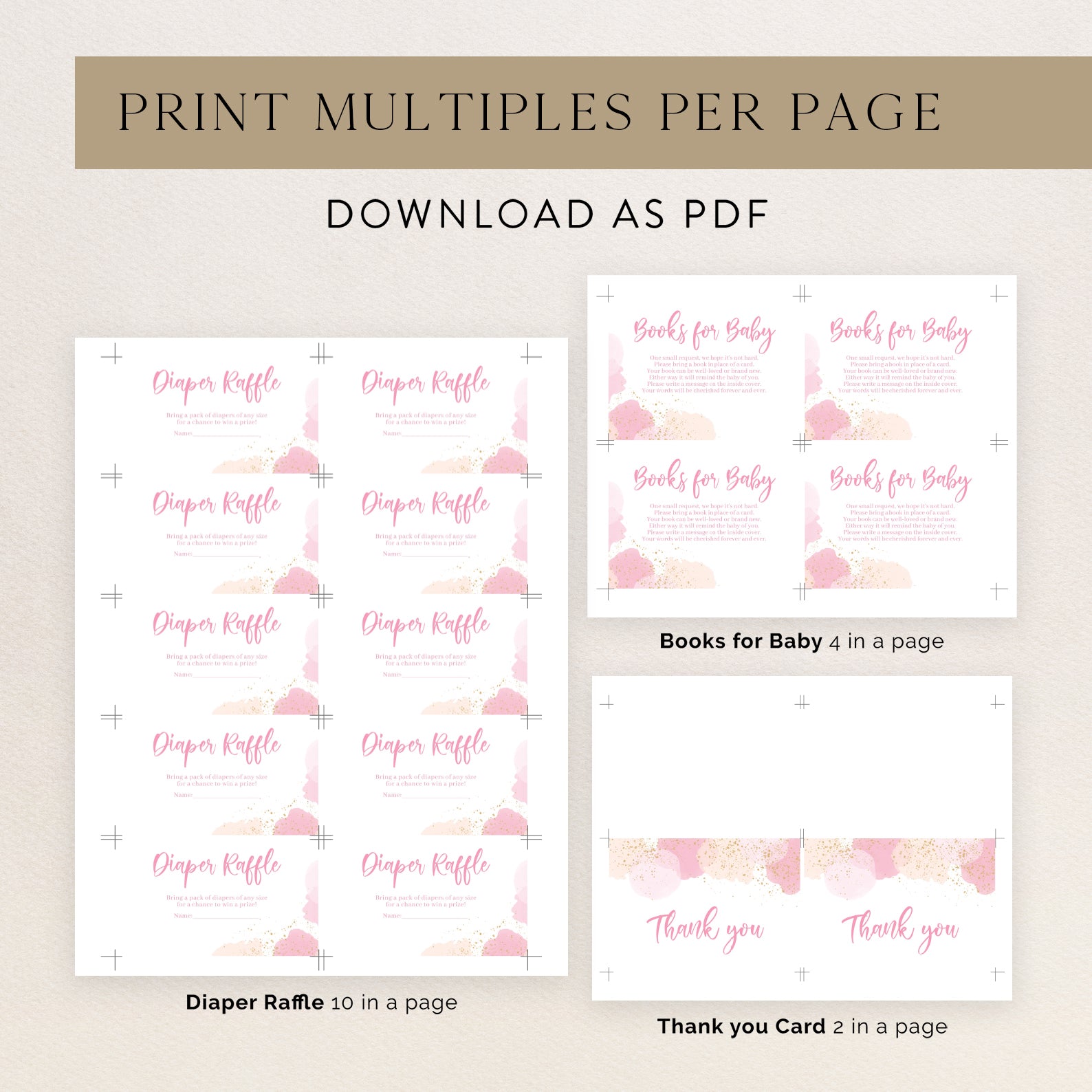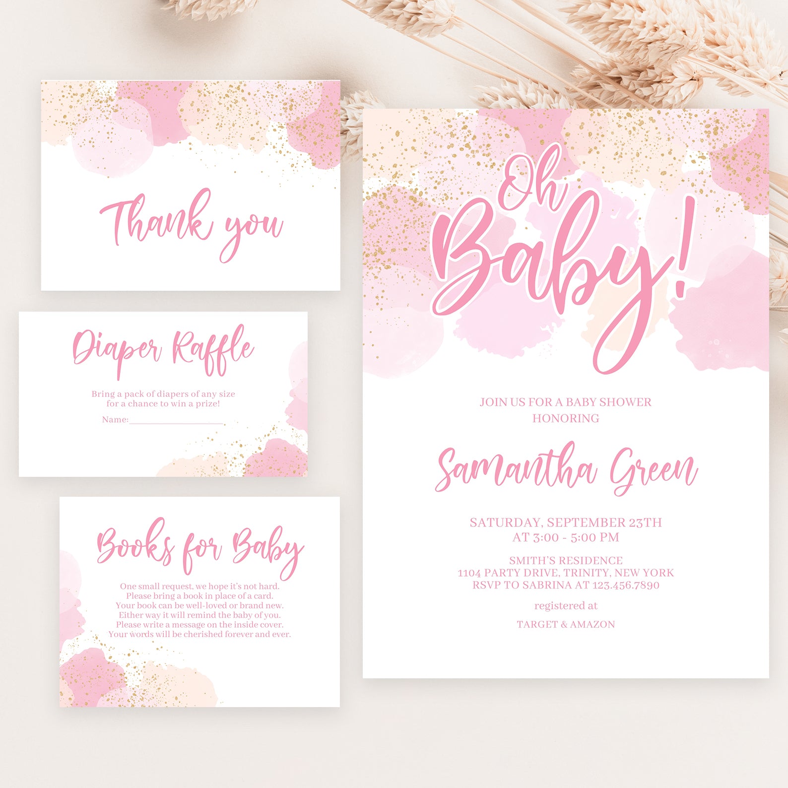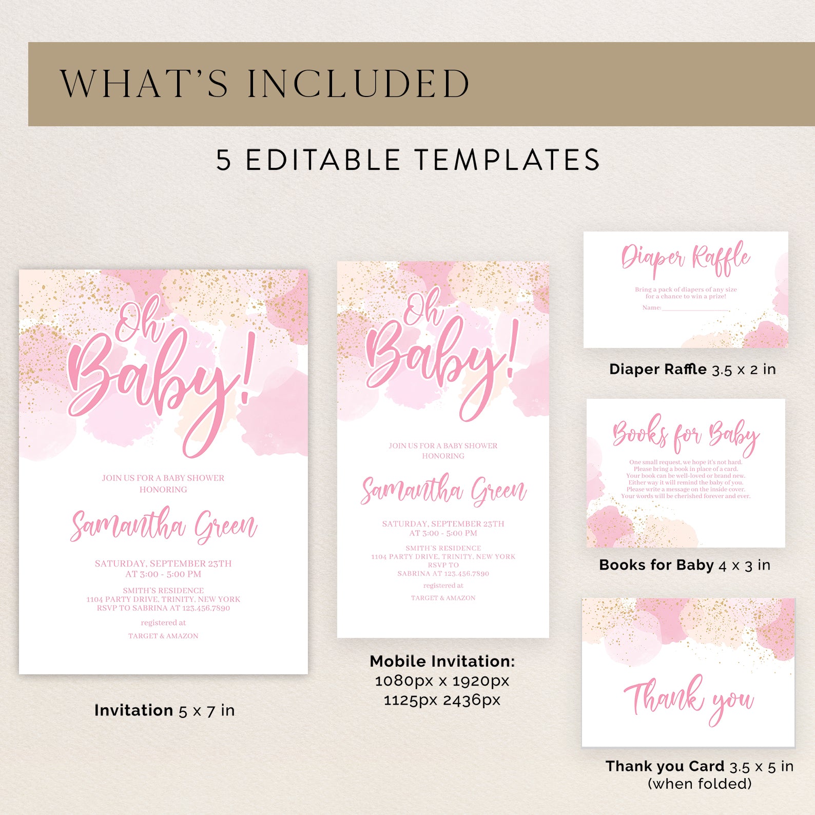 Celebrate your baby girl in style with this "Oh Baby" pink invitation bundle! Featuring soft pink watercolor splashes and elegant gold accents, this suite includes a main invitation, mobile version, diaper raffle card, books for baby insert, and a thank you card. It’s fully editable and easy to personalize—perfect for creating a coordinated and charming baby shower experience.