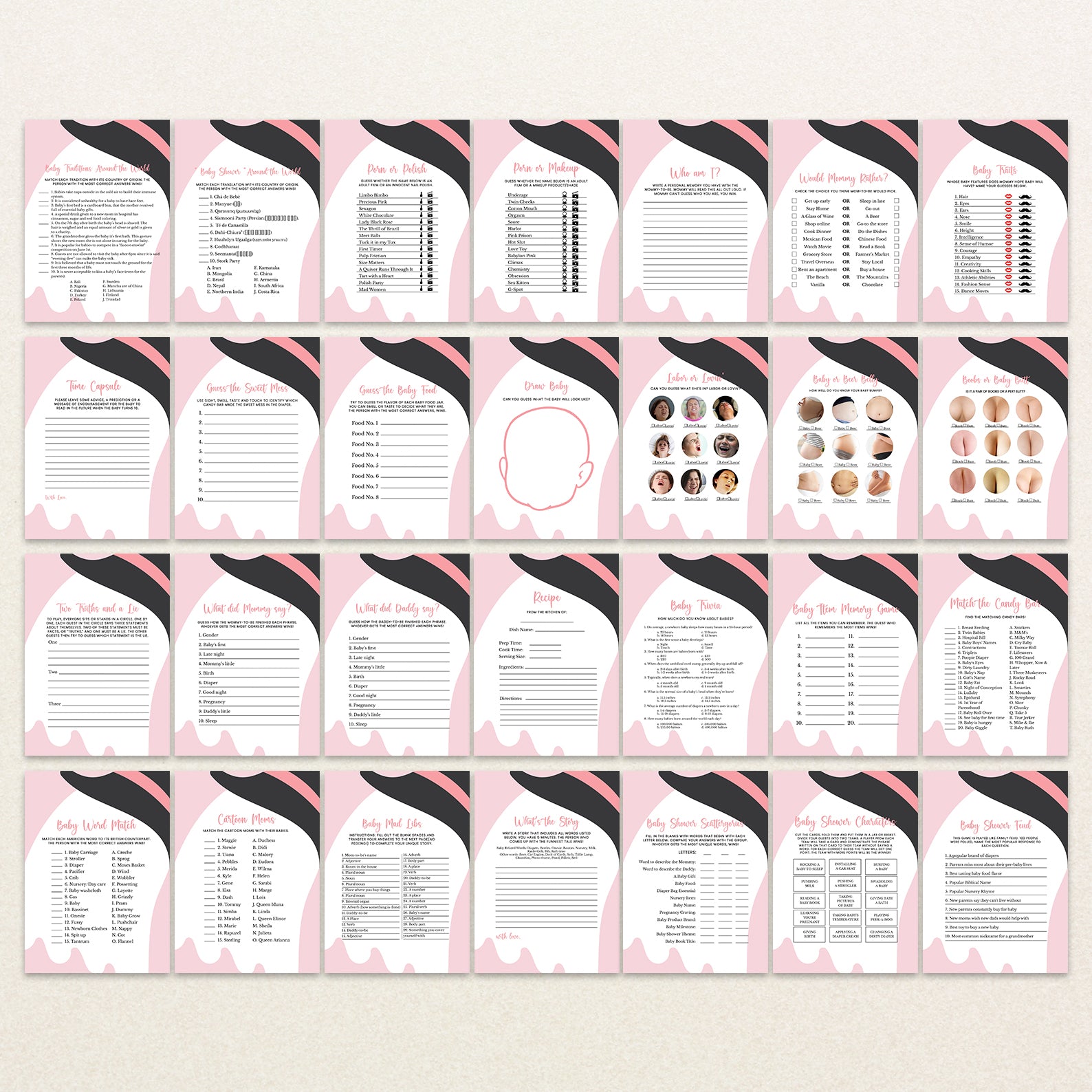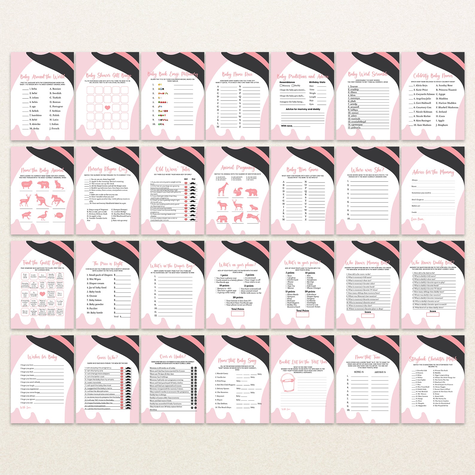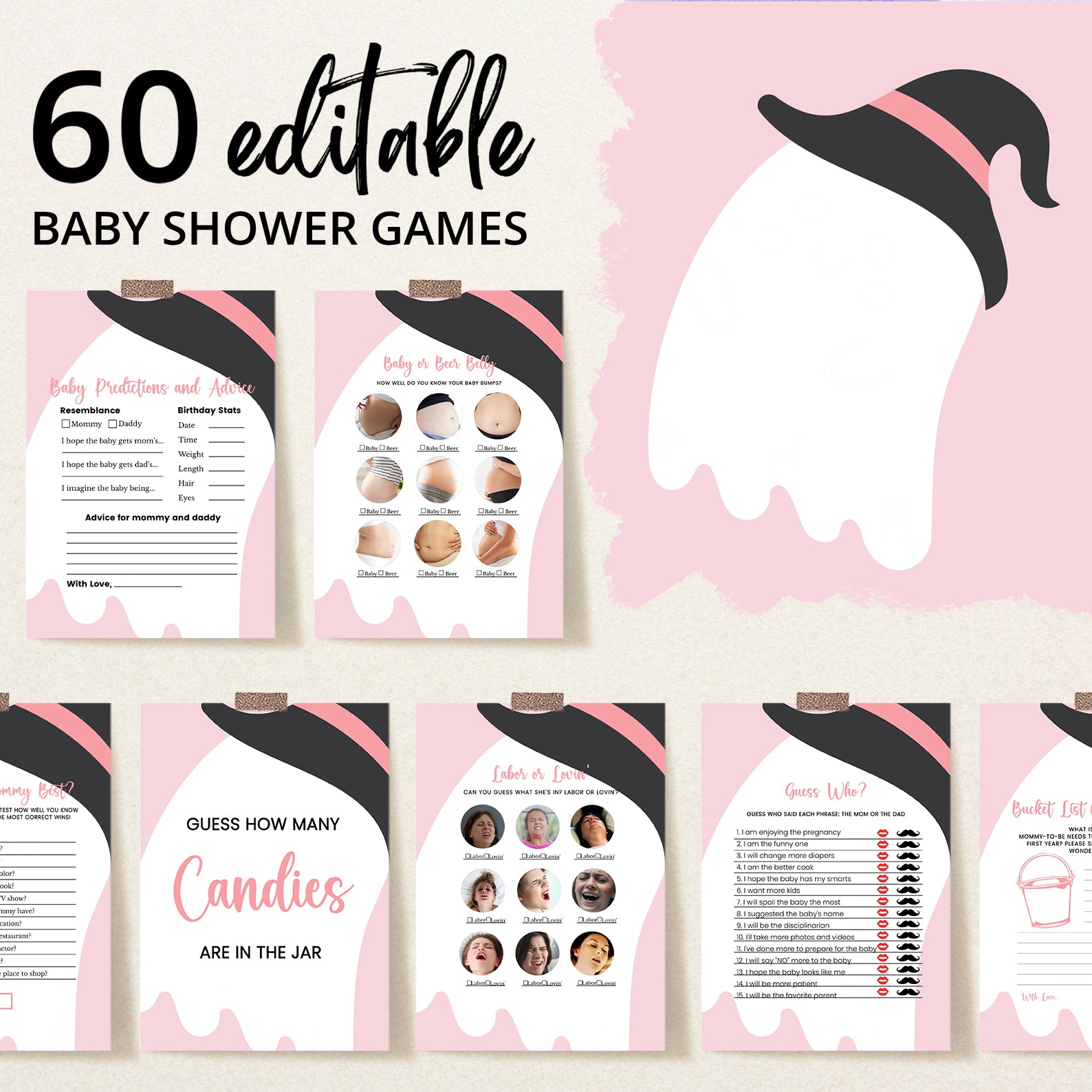 Bring extra fun to your Halloween baby shower with this bundle of 60 editable baby shower games! Featuring a charming pink theme with playful Halloween touches—like a sweet ghost in a black and pink witch hat—these printable games are both festive and easy to customize. From classics like Baby Bingo to fun icebreakers, this set adds spooky charm and interactive joy to your little boo’s celebration.