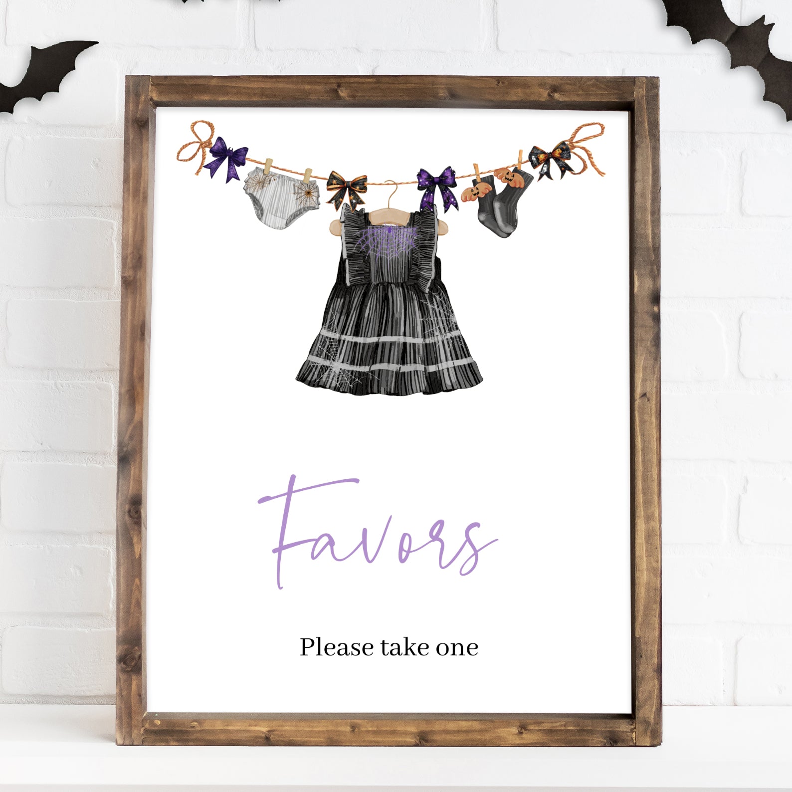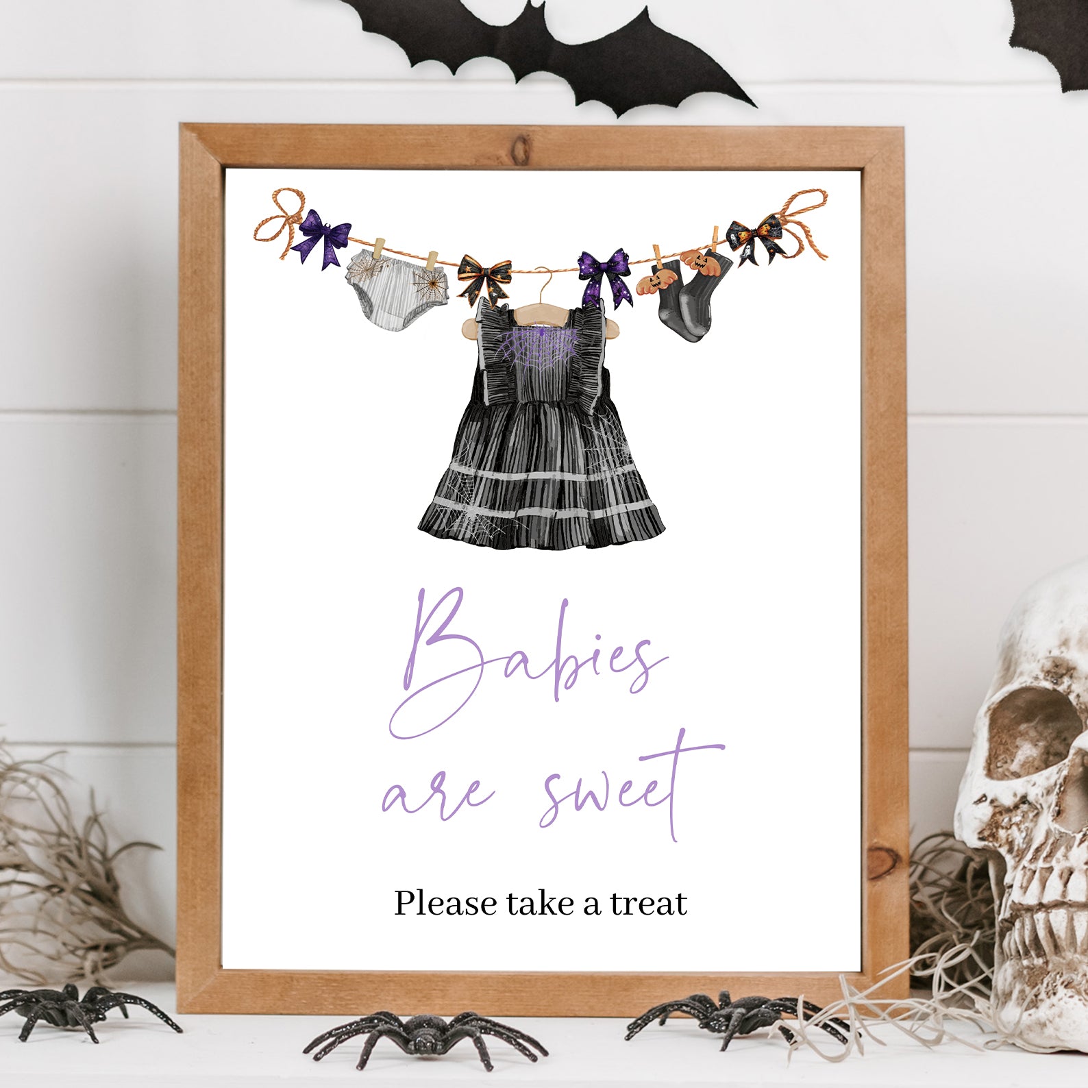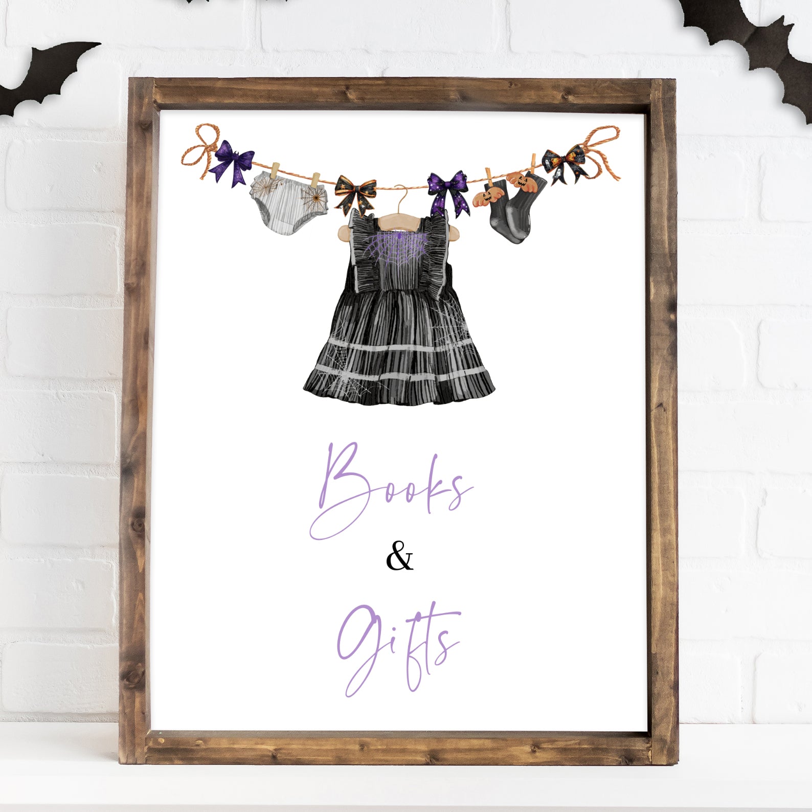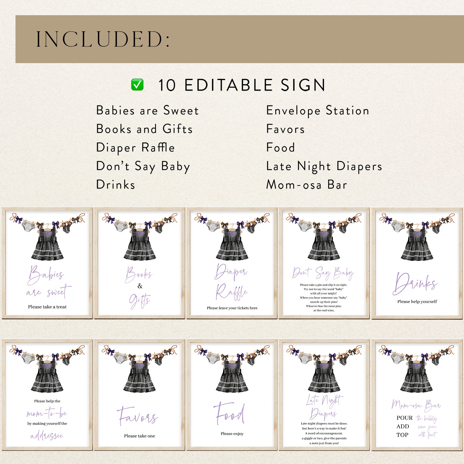 Add a spooky-sweet touch to your baby shower with this set of 10 editable Halloween table signs! Featuring a charming purple theme, playful orange and purple ribbons, and adorable baby clothes with spooky details like spider webs and jack-o’-lantern socks, each sign adds festive flair to your setup. Includes signs for Babies Are Sweet, Books and Gifts, Diaper Raffle, Don’t Say Baby, Drinks, Envelope Station, Favors, Food, Late Night Diapers, and Mom-osa Bar.