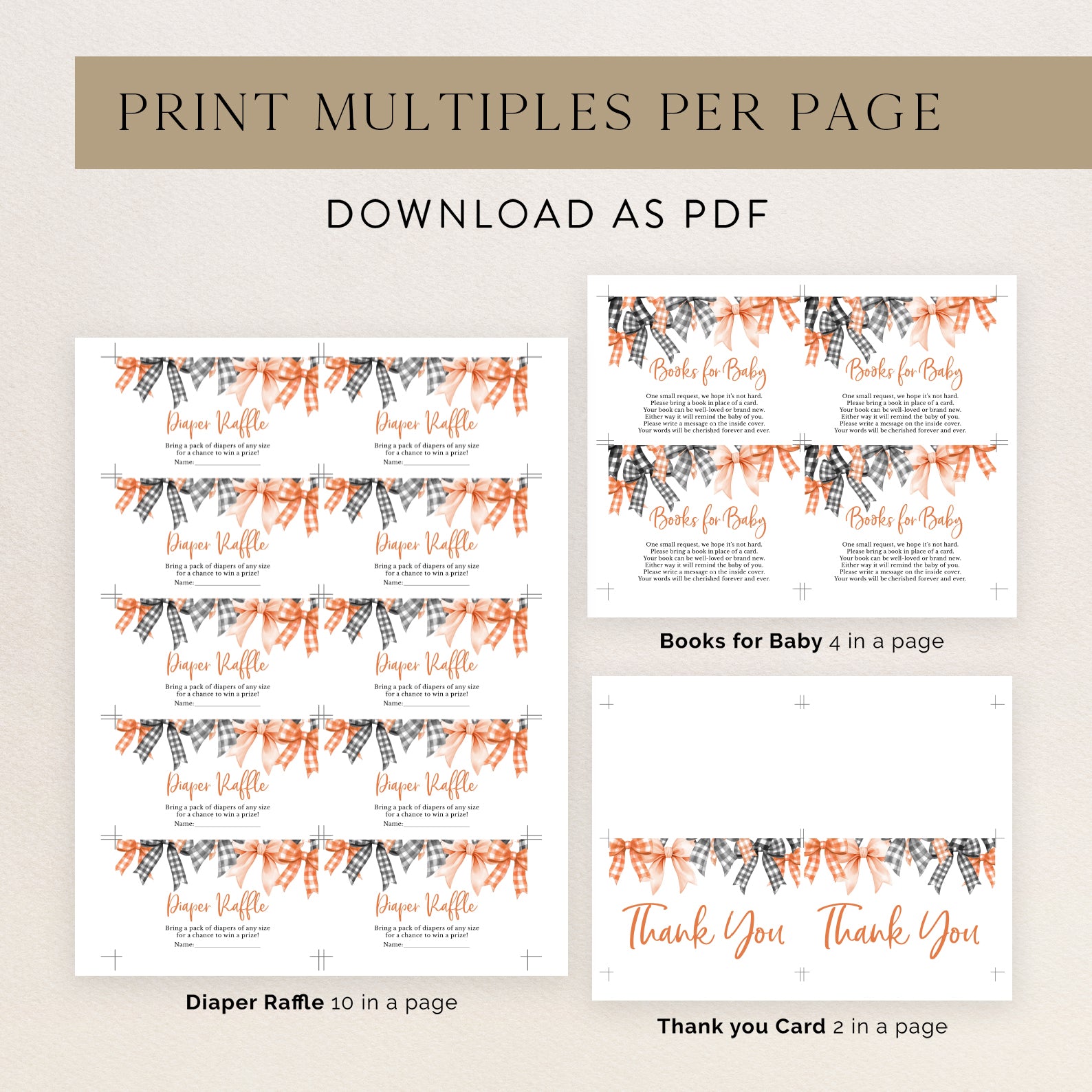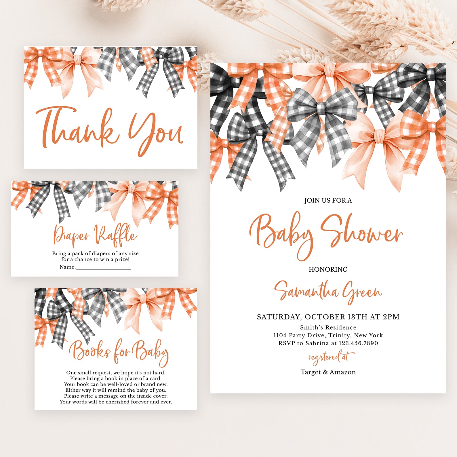 Celebrate your baby shower in style with this orange and black invitation bundle! Featuring classic bow ribbons in plain and plaid patterns, this set includes a digital invite, mobile version, diaper raffle card, books for baby card, and a thank you card everything you need for a cohesive and charming celebration.