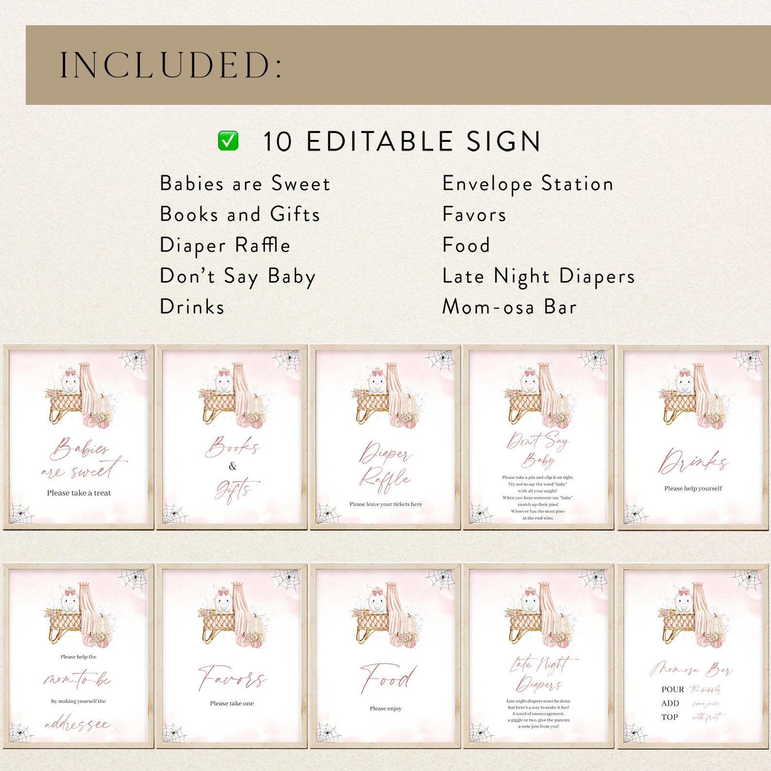 Celebrate your little one’s upcoming arrival with this set of ten editable baby shower table signs, designed with a soft pastel pink Halloween theme. Each sign features delicate details like charming pink and peach pumpkins, whimsical spider webs, and subtle floral accents. The set includes essentials like Babies Are Sweet, Diaper Raffle, Drinks, and Mom-osa Bar signs—perfect for creating a coordinated, festive atmosphere for your boo-tiful celebration.