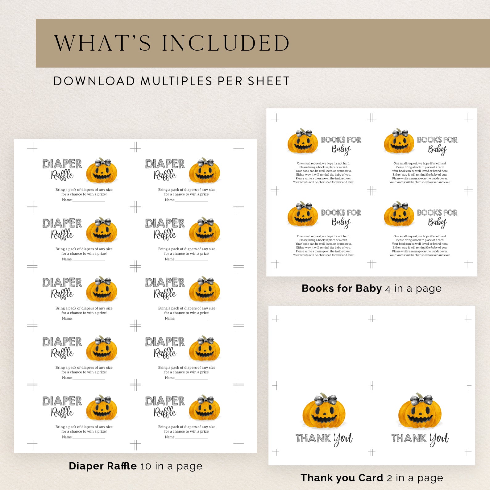 Celebrate your little boo with this spooky-sweet Halloween baby shower bundle! Featuring a festive pumpkin topped with a black skull bow, this design sets a playful yet eerie tone. The bundle includes a printable invitation, mobile invite, diaper raffle, books for baby card, and thank you card—everything you need to create a cohesive and memorable celebration.